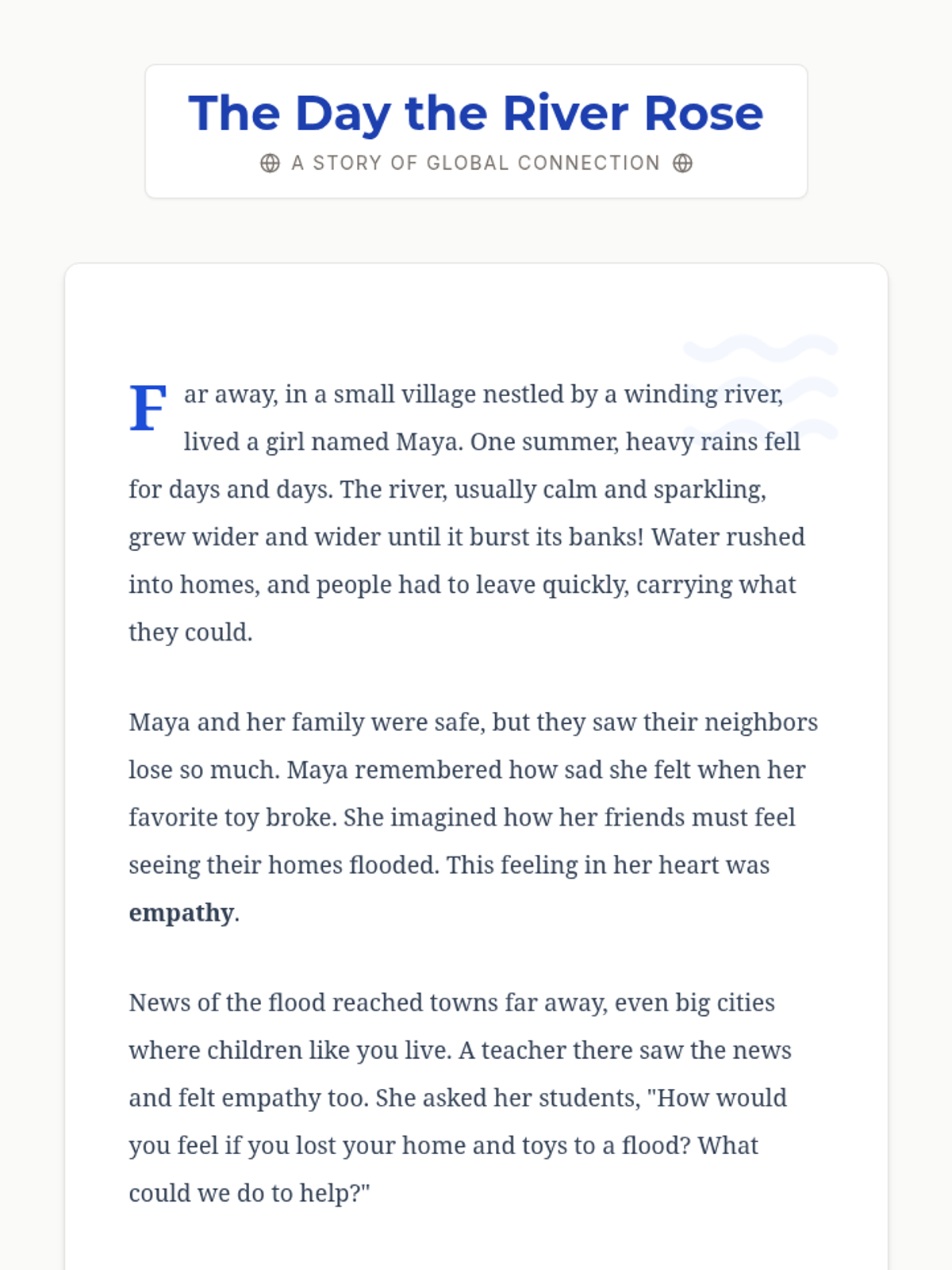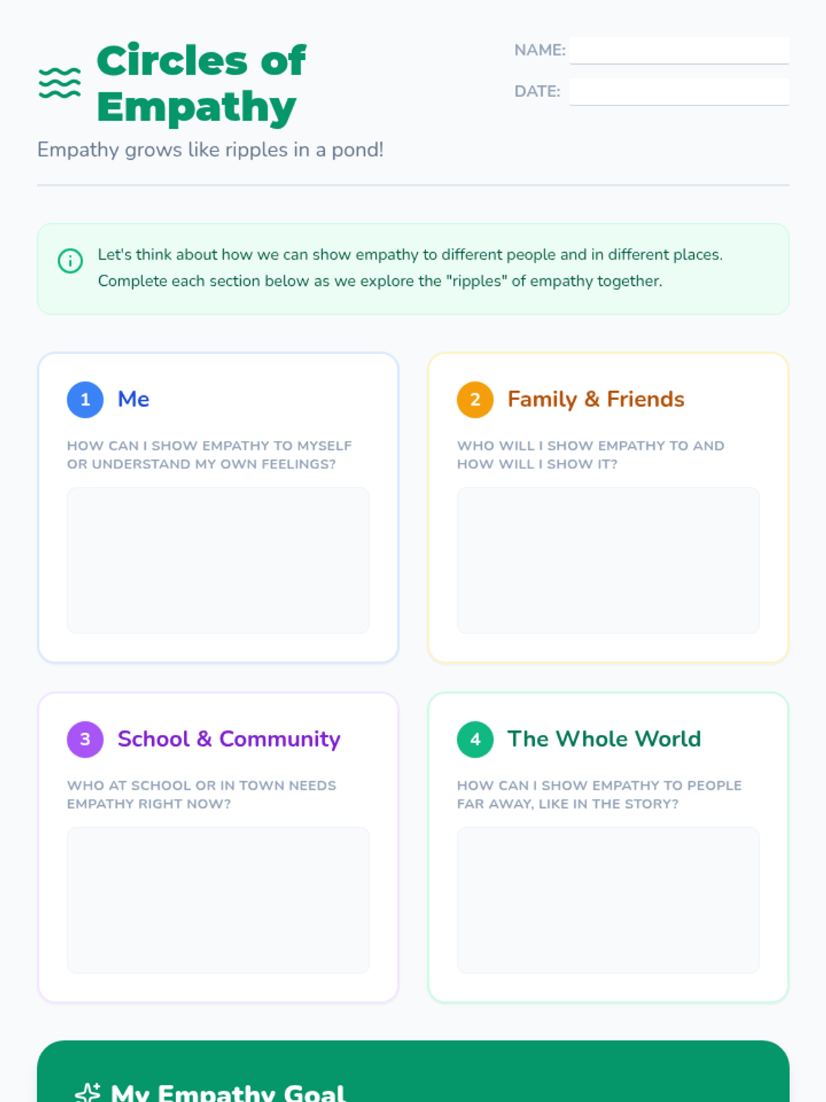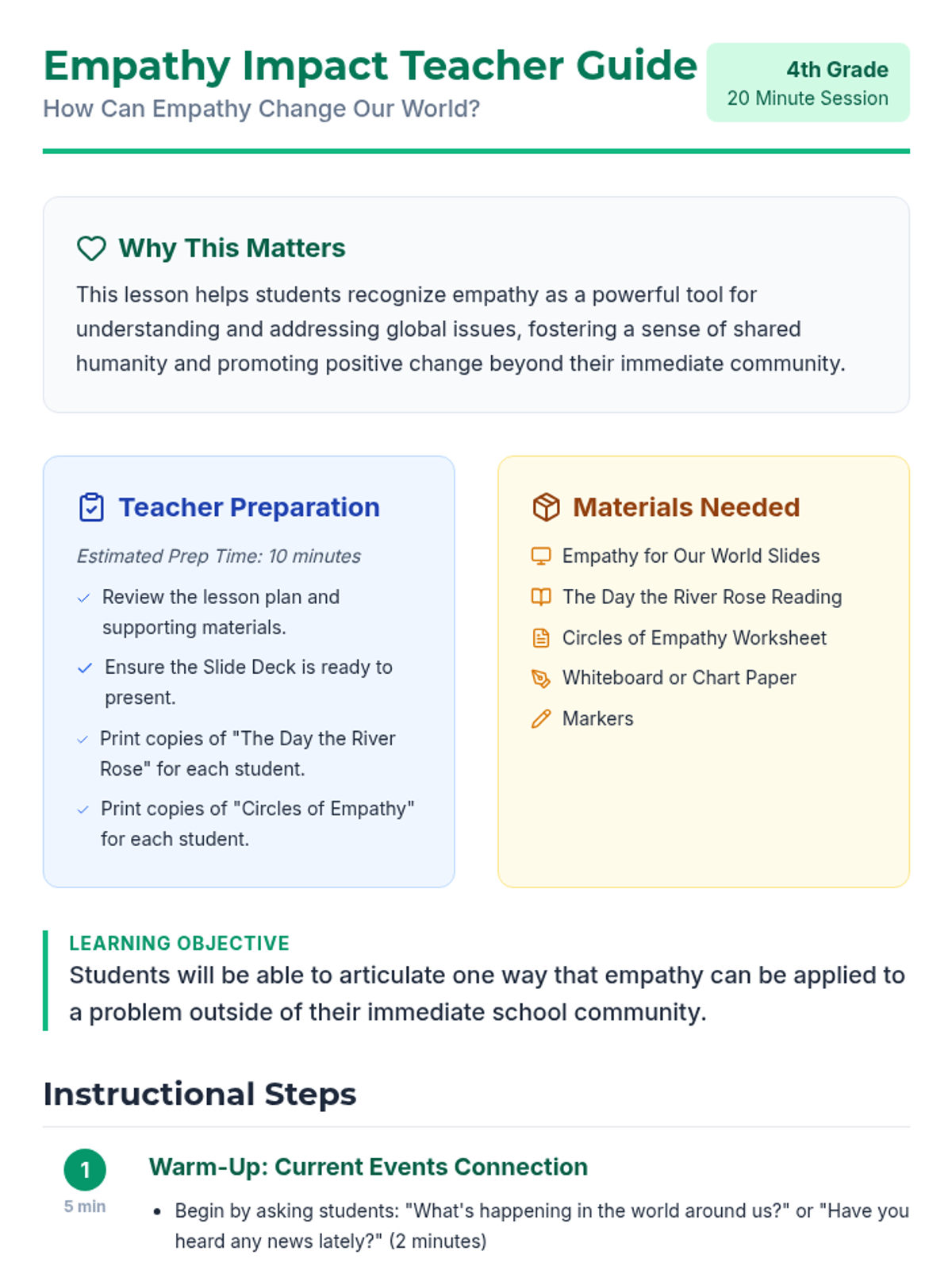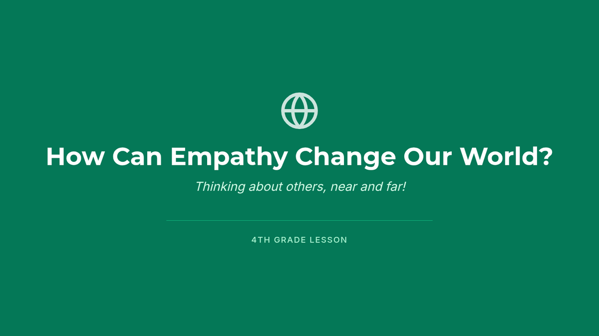 This lesson helps 4th-grade students understand how empathy can be applied to real-world problems beyond their immediate community. It emphasizes shared humanity and empowers students to see empathy as a tool for positive change.