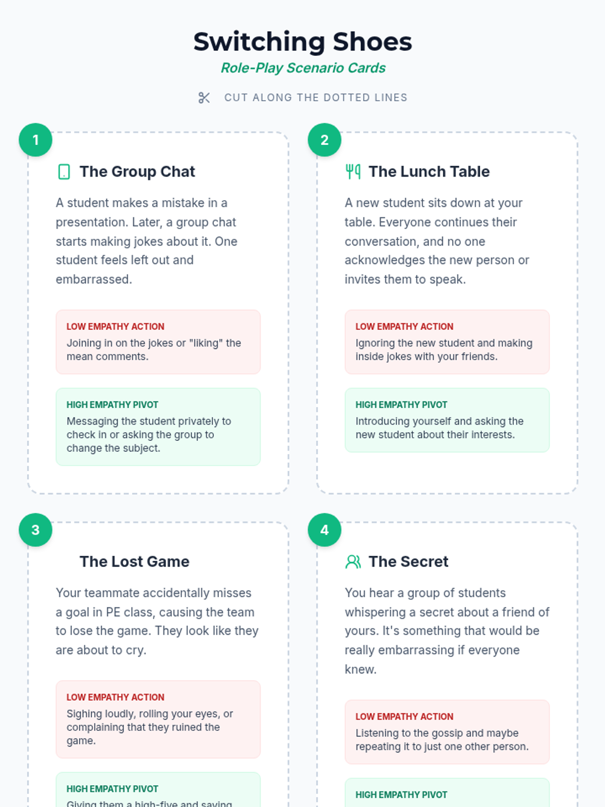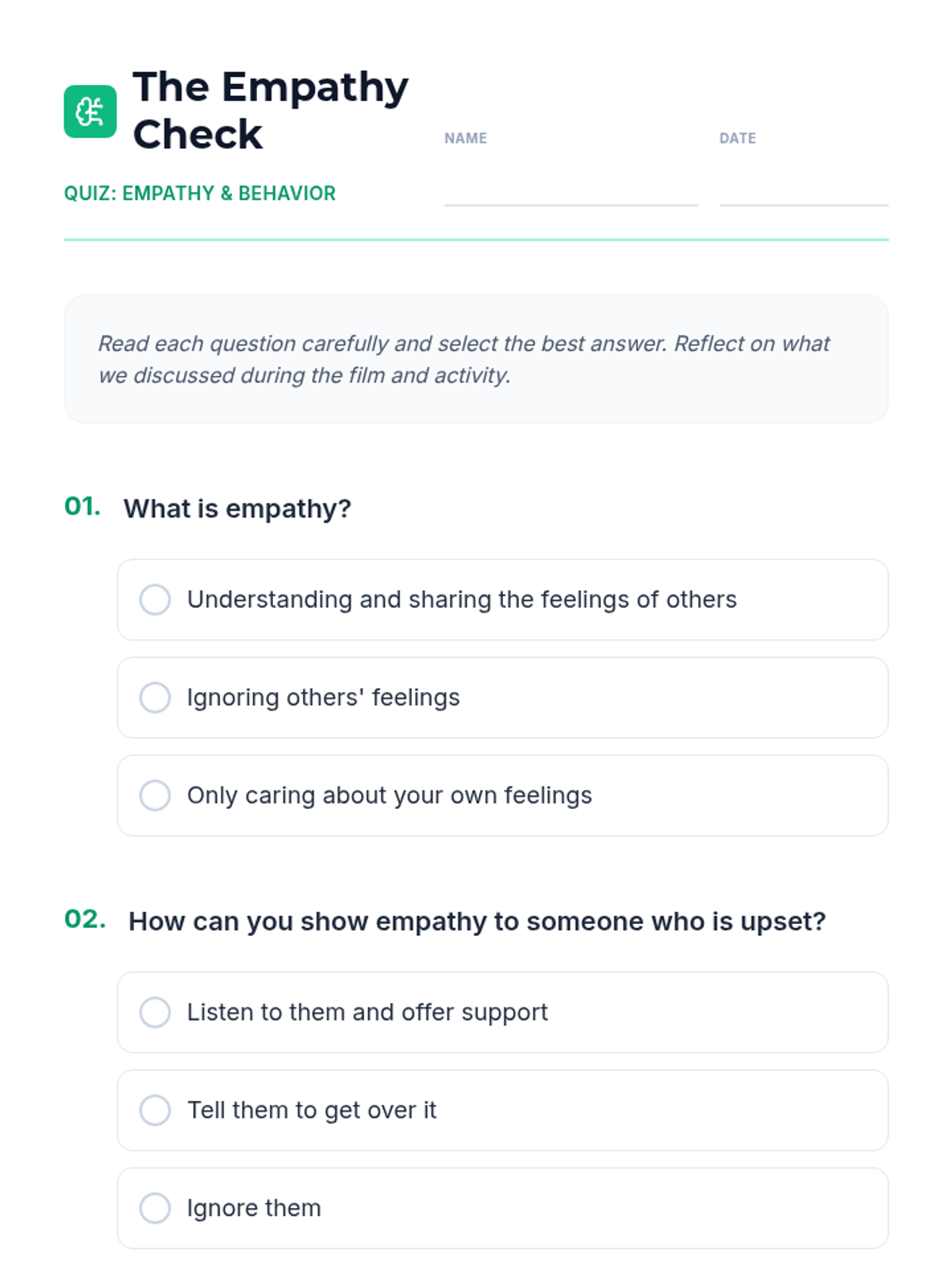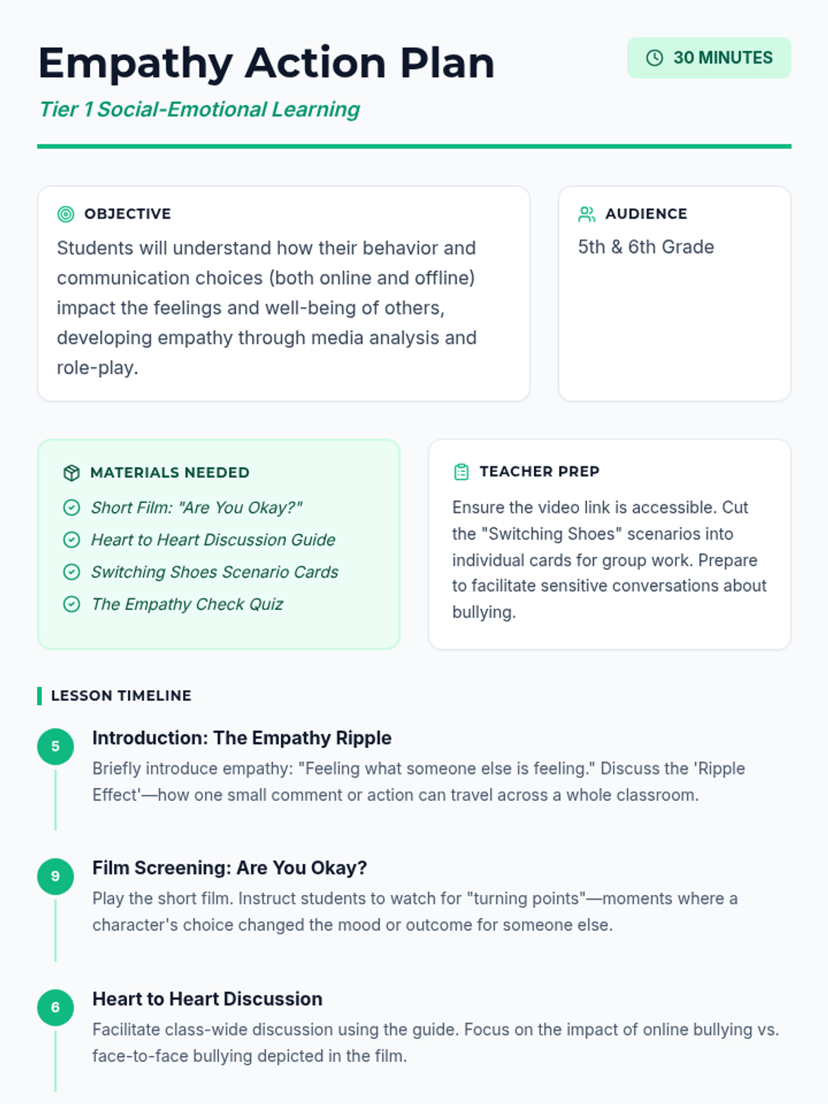 A 30-minute lesson for 5th and 6th graders exploring the impact of behavior on others through film, discussion, and role-play. Students will develop empathy and communication skills to build a more supportive classroom environment.