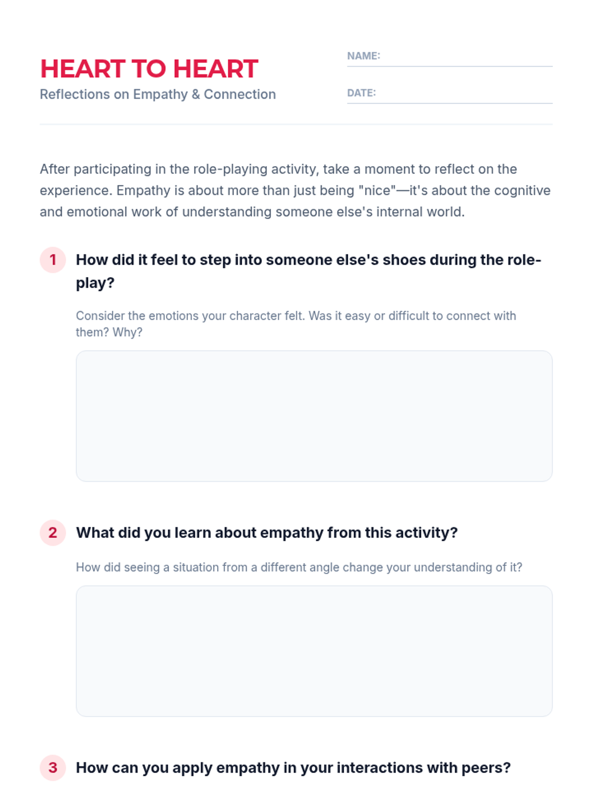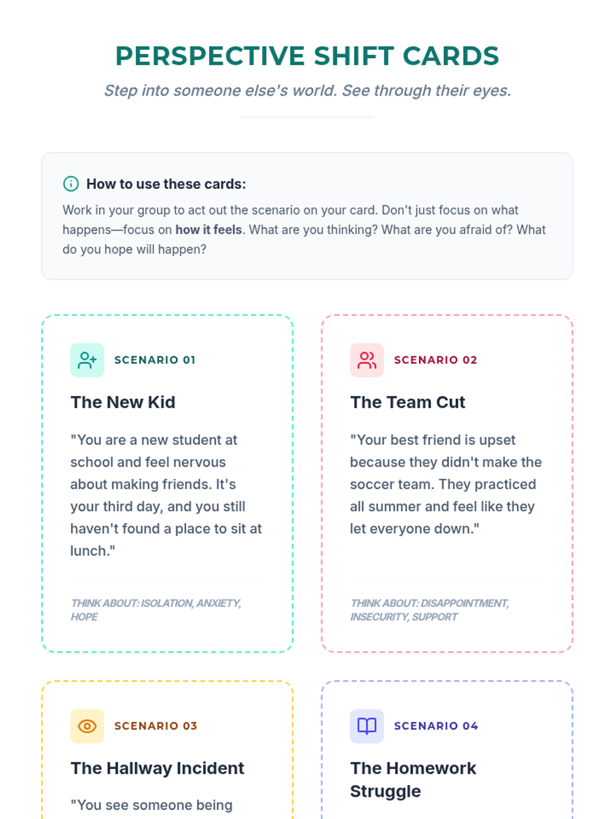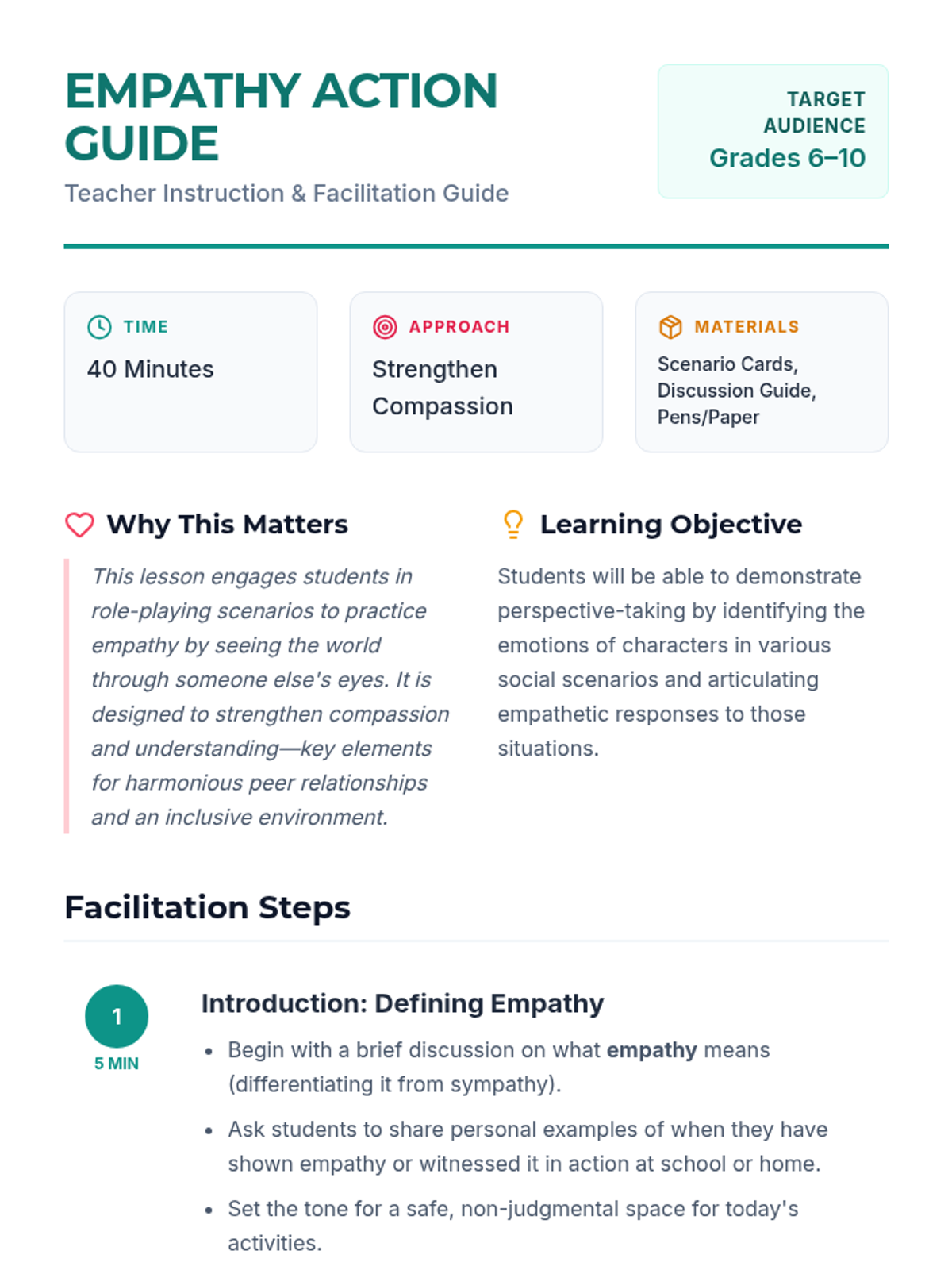 A middle and high school lesson focused on developing empathy through role-playing and perspective-taking. Students engage in scenarios to understand the emotions of others and discuss practical ways to build more compassionate relationships.