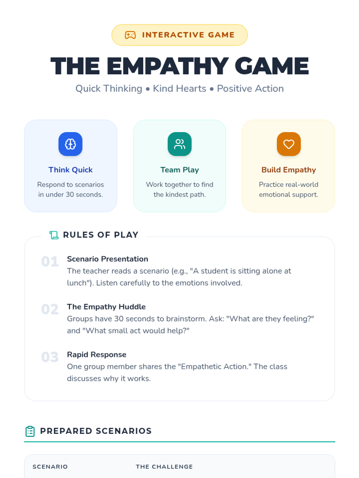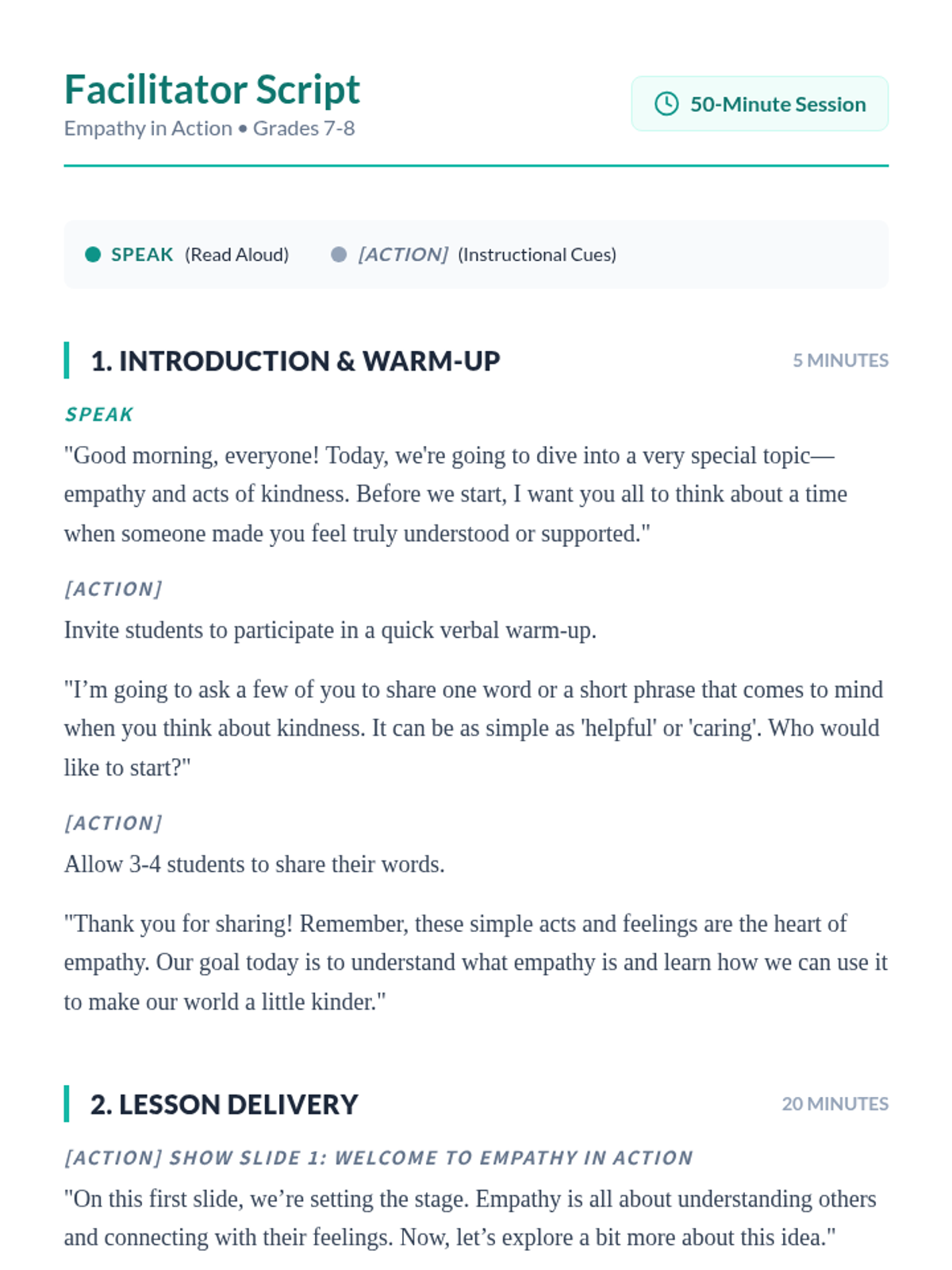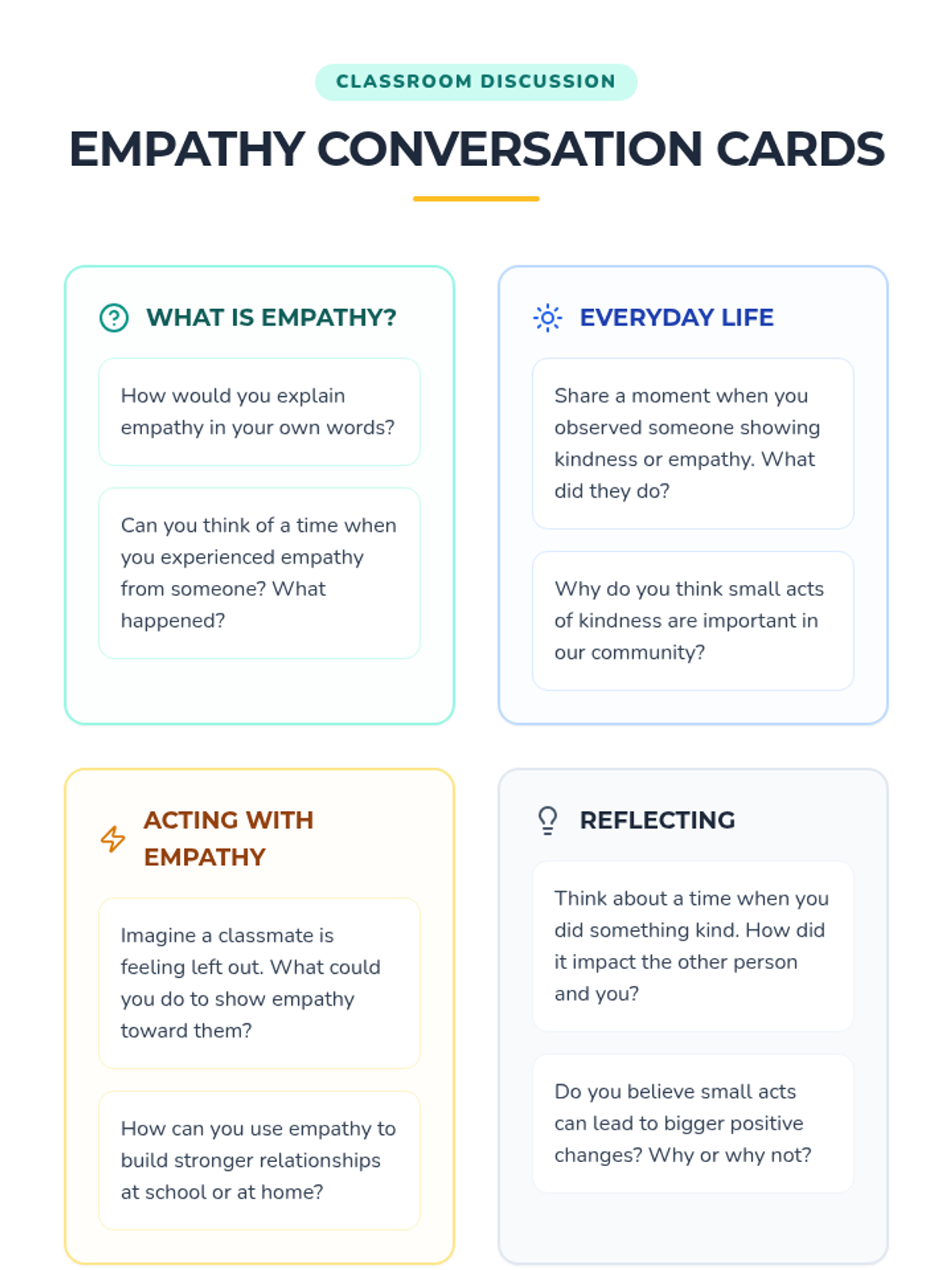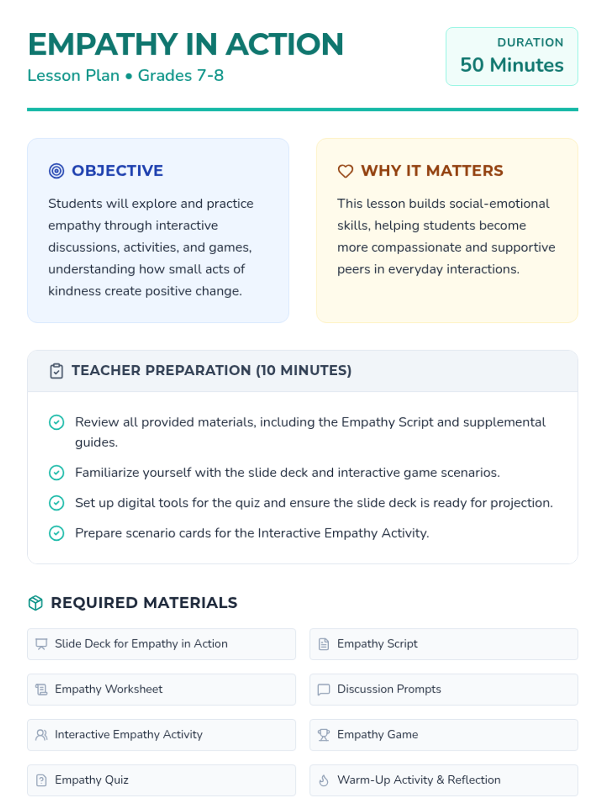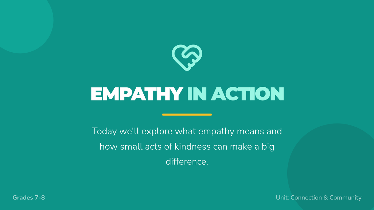 A 50-minute lesson for 7th and 8th graders focused on understanding empathy and practicing acts of kindness through interactive scenarios and reflections.