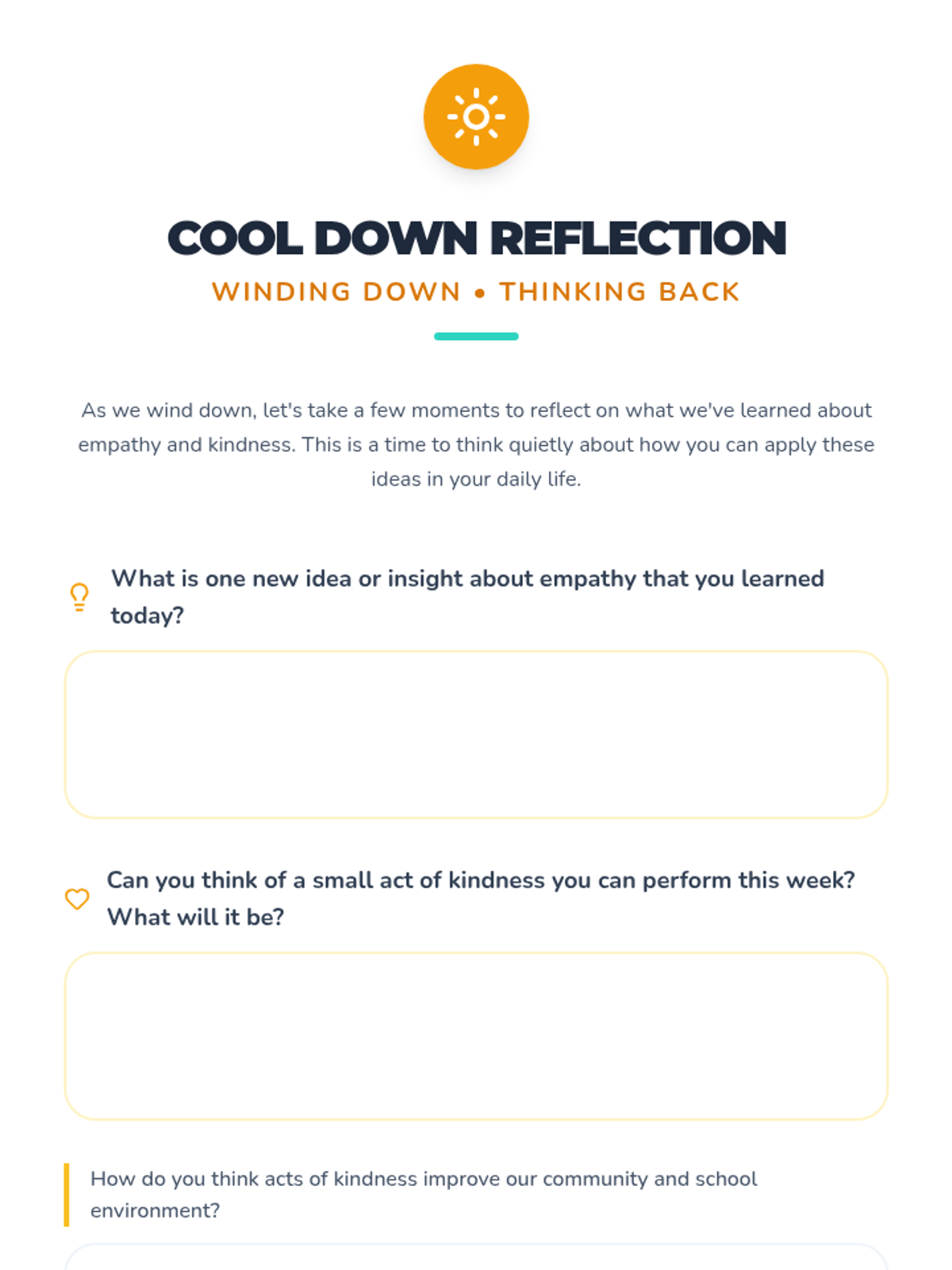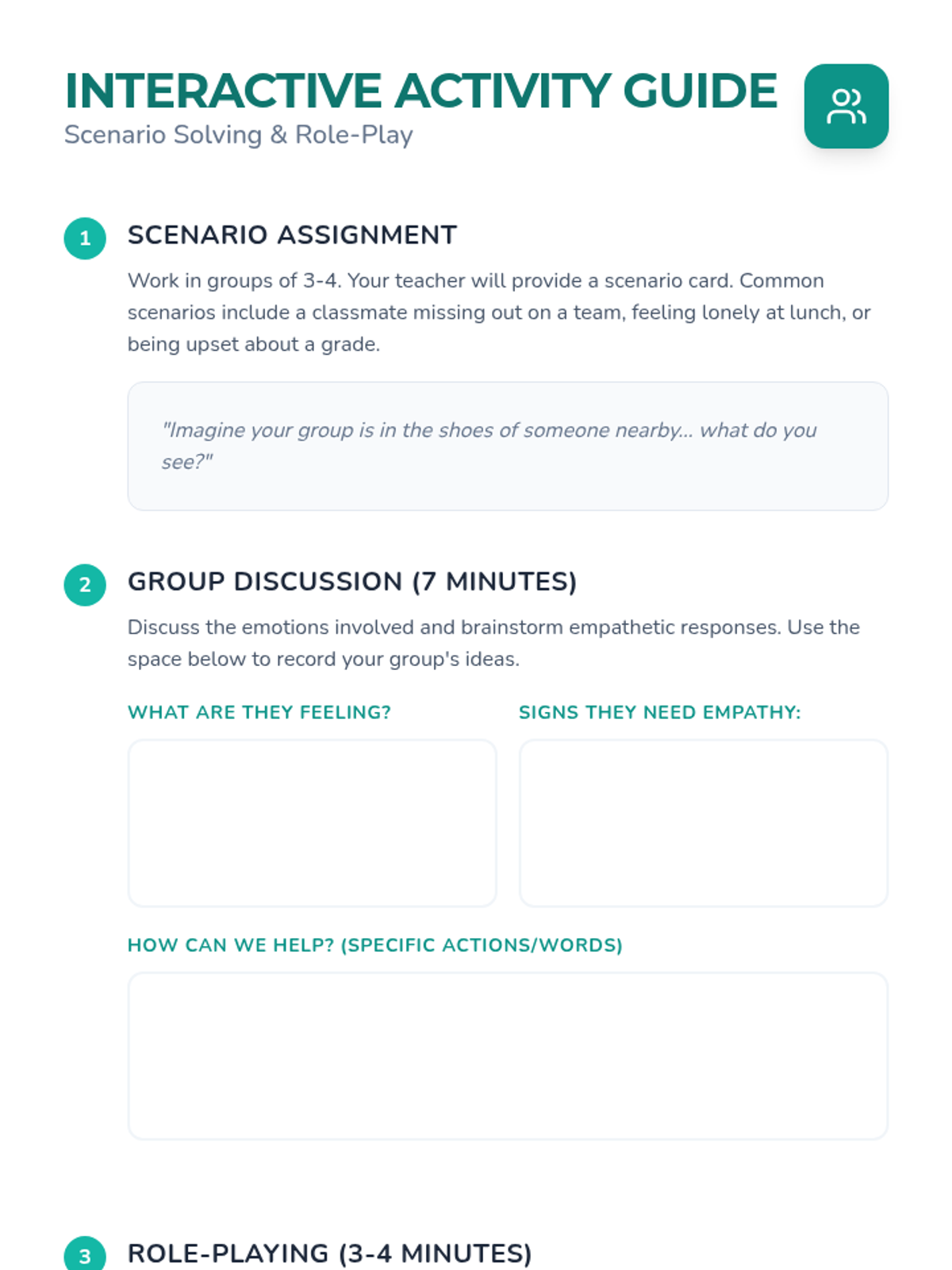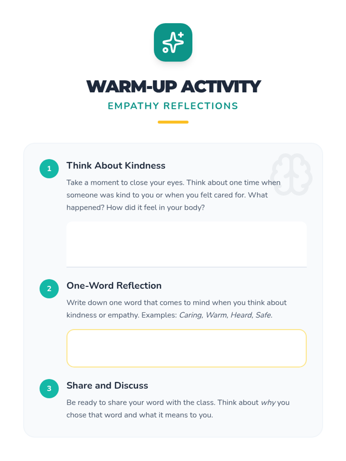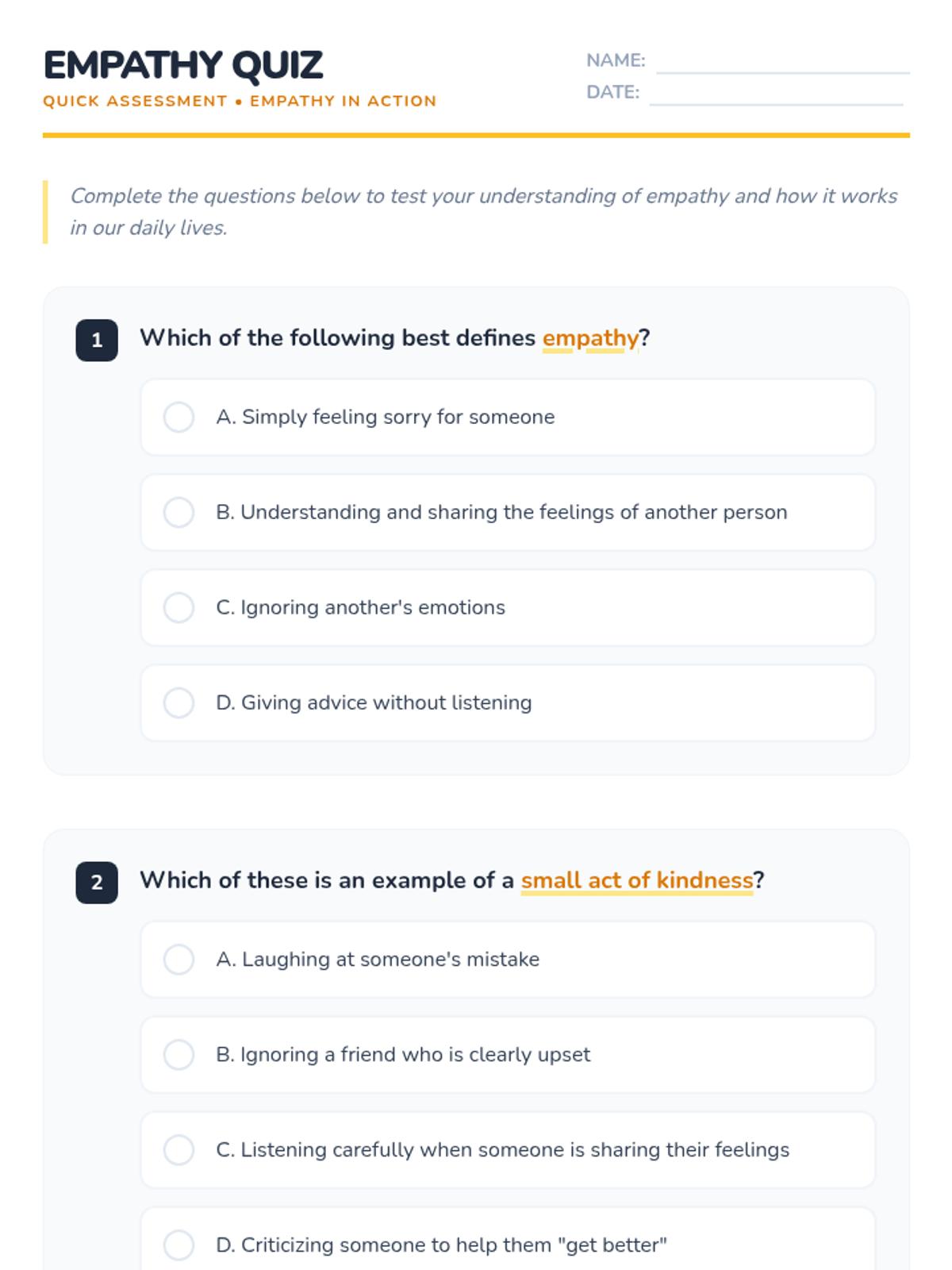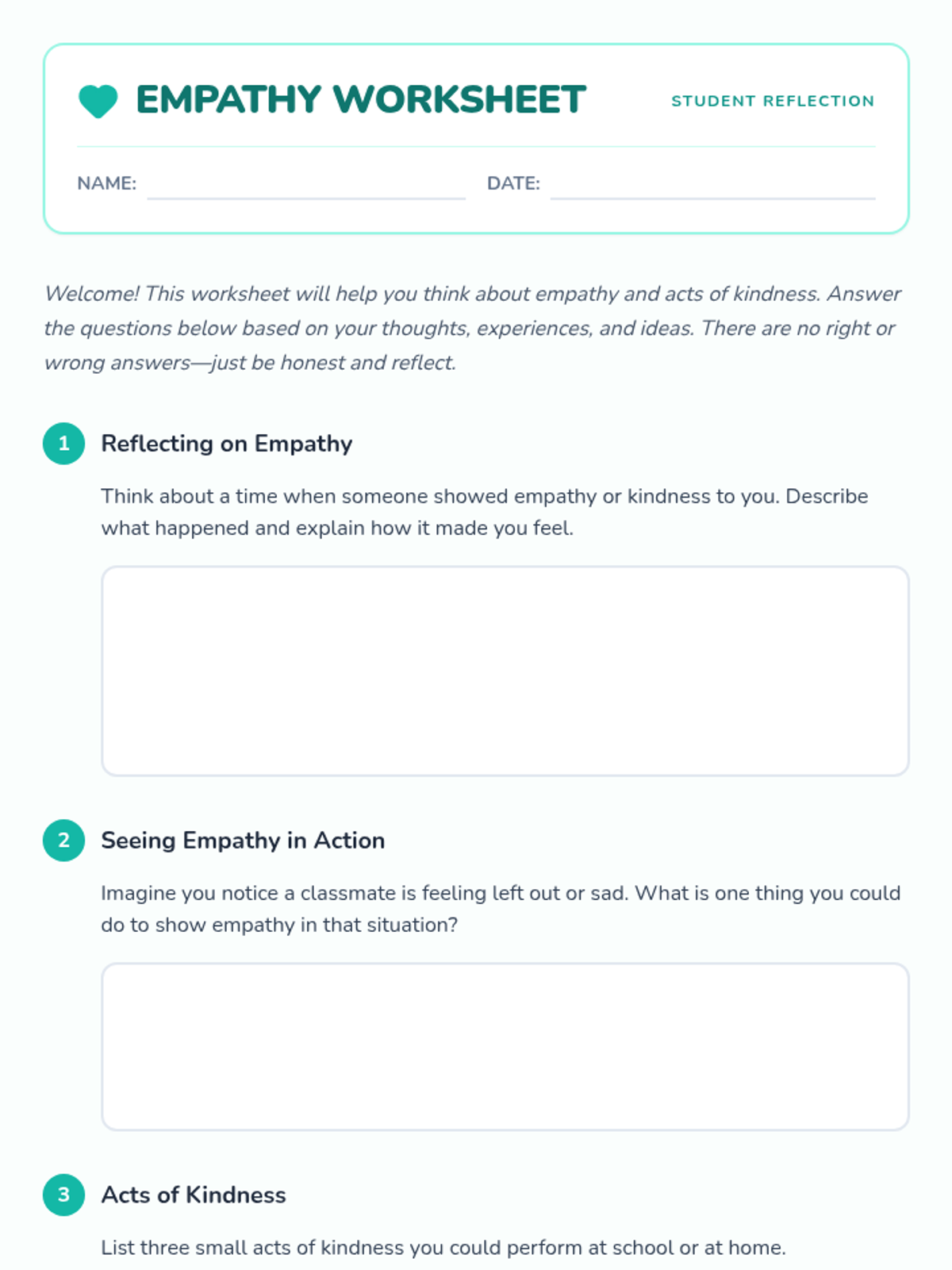 A 50-minute lesson for 7th and 8th graders focused on understanding empathy and practicing acts of kindness through interactive scenarios and reflections.