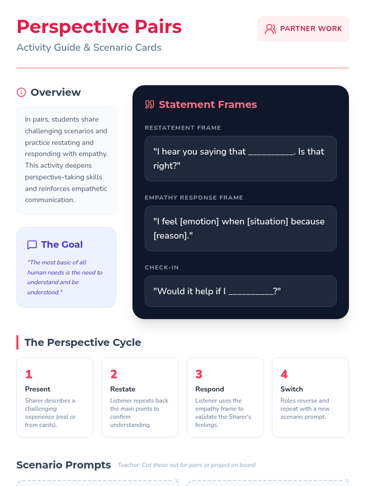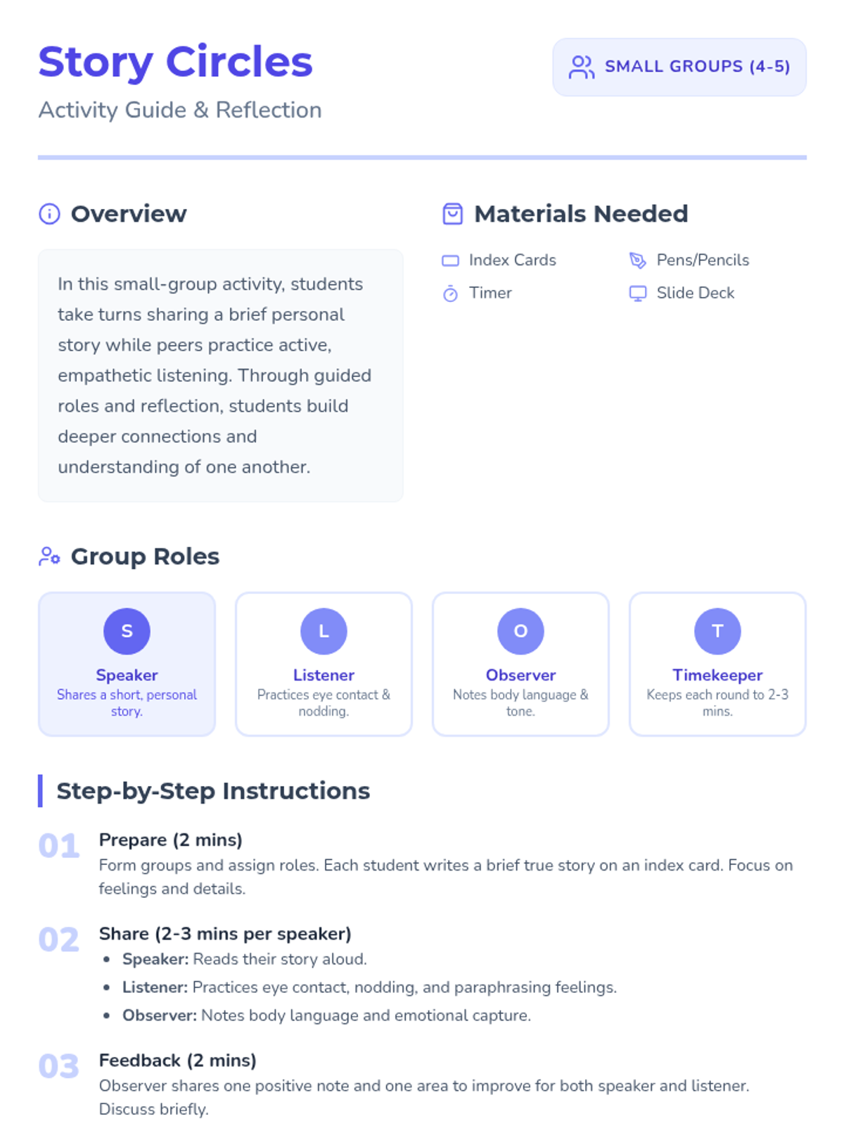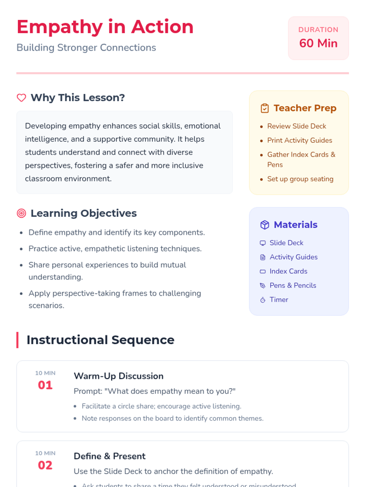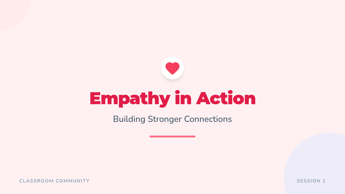 A 60-minute session where students explore empathy through interactive discussions, personal story sharing, and perspective-taking exercises to strengthen classroom community.