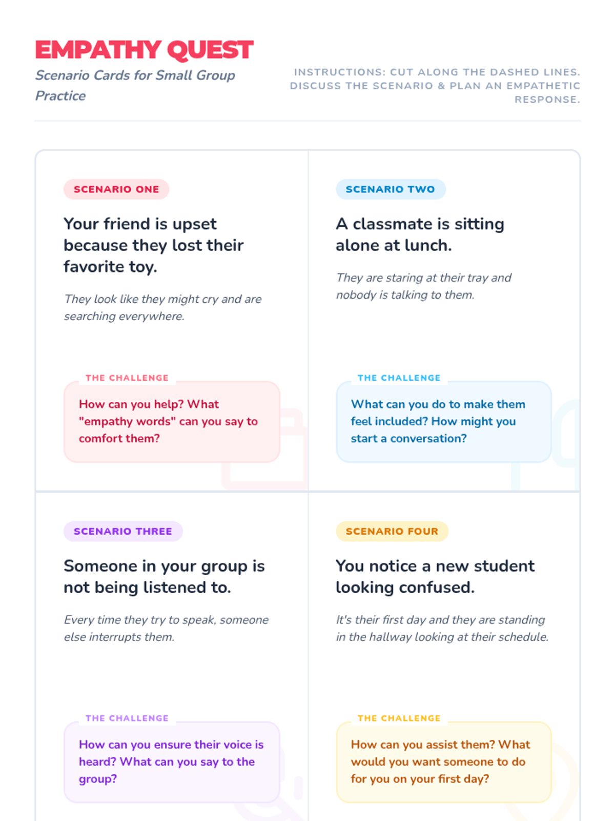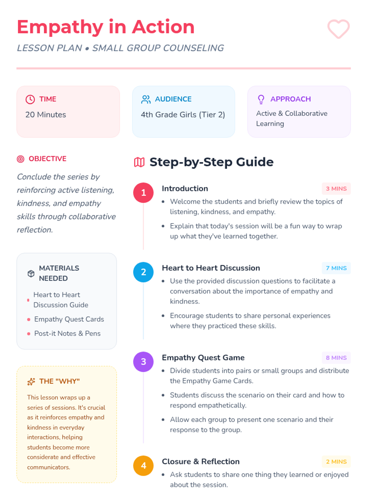 A Tier 2 counseling lesson for 4th-grade girls focused on reinforcing empathy, kindness, and active listening through discussion and scenario-based games.