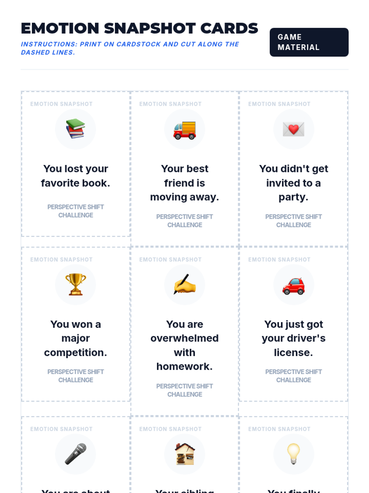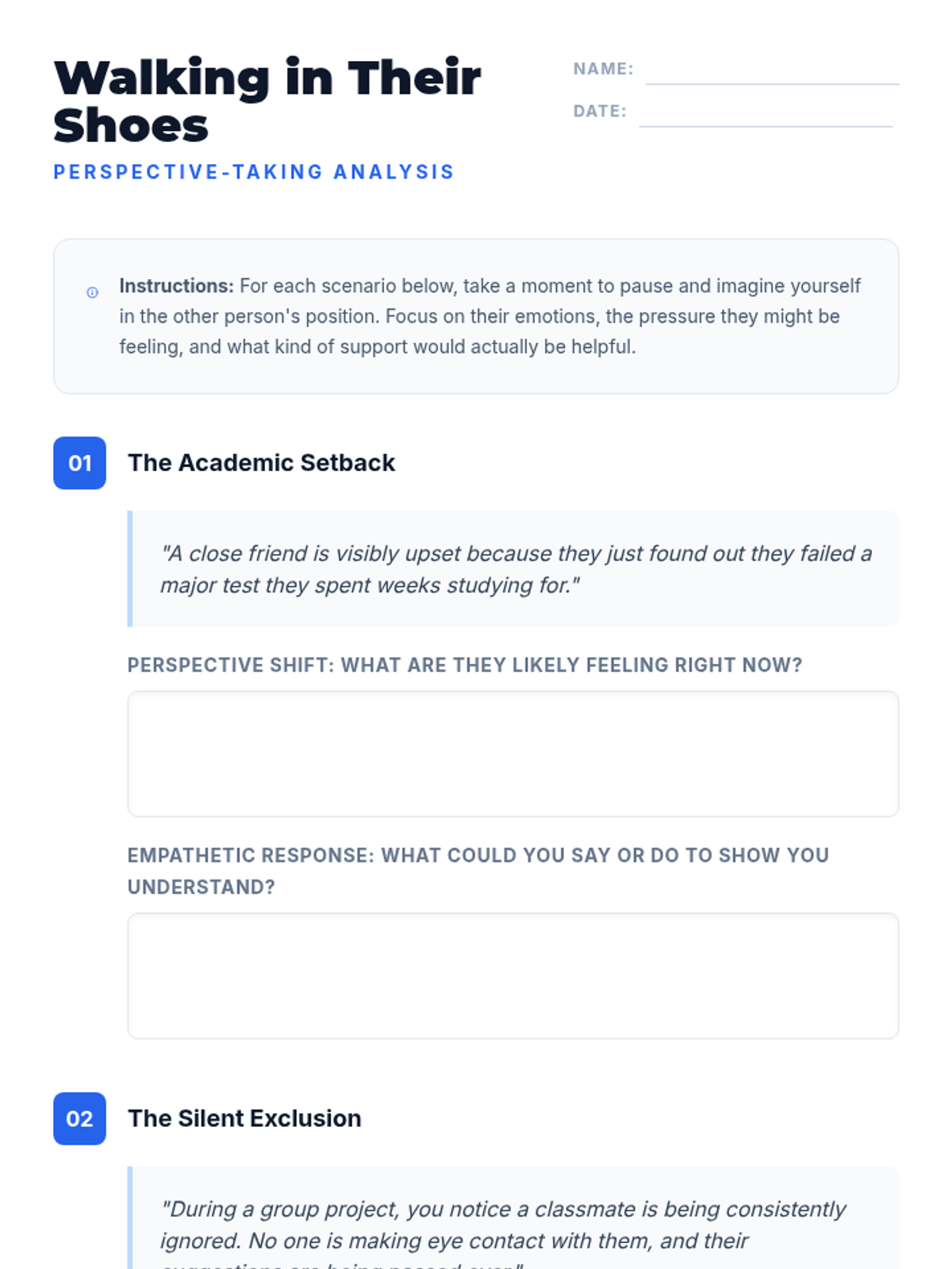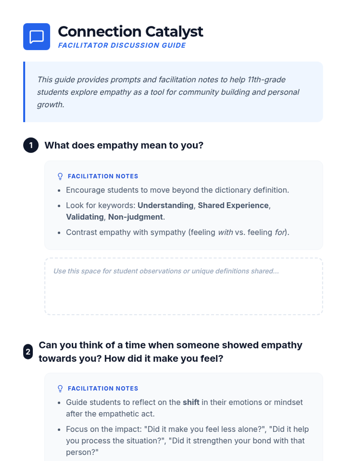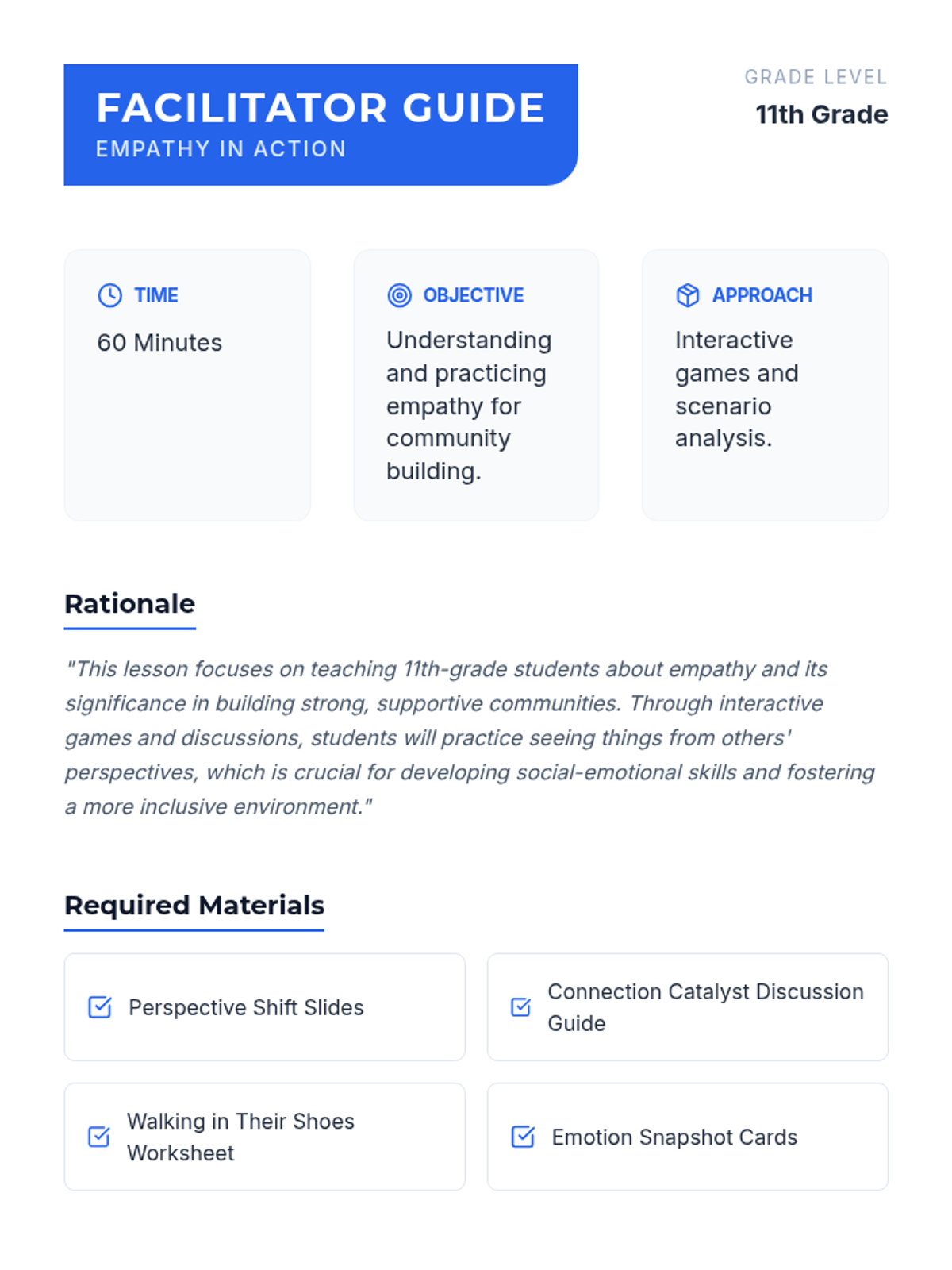 An interactive lesson for 11th-grade students designed to cultivate empathy through perspective-taking exercises, scenario analysis, and group discussion. Students explore how empathy strengthens community bonds and practice identifying and responding to the emotions of others.