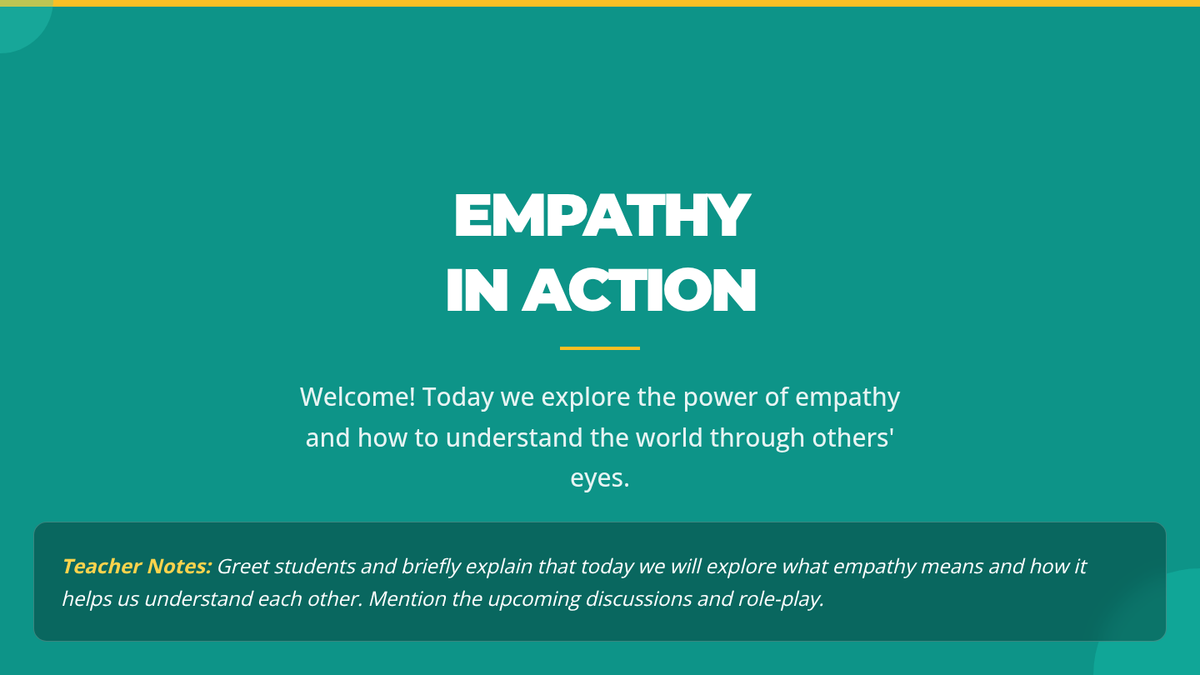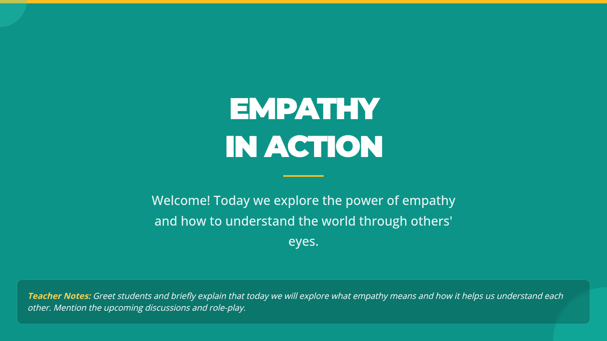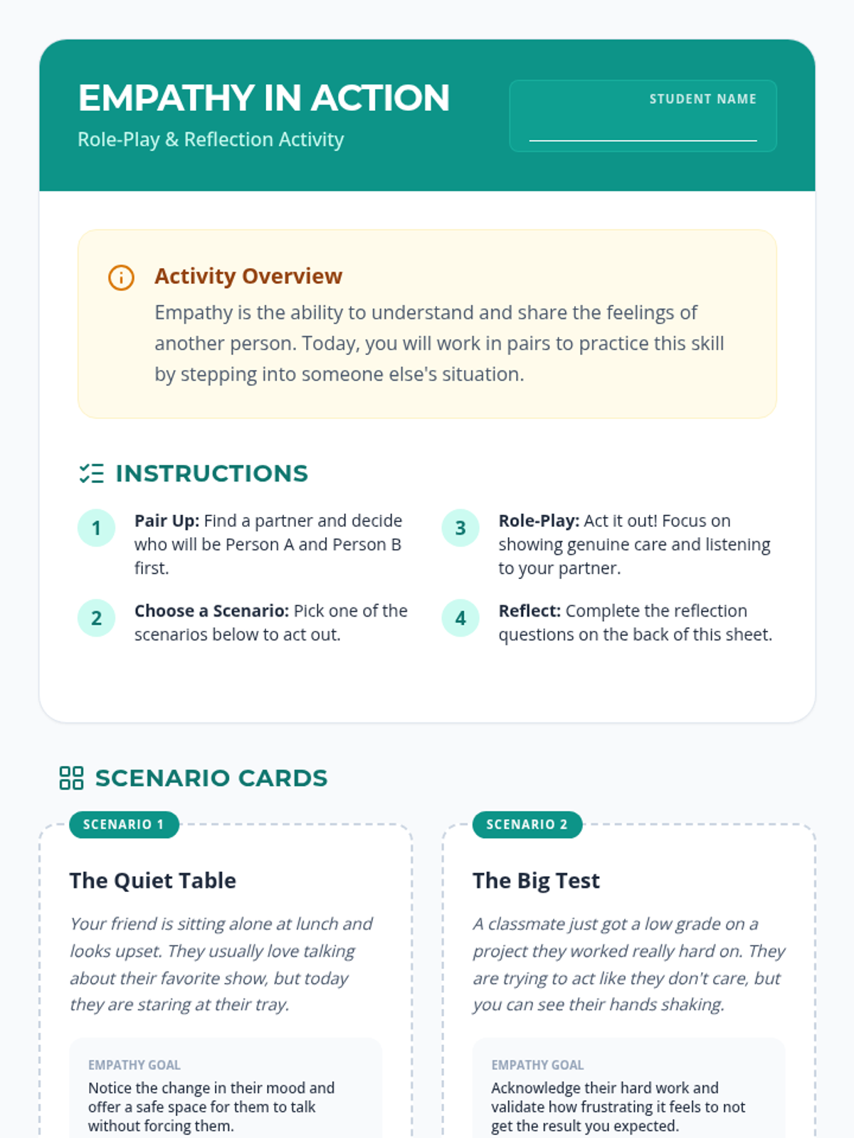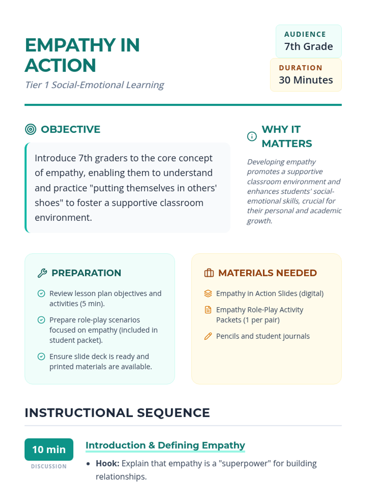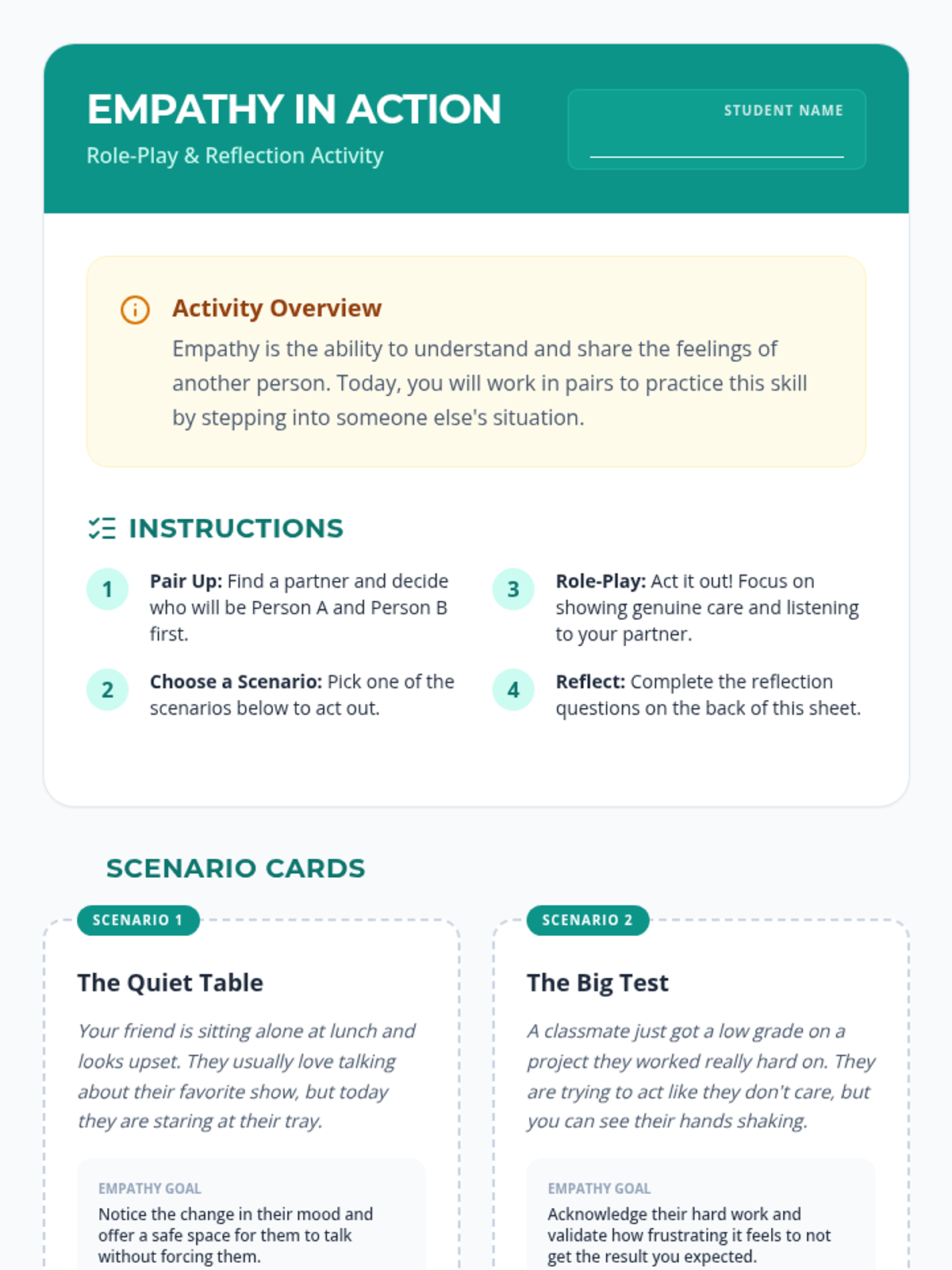 A 30-minute introductory lesson for 7th-grade students focused on understanding and practicing empathy through discussion and role-play. Students will learn the definition of empathy and apply perspective-taking skills to real-world scenarios.