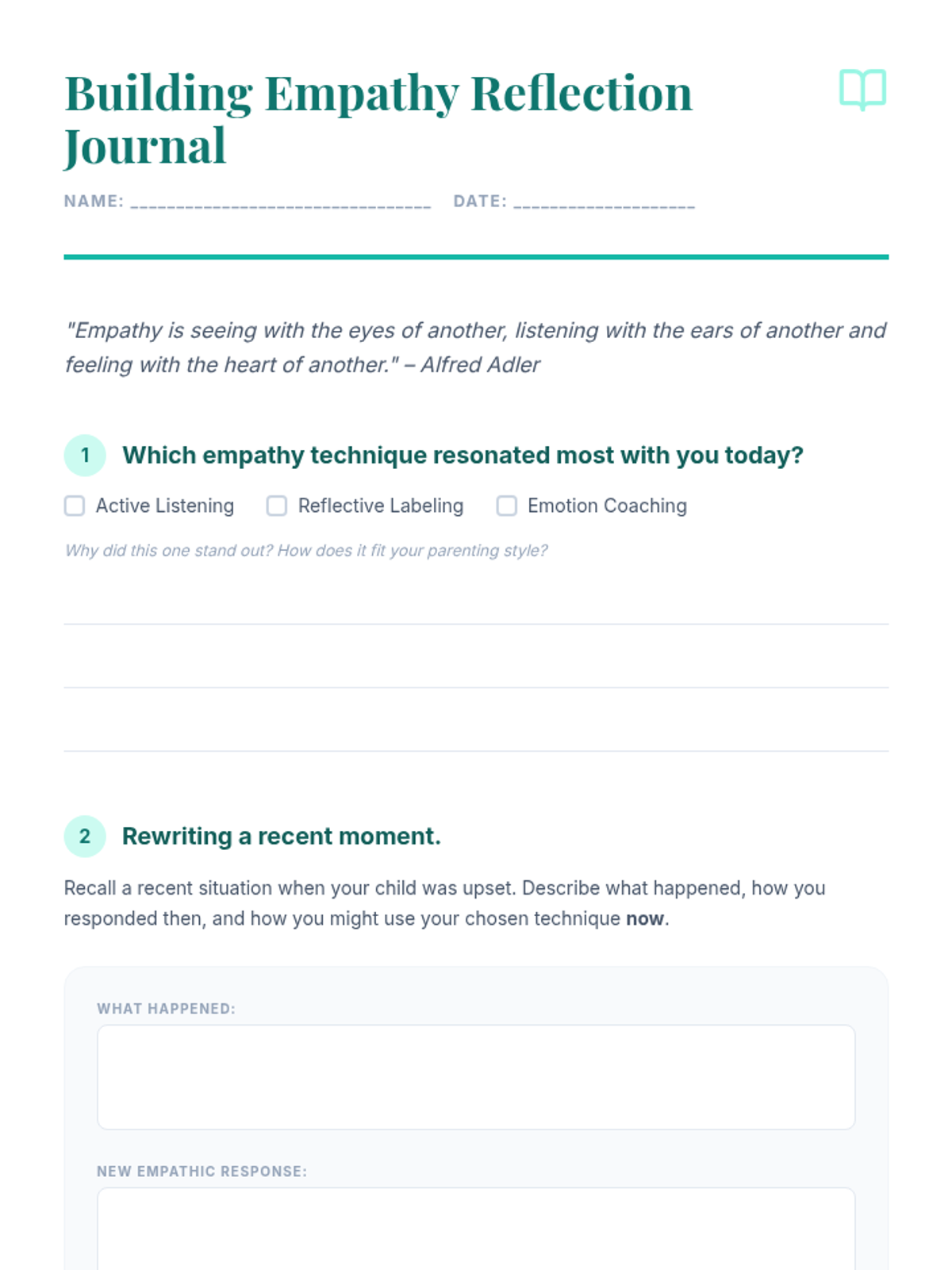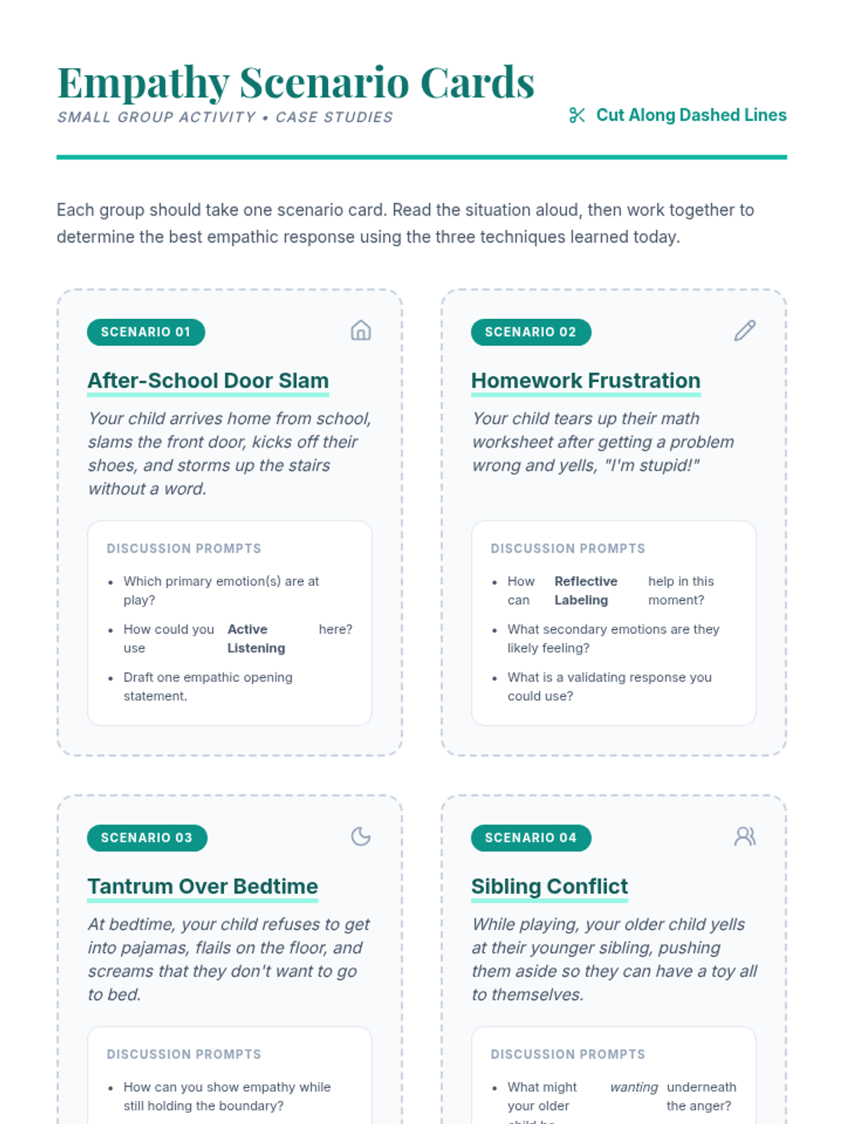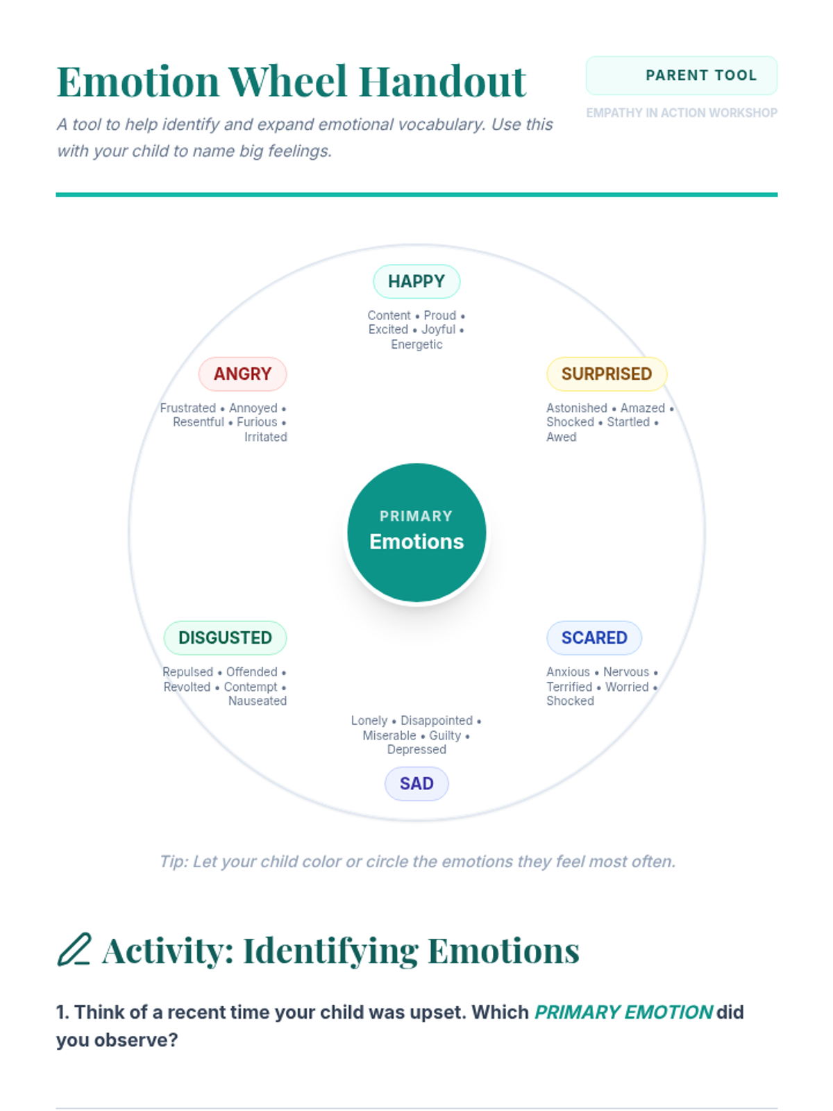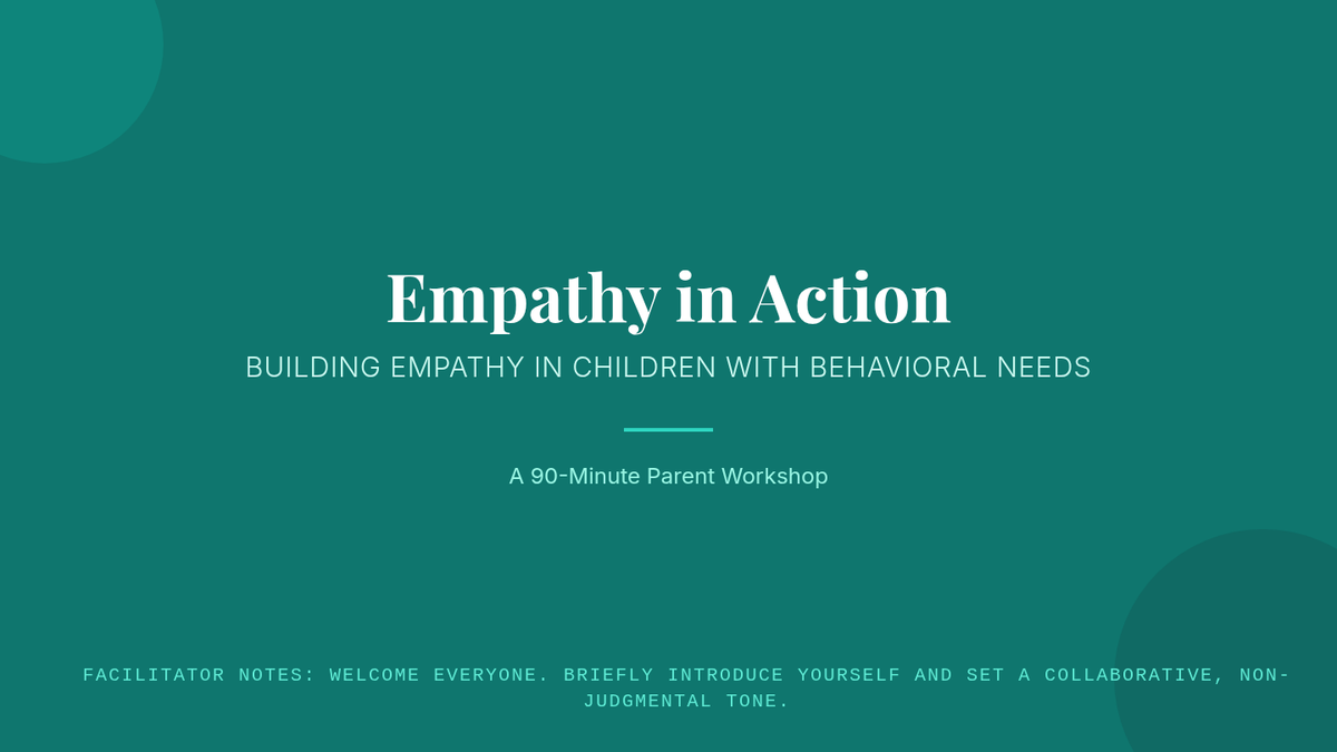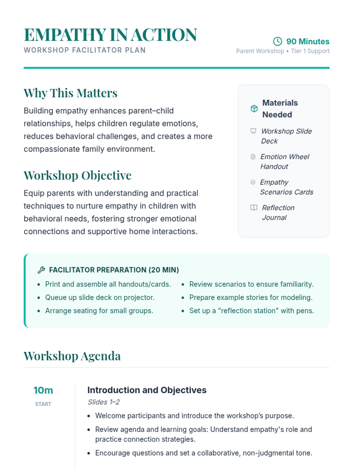 A 90-minute Tier 1 workshop for parents on building empathy in children with behavioral needs, equipping families with practical strategies to strengthen emotional connections and promote supportive home environments.