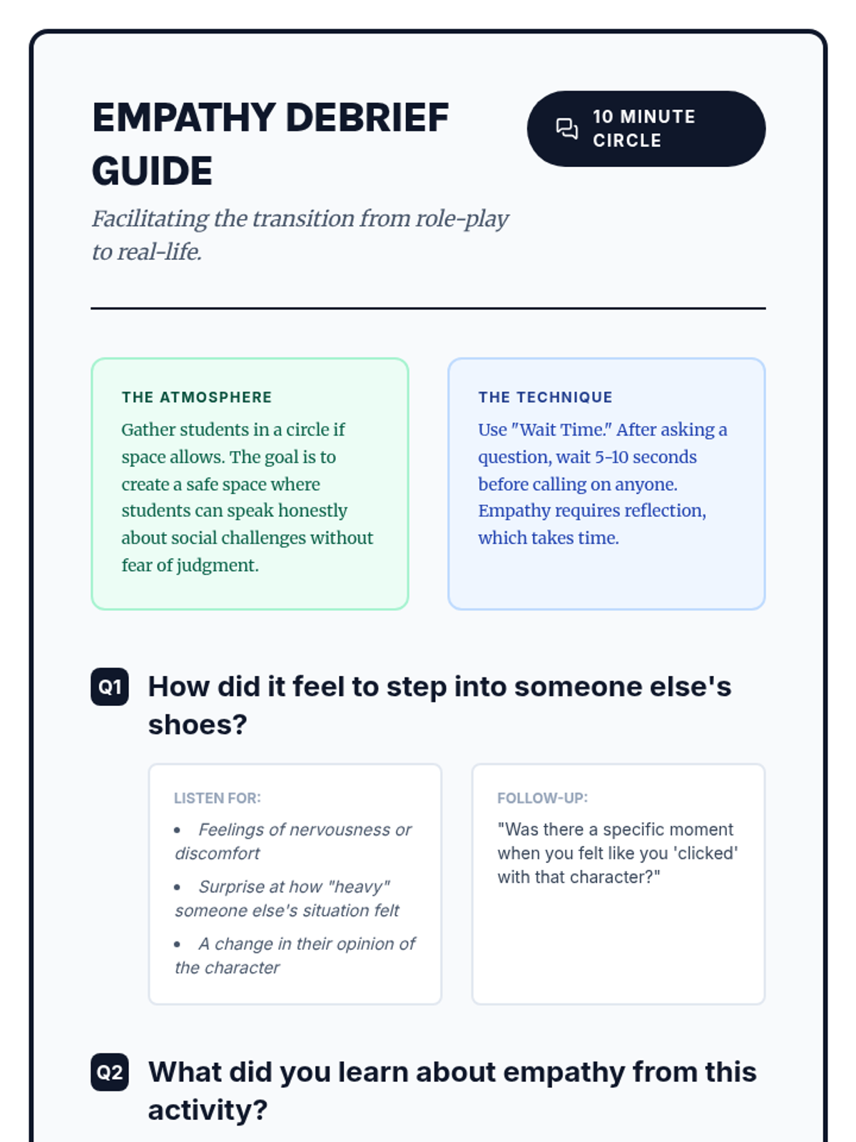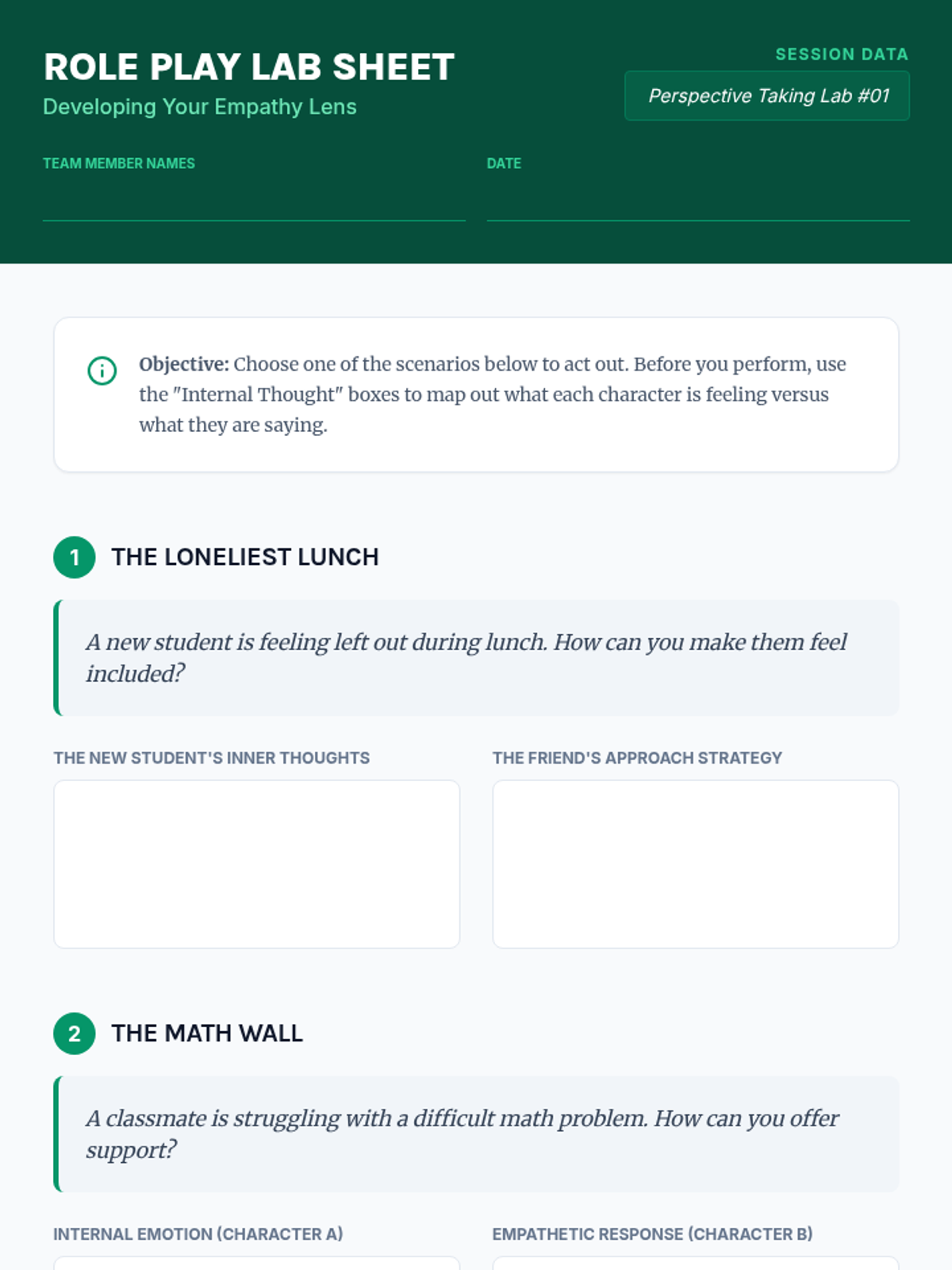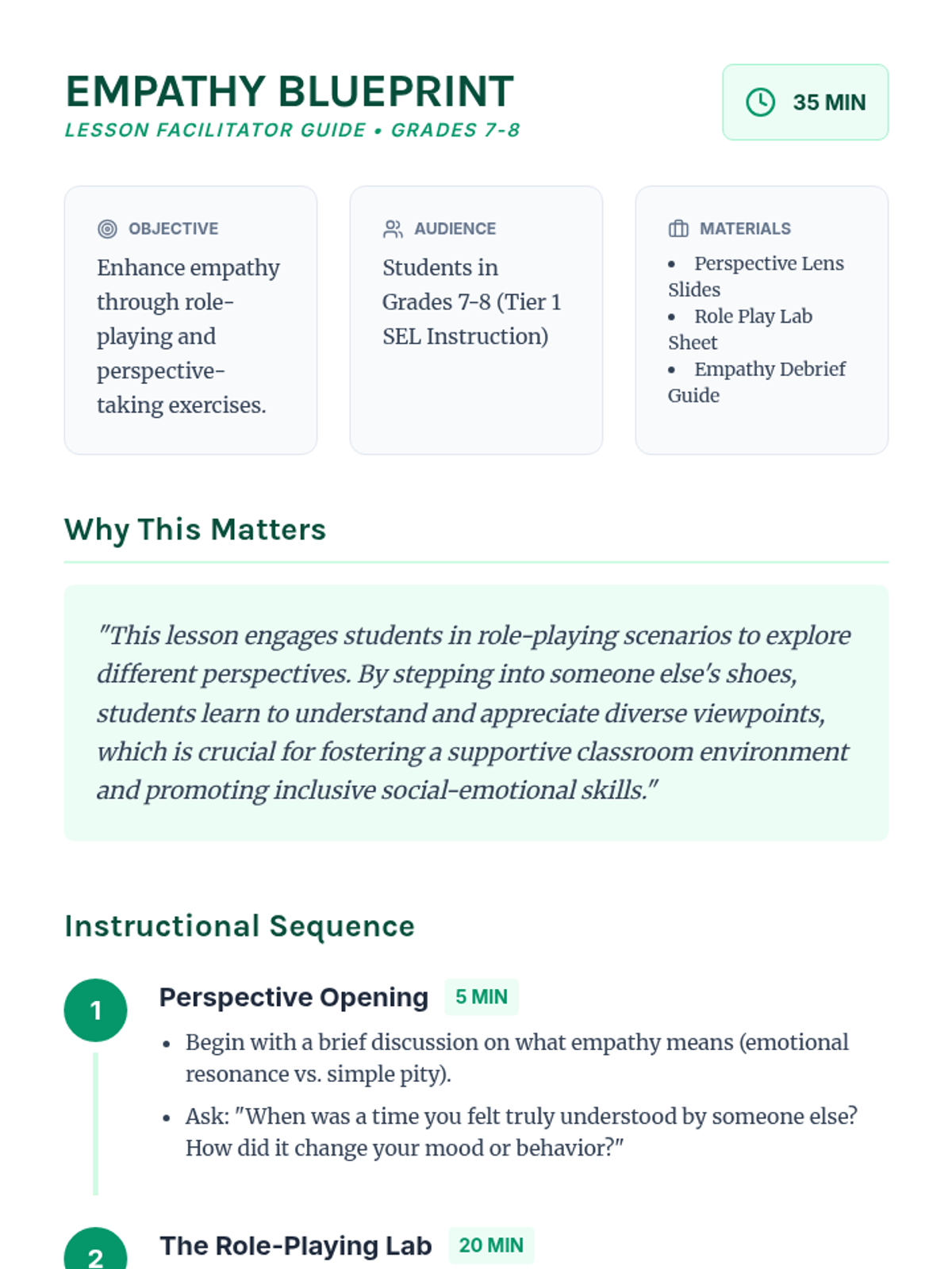 A hands-on social-emotional learning lesson where students use role-playing to step into others' shoes, fostering a more inclusive and supportive classroom environment through perspective-taking.