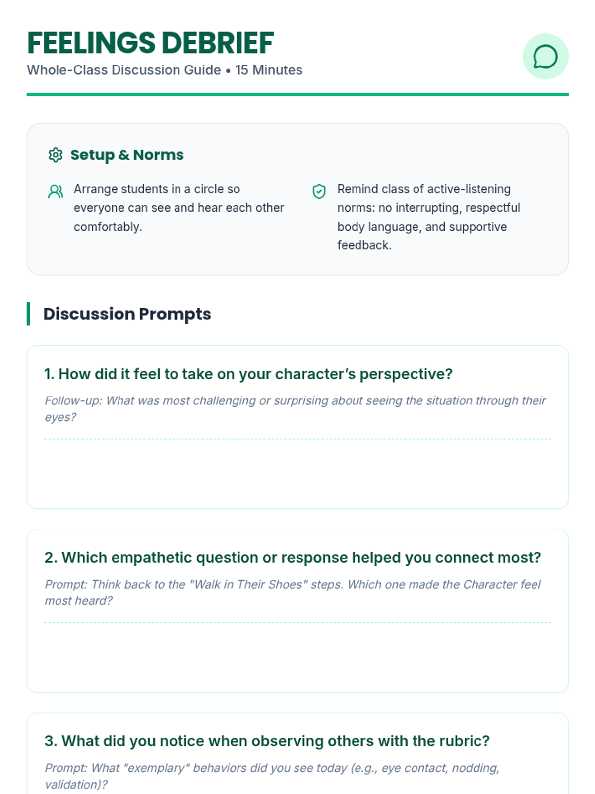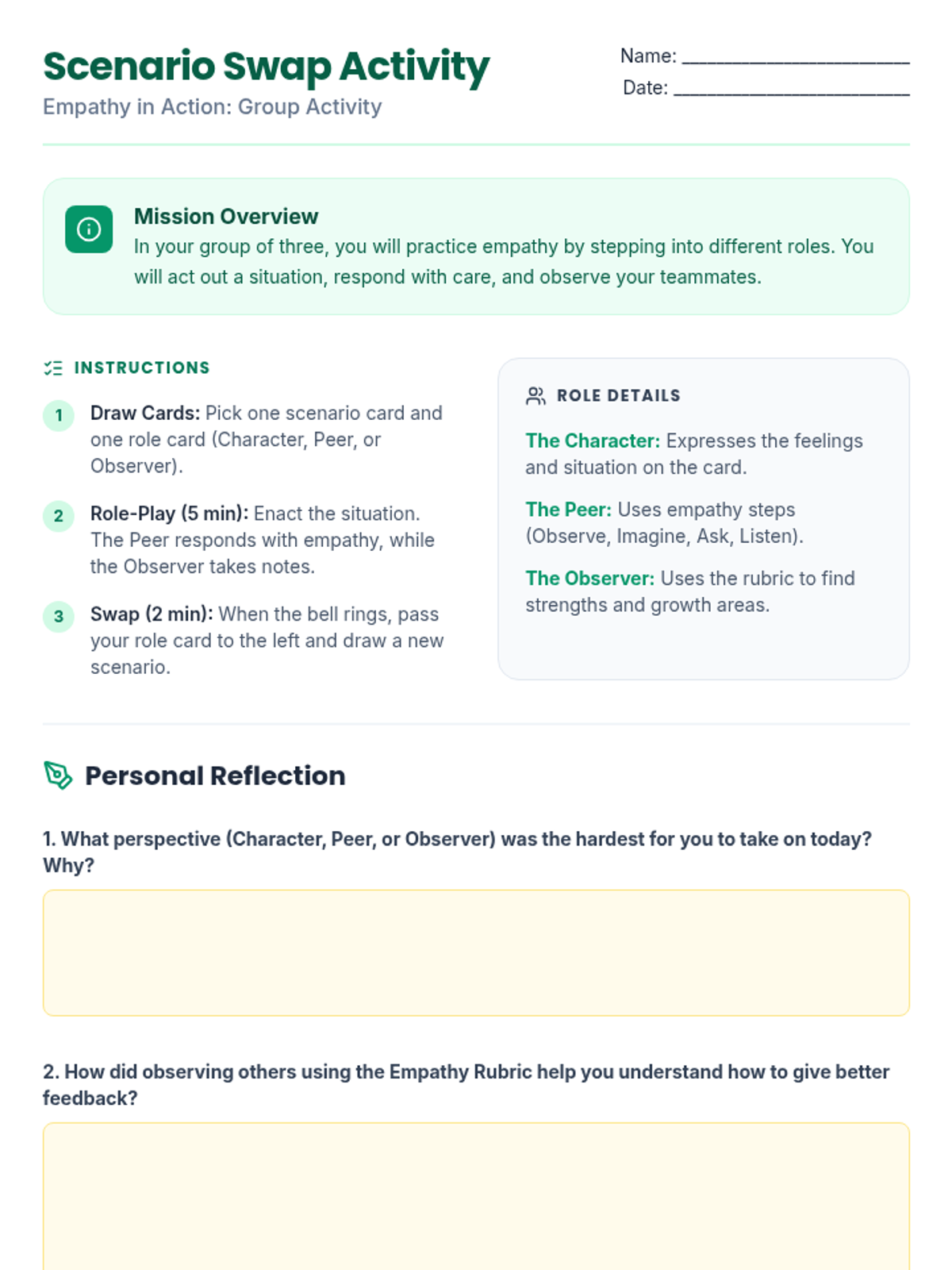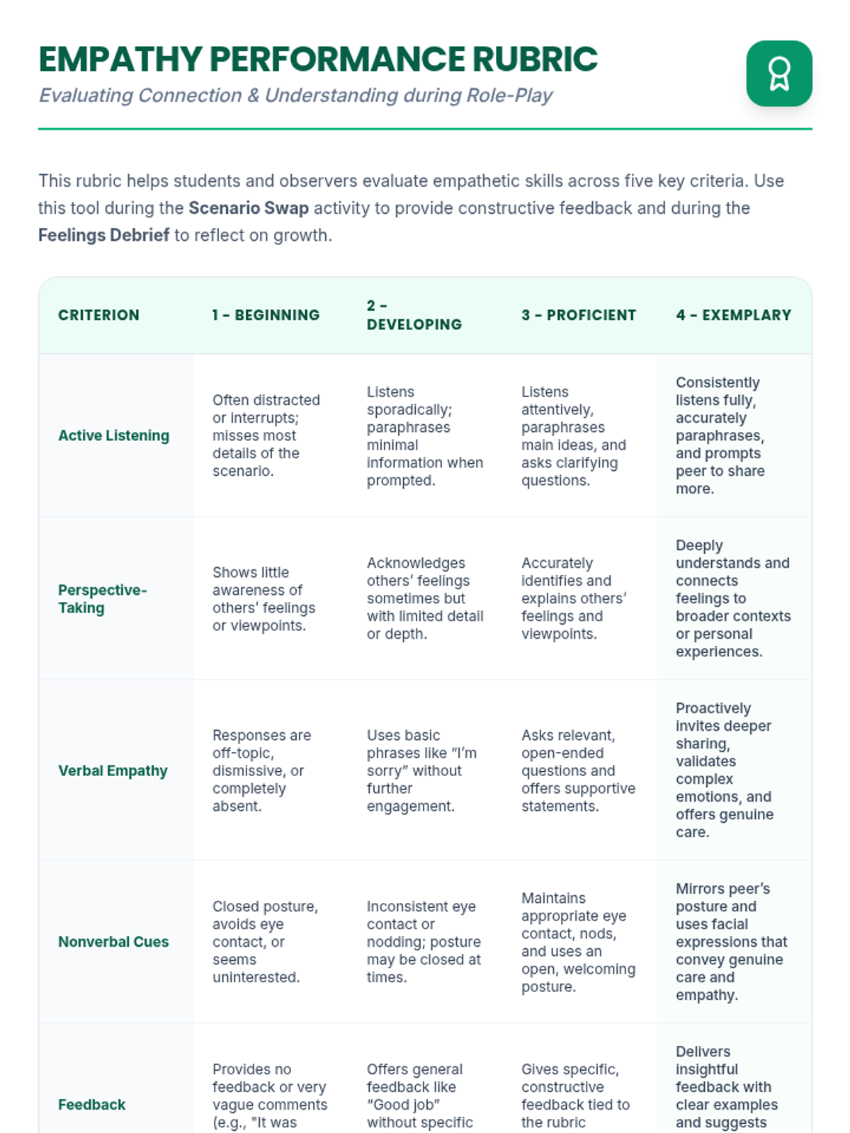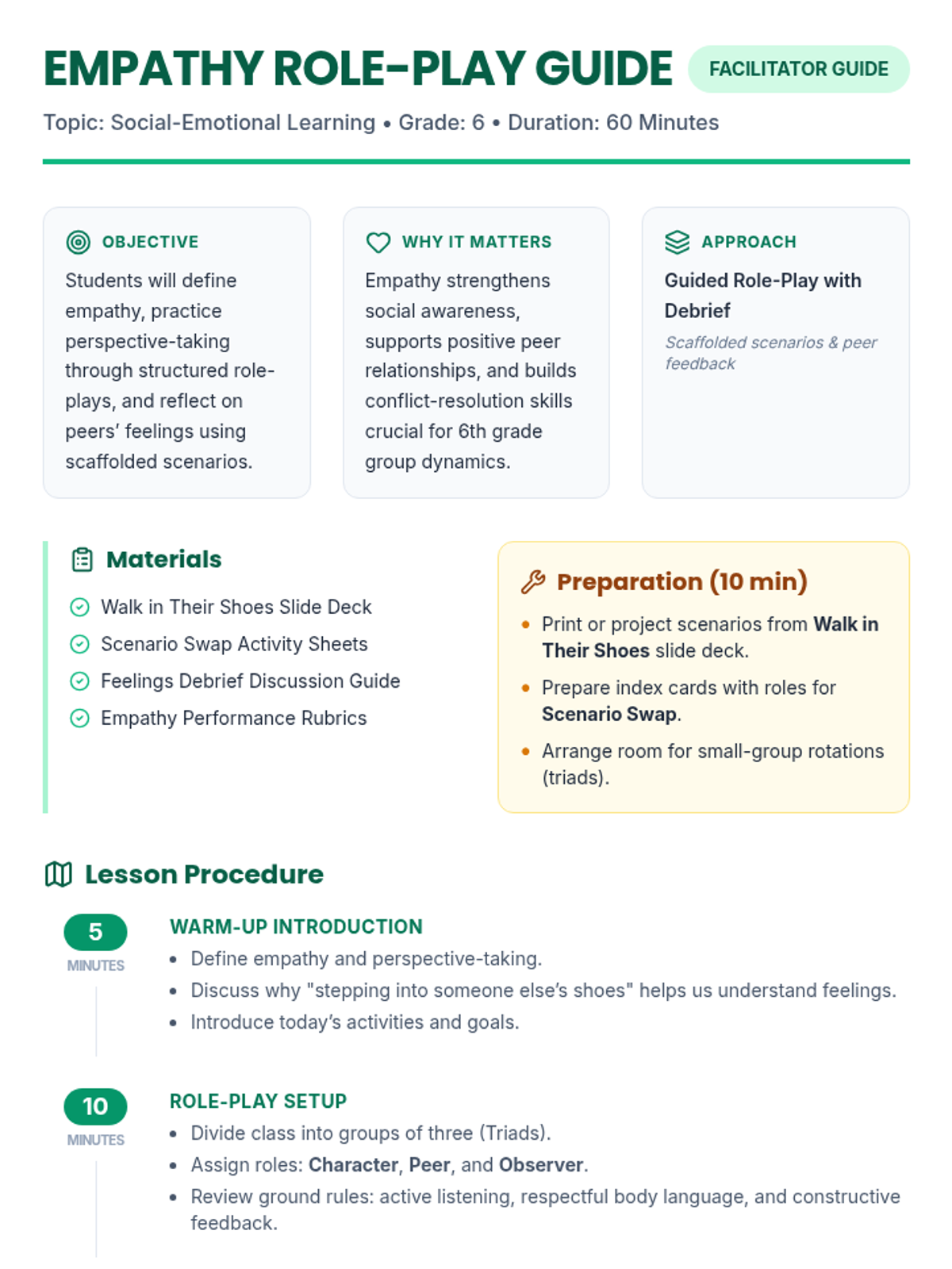 This lesson equips 6th grade small groups with practical empathy skills using perspective-taking and role-play. Through guided scenarios and reflective discussion, students will strengthen social awareness and peer connections in meaningful, real-world contexts.