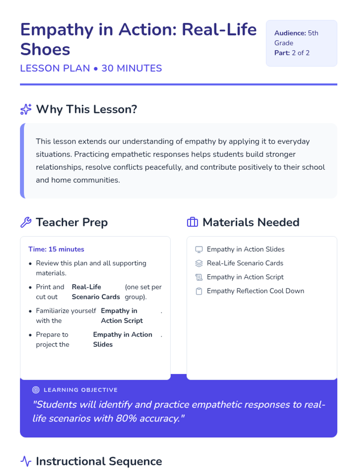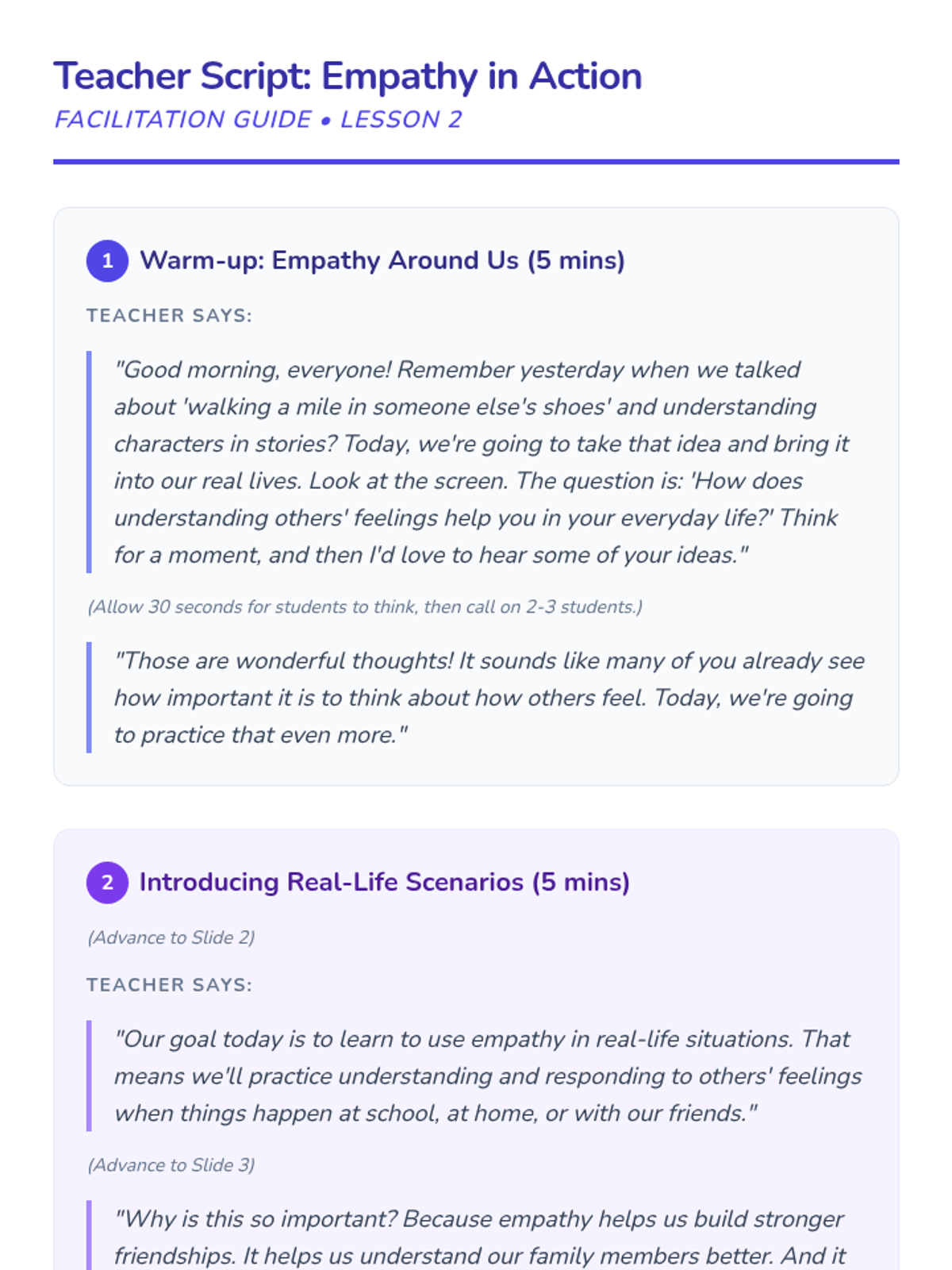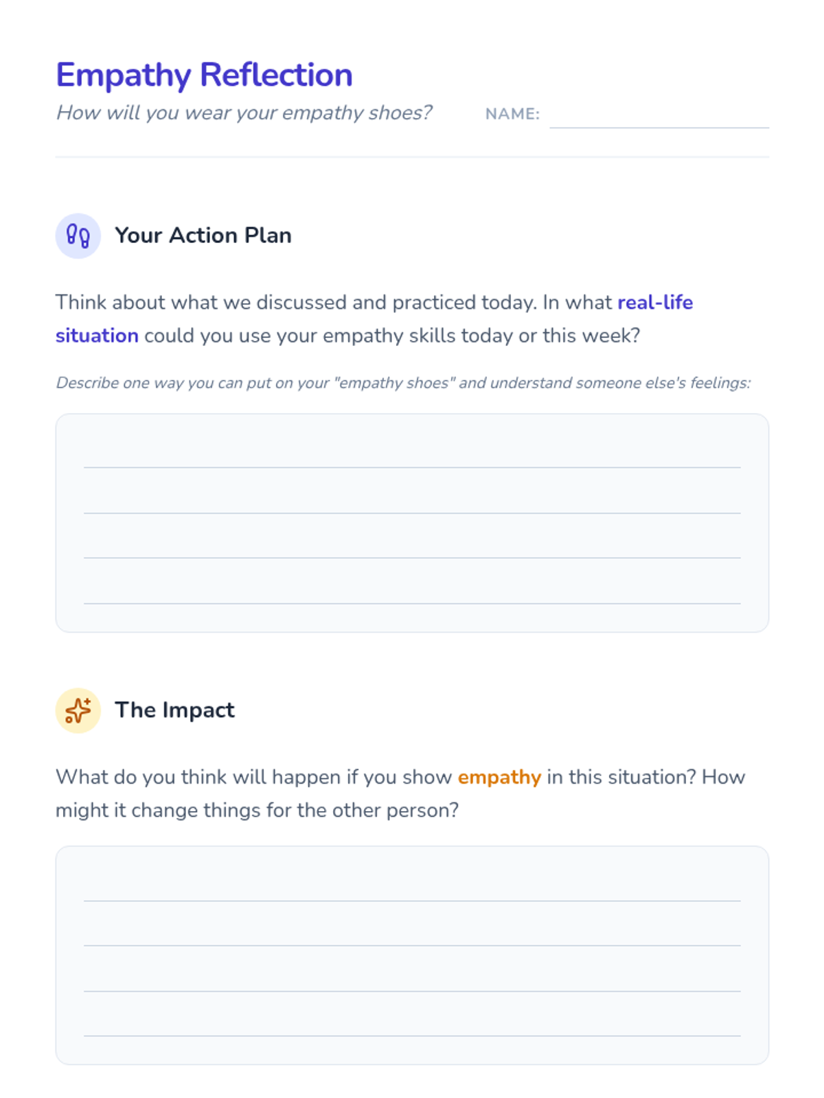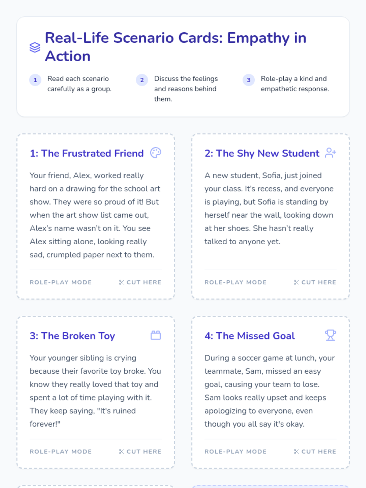 Students apply empathy skills to real-world situations, practicing how to identify feelings and role-play kind, supportive responses to everyday challenges.