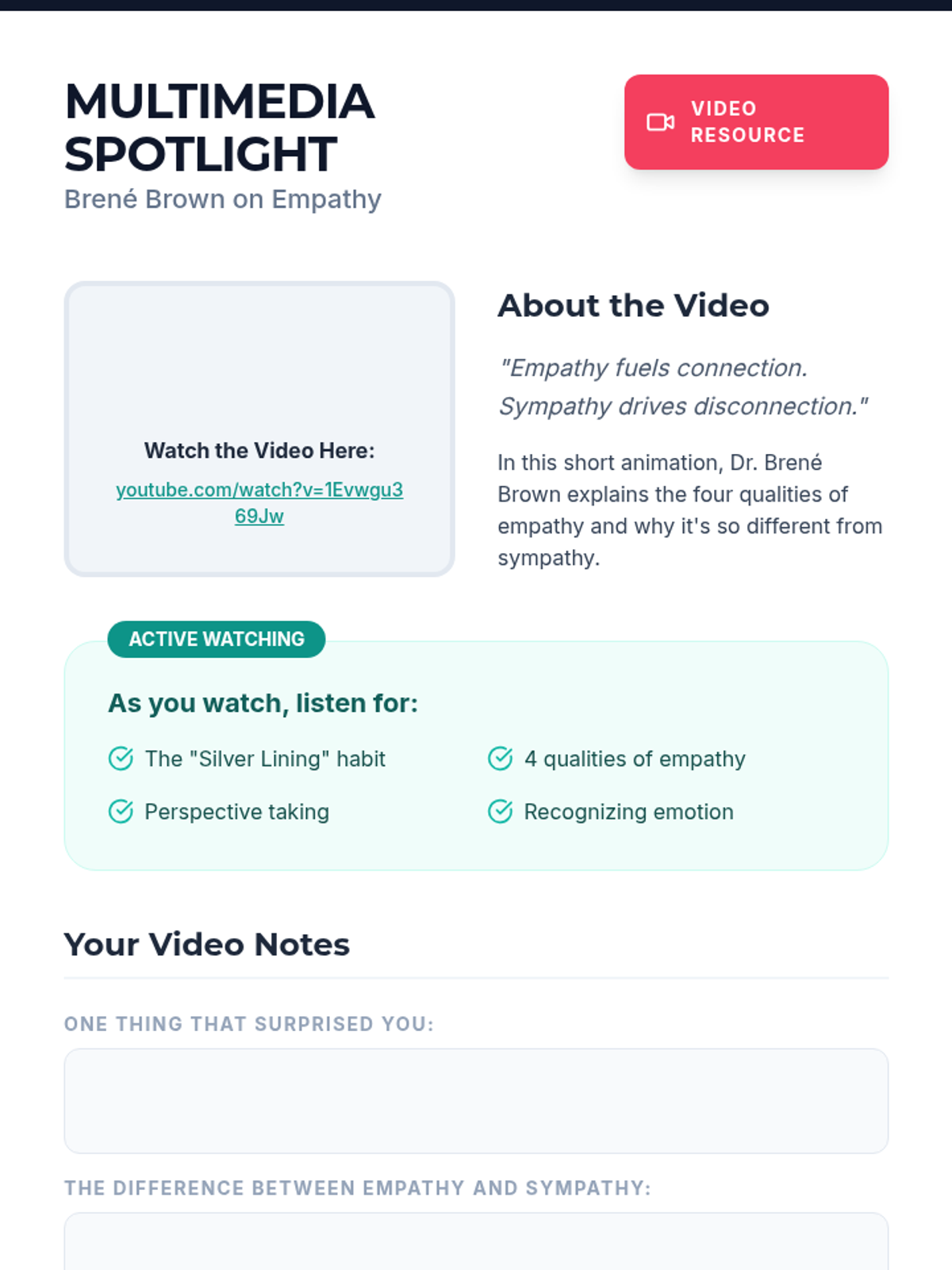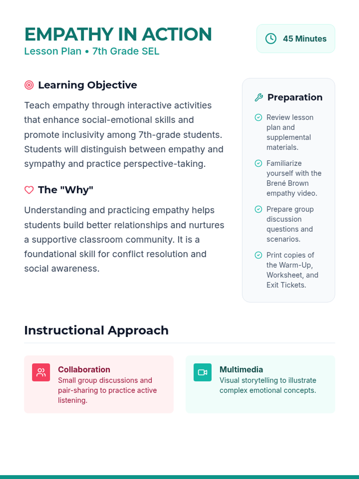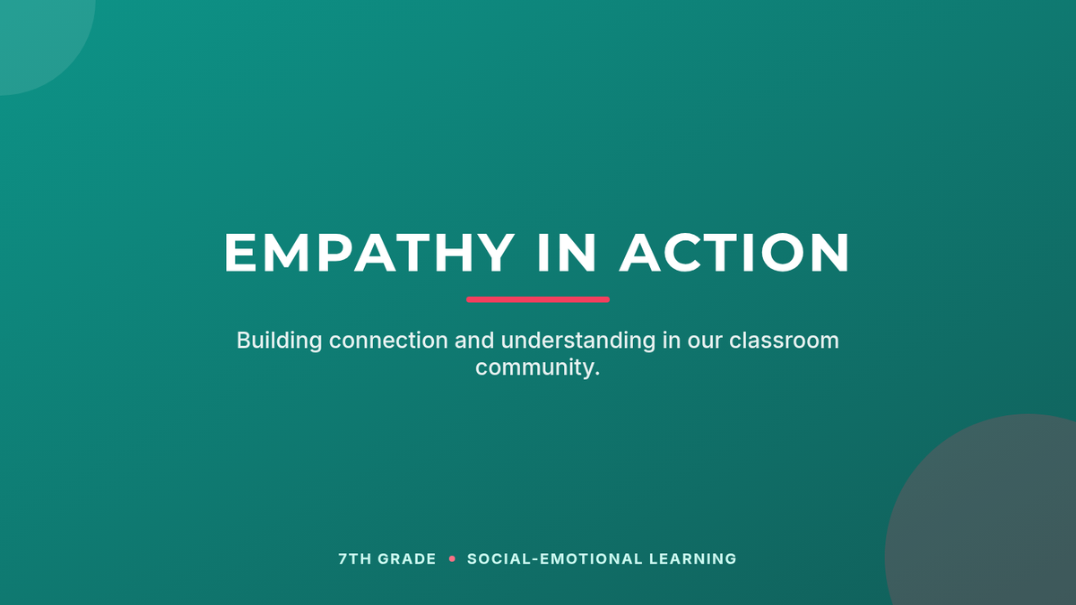A 45-minute lesson for 7th-grade students focusing on understanding and practicing empathy through engaging activities, discussions, and multimedia. Students will learn the difference between empathy and sympathy and identify practical ways to build a more inclusive classroom.