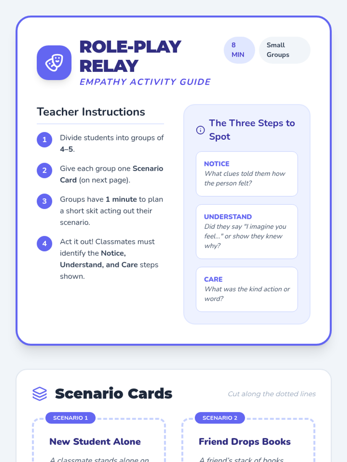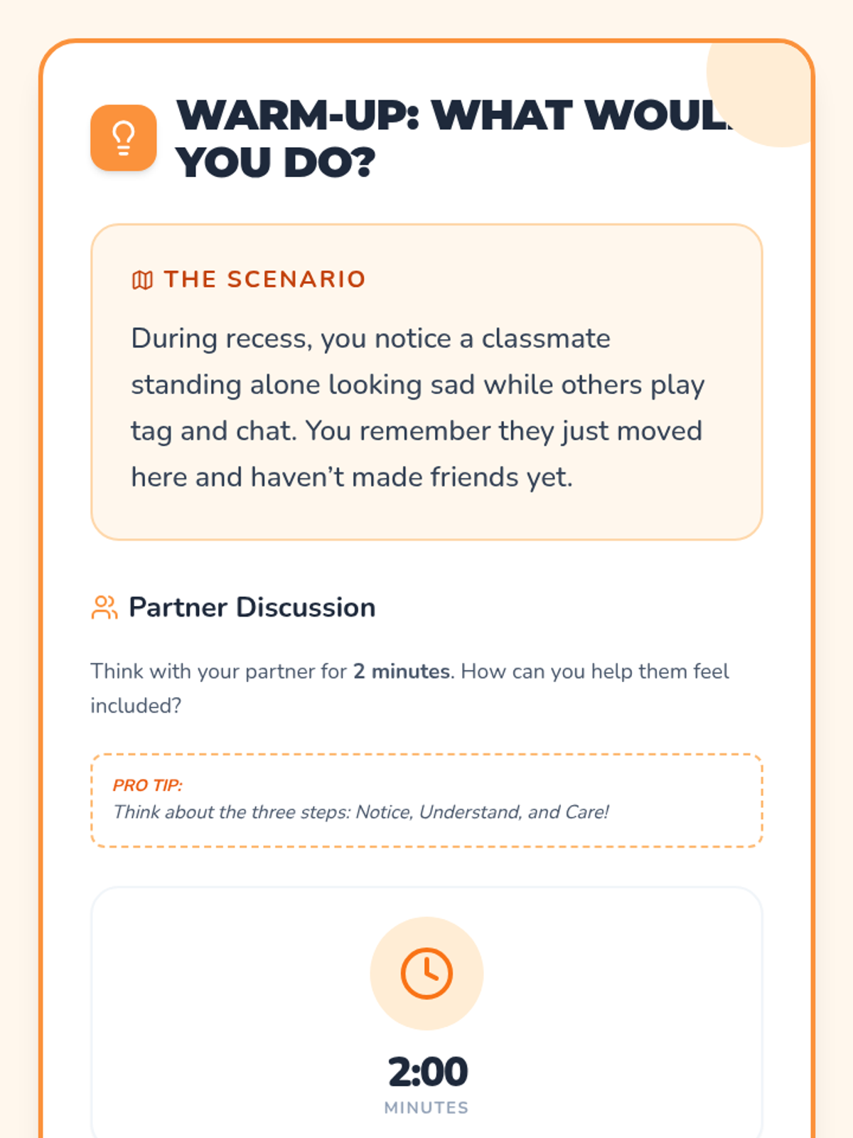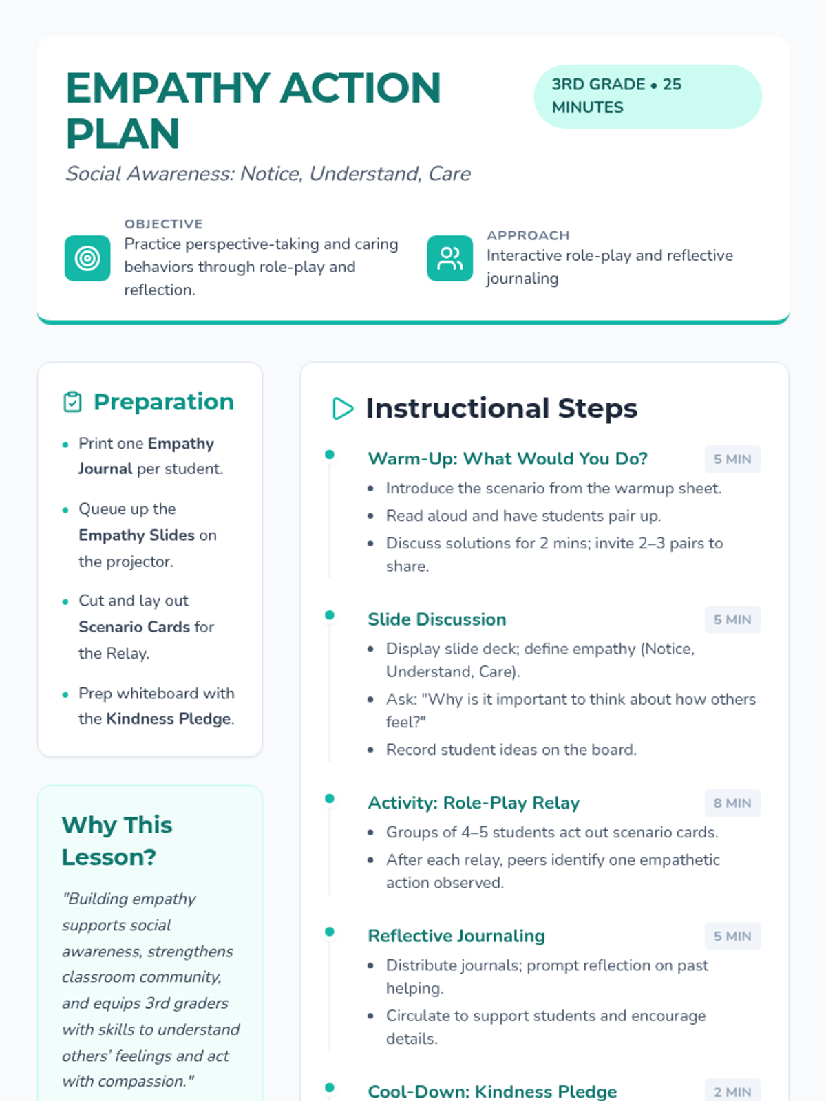 A 25-minute SEL lesson for 3rd graders focused on CASEL's Social Awareness. Students practice perspective-taking through role-play, discussion, and reflective journaling.