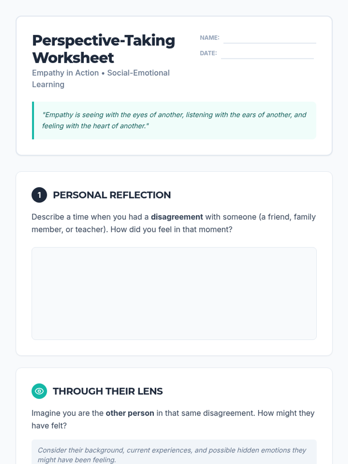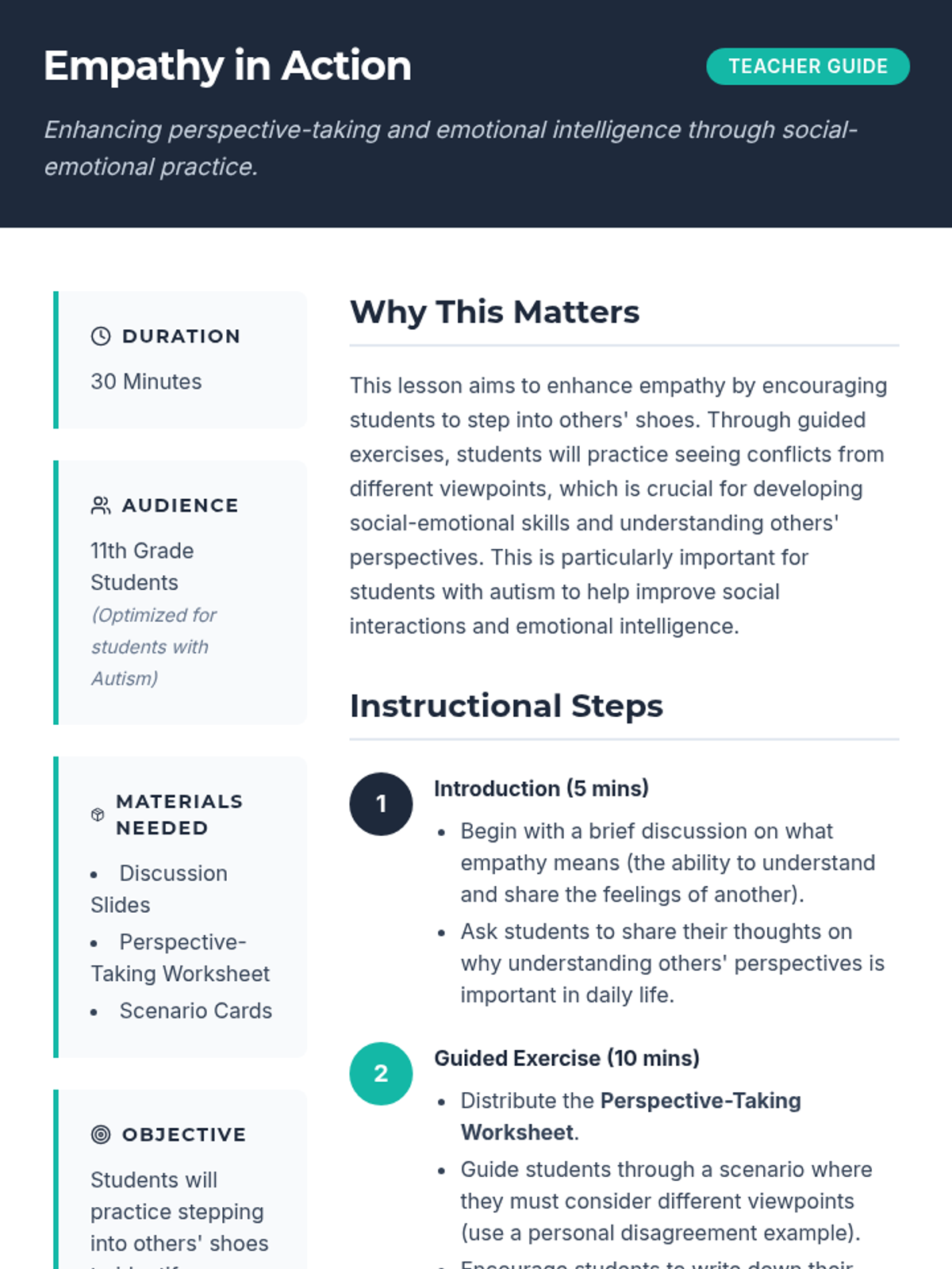 A lesson focused on enhancing empathy through perspective-taking exercises, specifically designed for 11th-grade students to improve social-emotional skills and understanding.