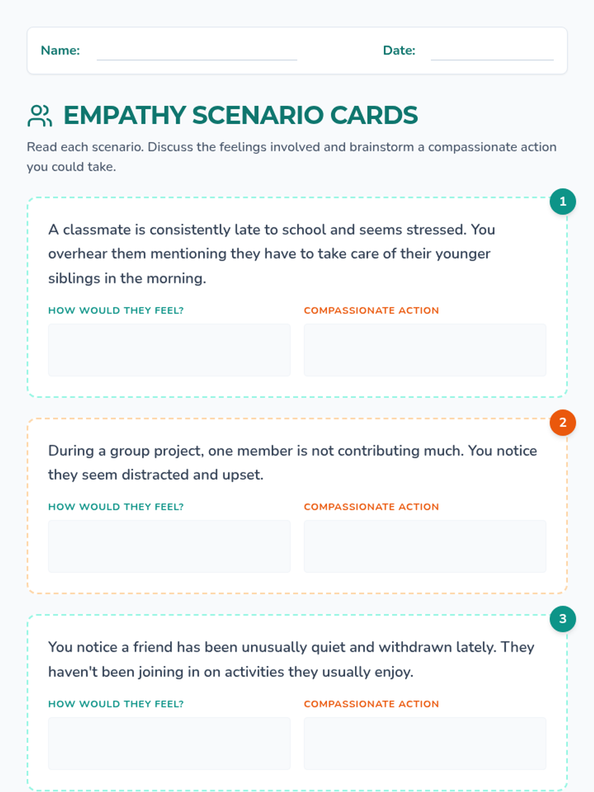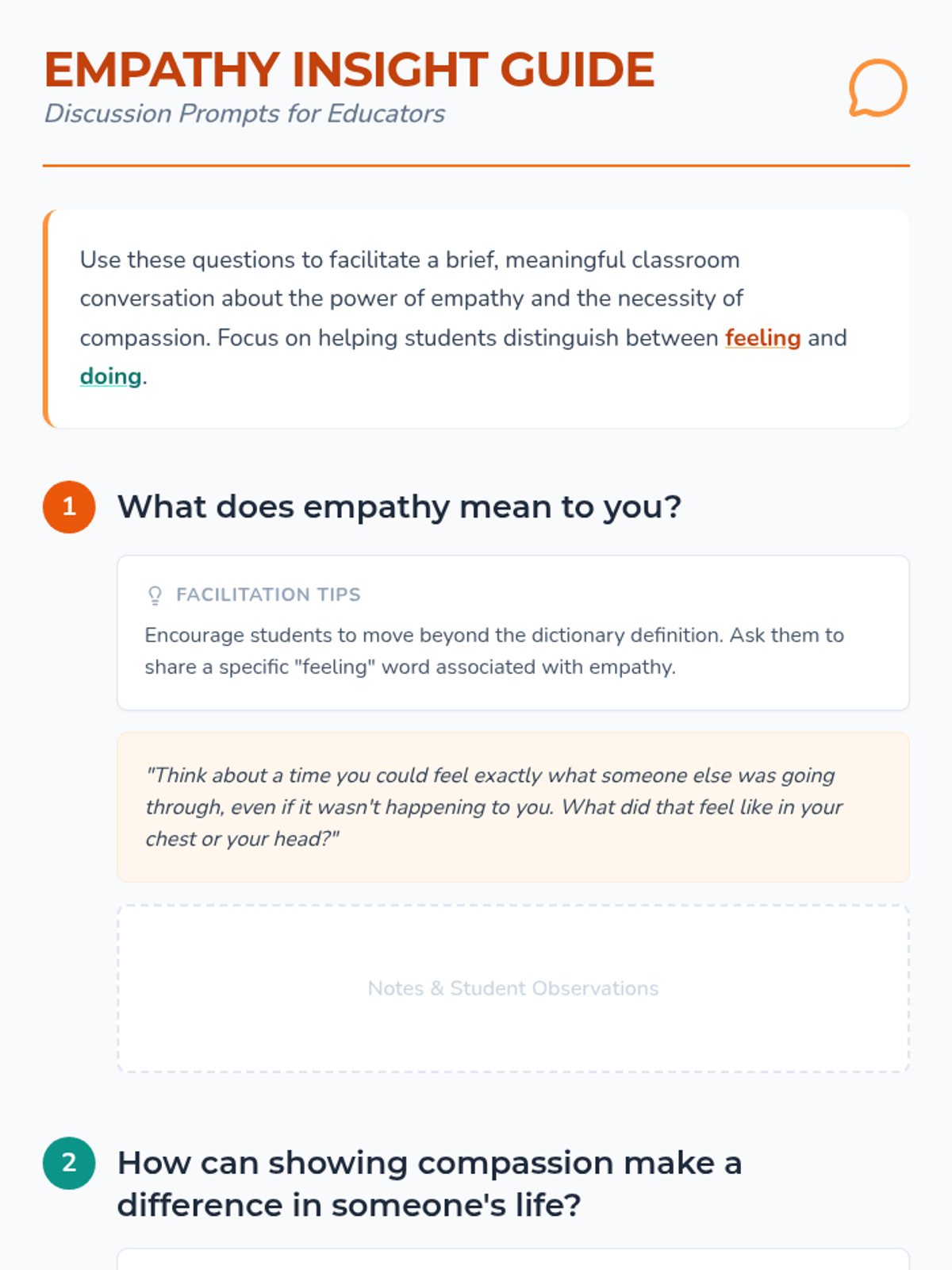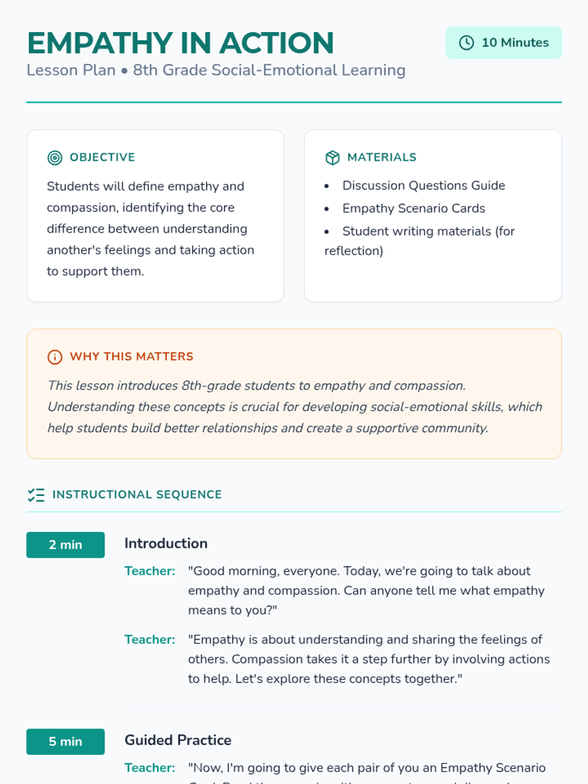 An introductory 10-minute lesson for 8th graders to explore empathy and compassion through discussion and scenario-based role-play. Students will learn the difference between understanding feelings (empathy) and taking action (compassion).