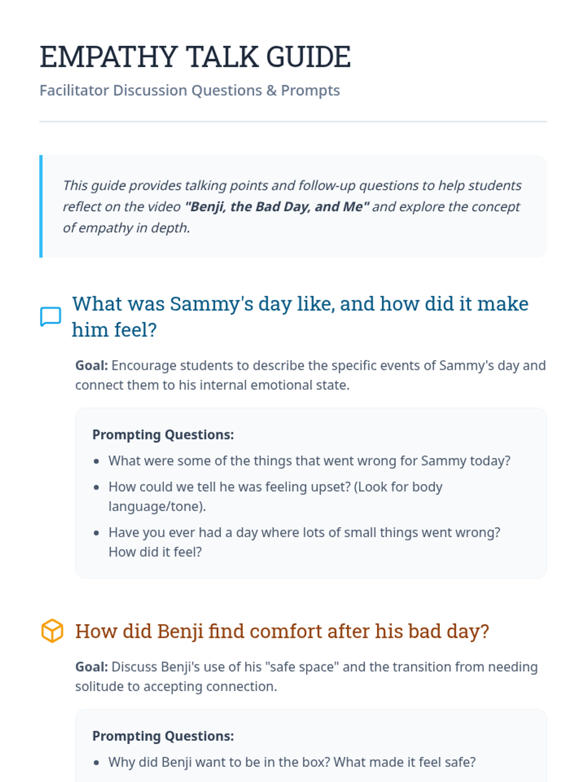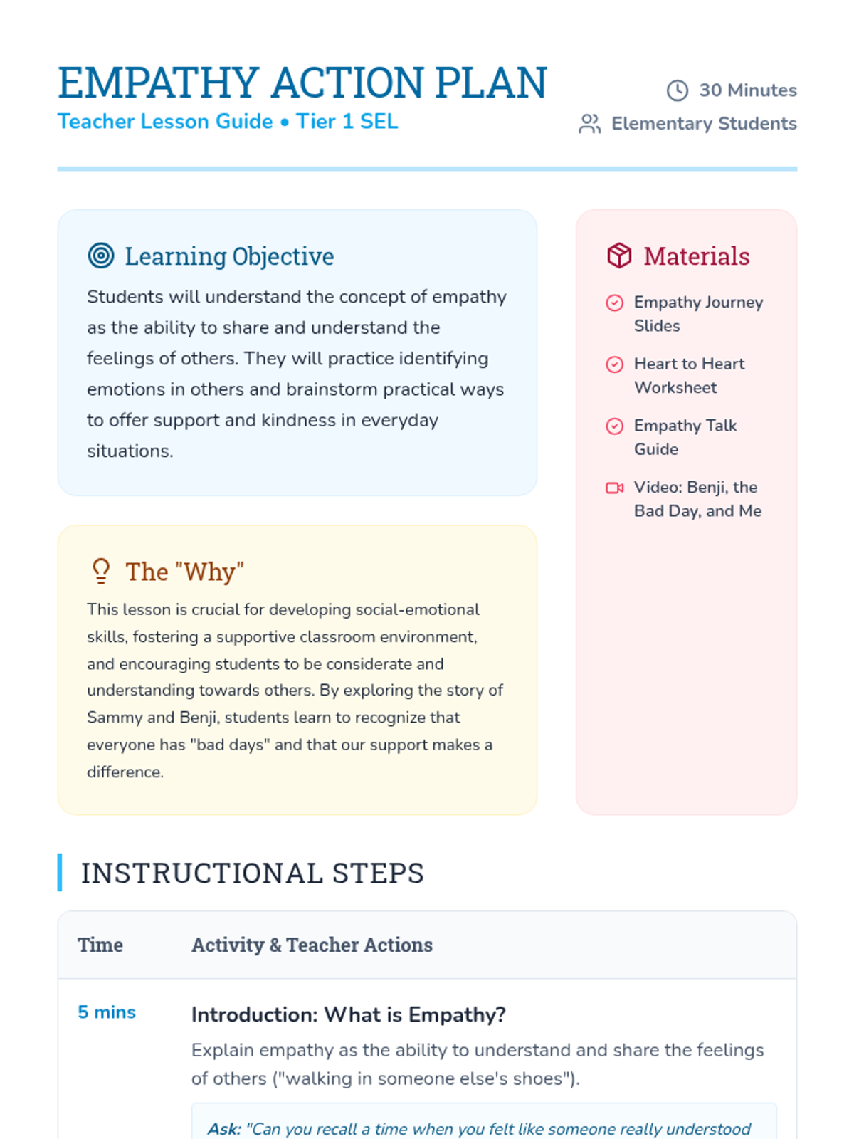 This lesson introduces elementary students to the concept of empathy through the story of Sammy and Benji. Students will learn to recognize emotions, practice perspective-taking, and identify practical ways to show kindness and understanding to others.