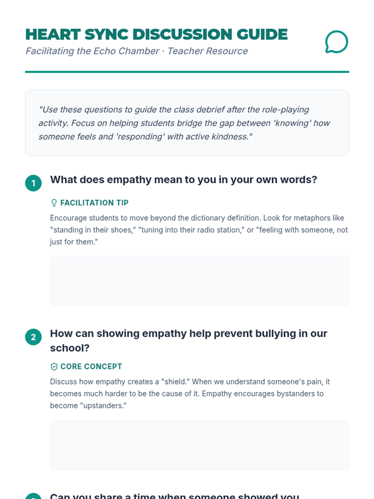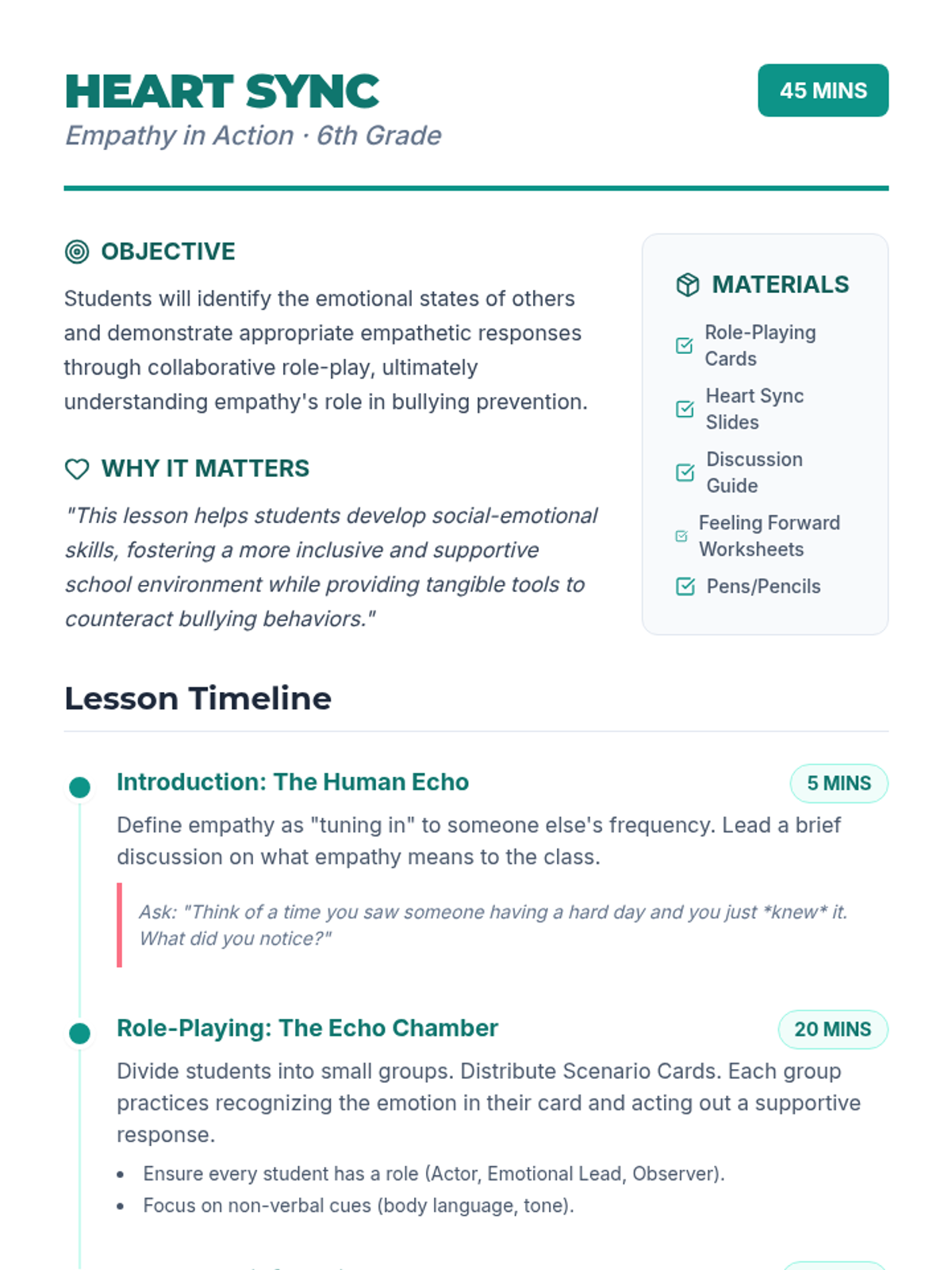 A 45-minute lesson for 6th graders focused on recognizing emotions and responding with empathy to foster a supportive classroom culture and prevent bullying.