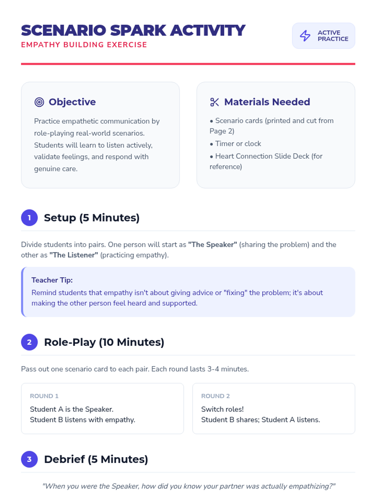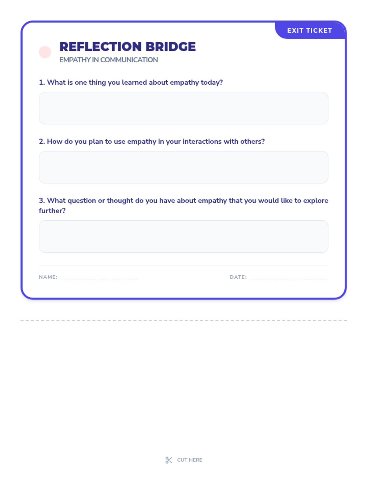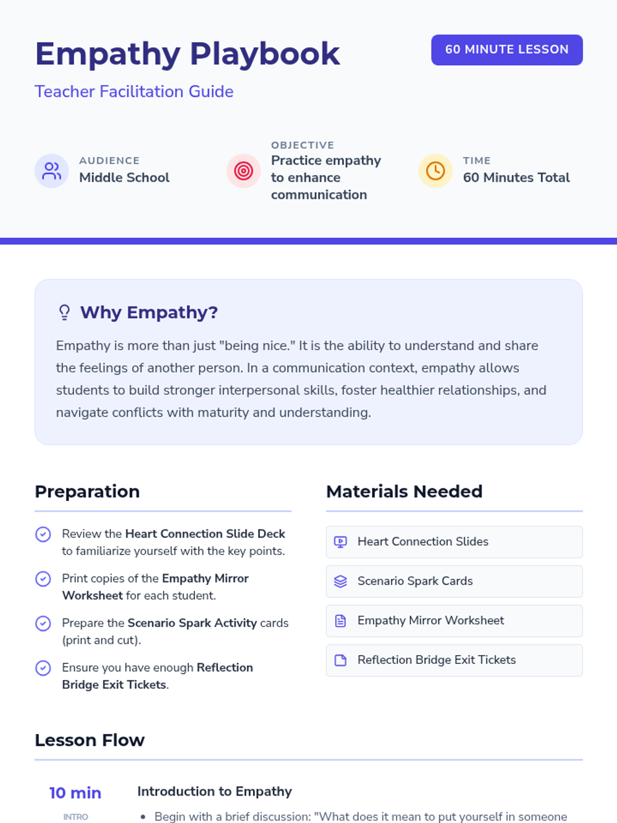 A middle school lesson focused on developing empathy as a core communication skill through interactive exercises, role-playing, and personal reflection.