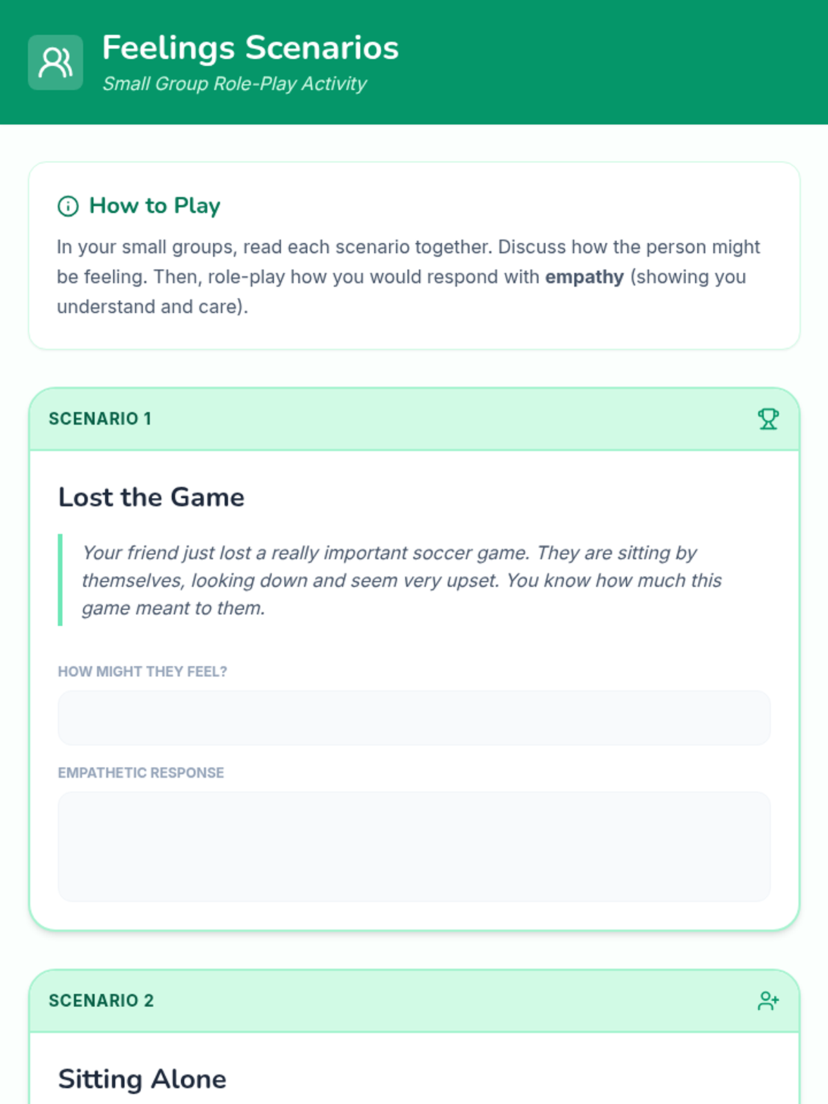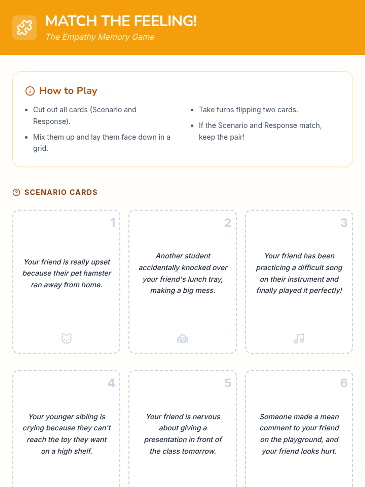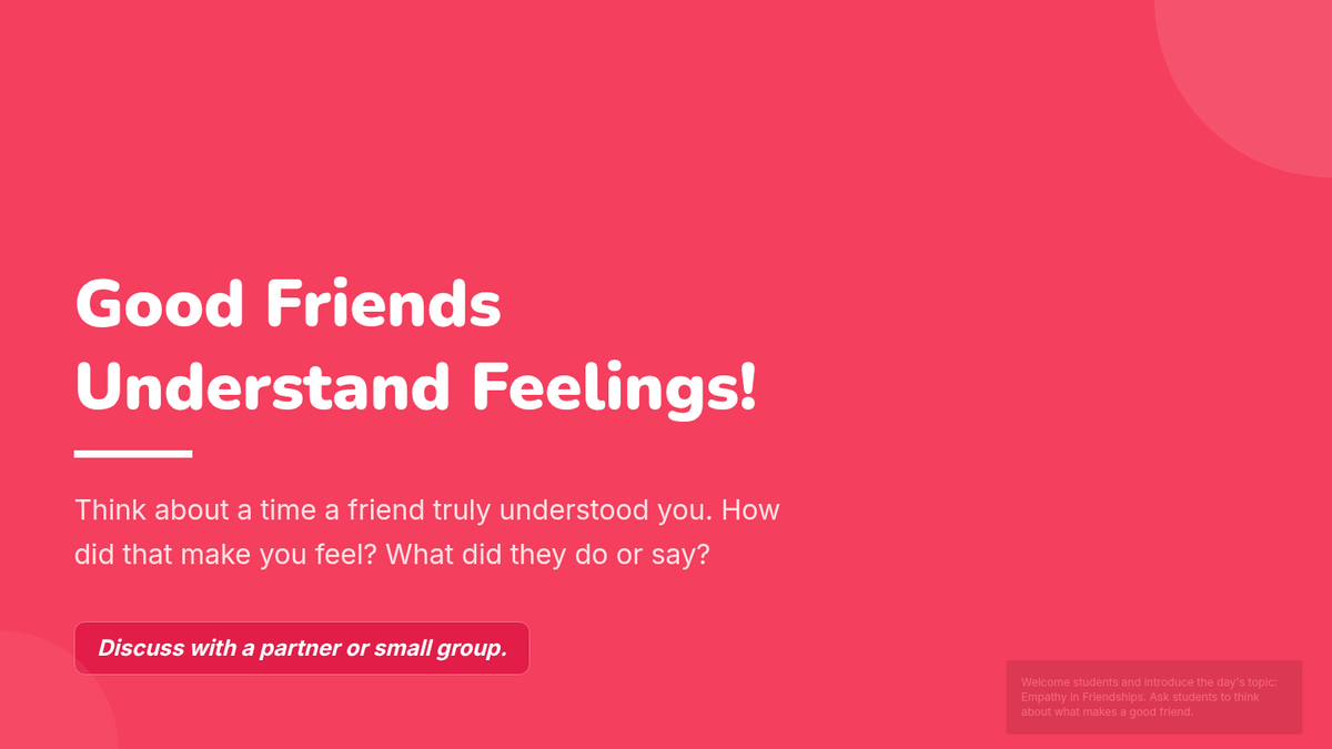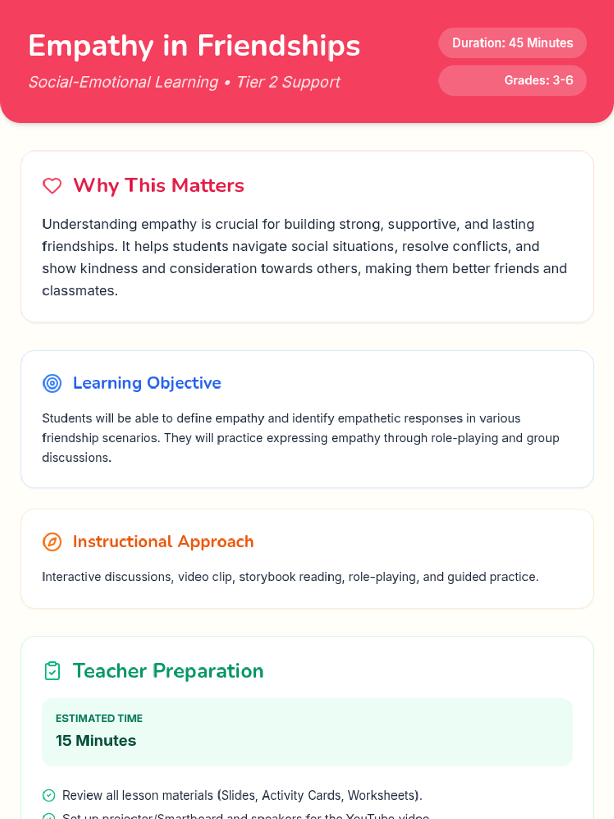 A Tier 2 social-emotional learning lesson for 3rd-6th graders focused on defining empathy, recognizing feelings in others, and practicing supportive responses in friendships.