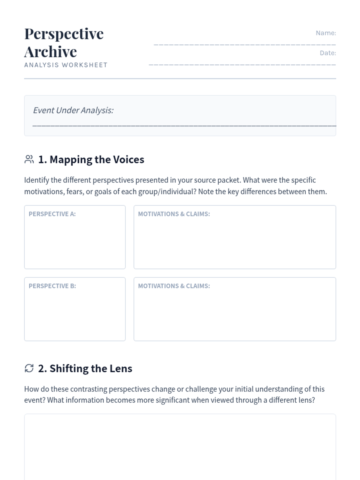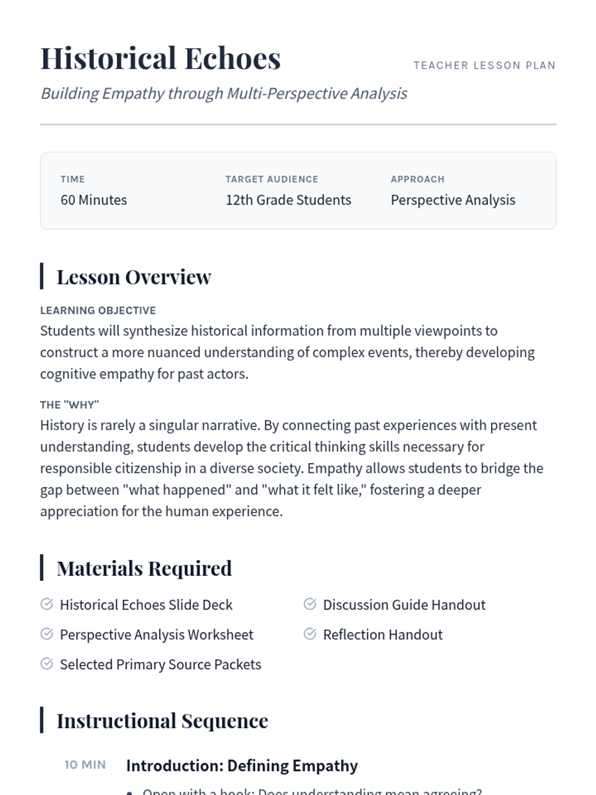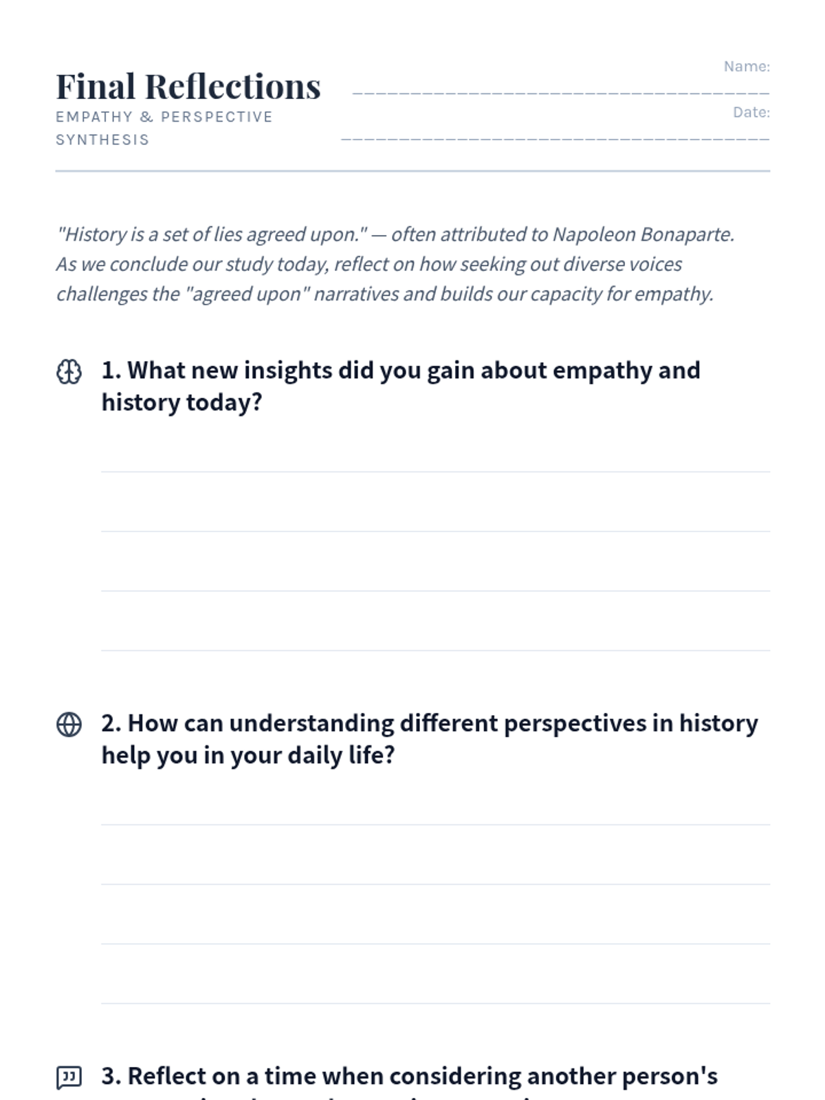 A 12th-grade history lesson that challenges students to analyze historical events through multiple perspectives to build empathy and critical thinking skills. Students examine primary sources to understand the complexity of human experiences in the past.