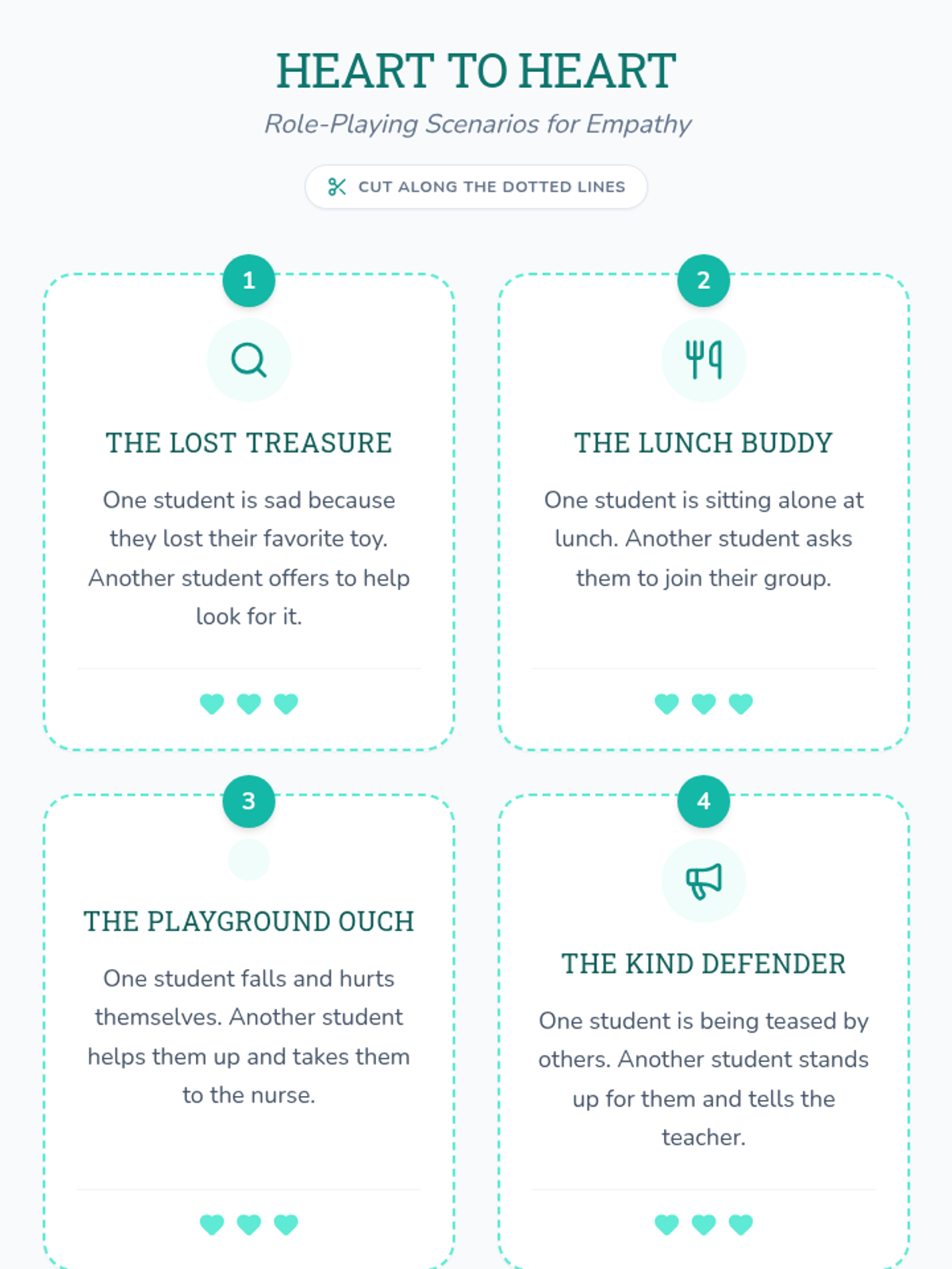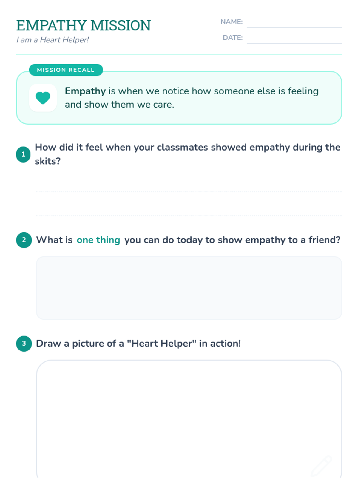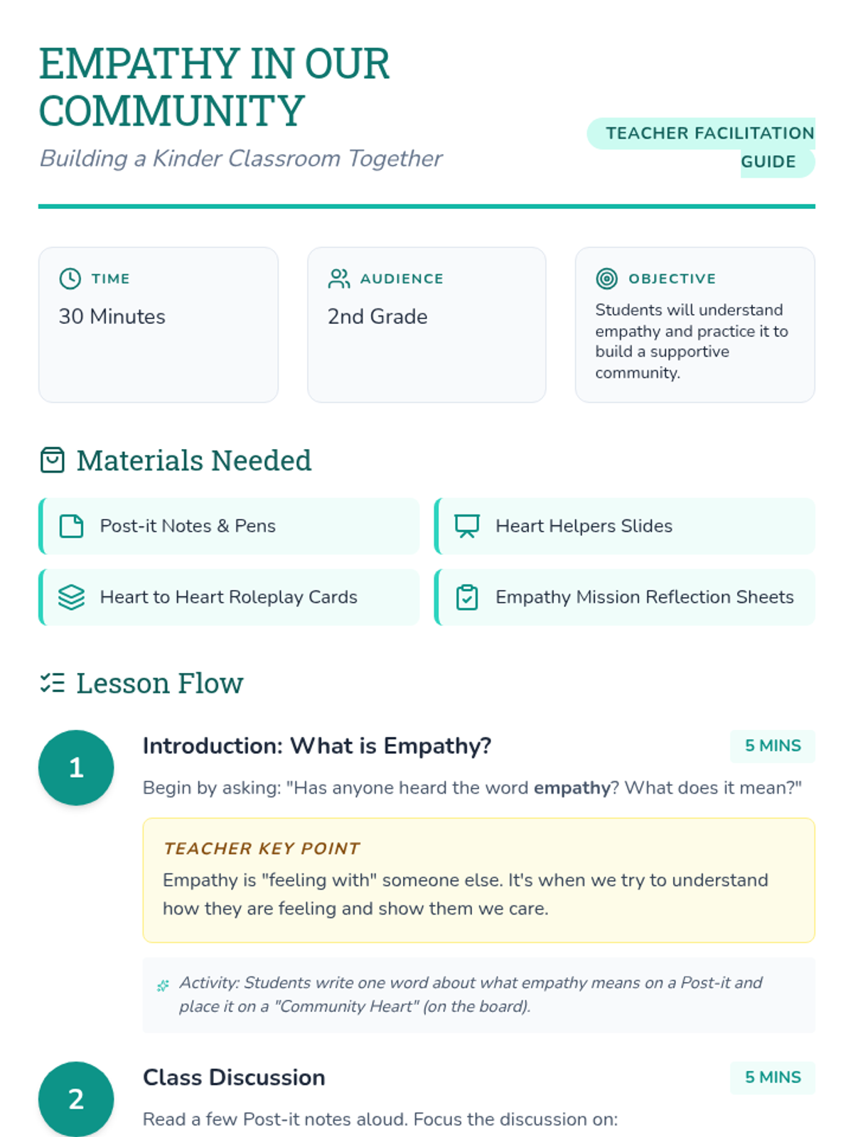 A 30-minute lesson for 2nd graders to understand and practice empathy through role-playing and community discussion. Students learn that empathy is 'feeling with' others and practice specific ways to show they care.