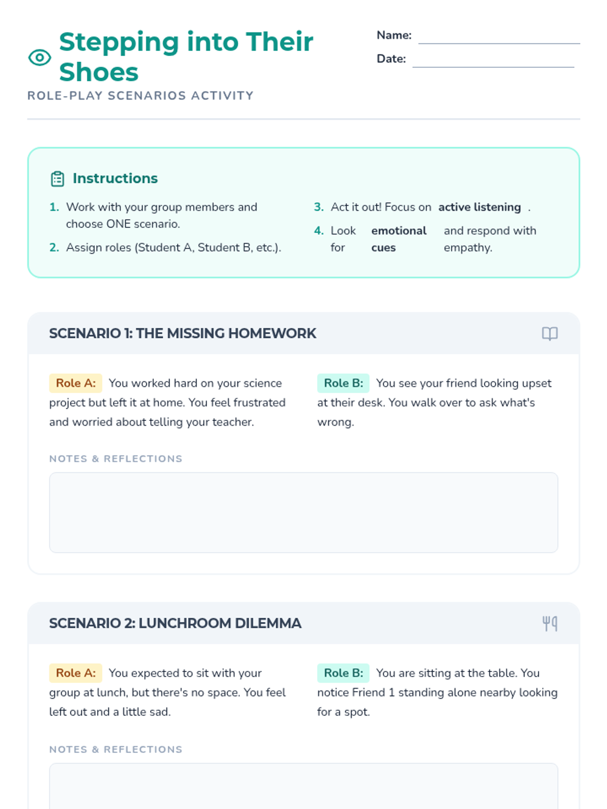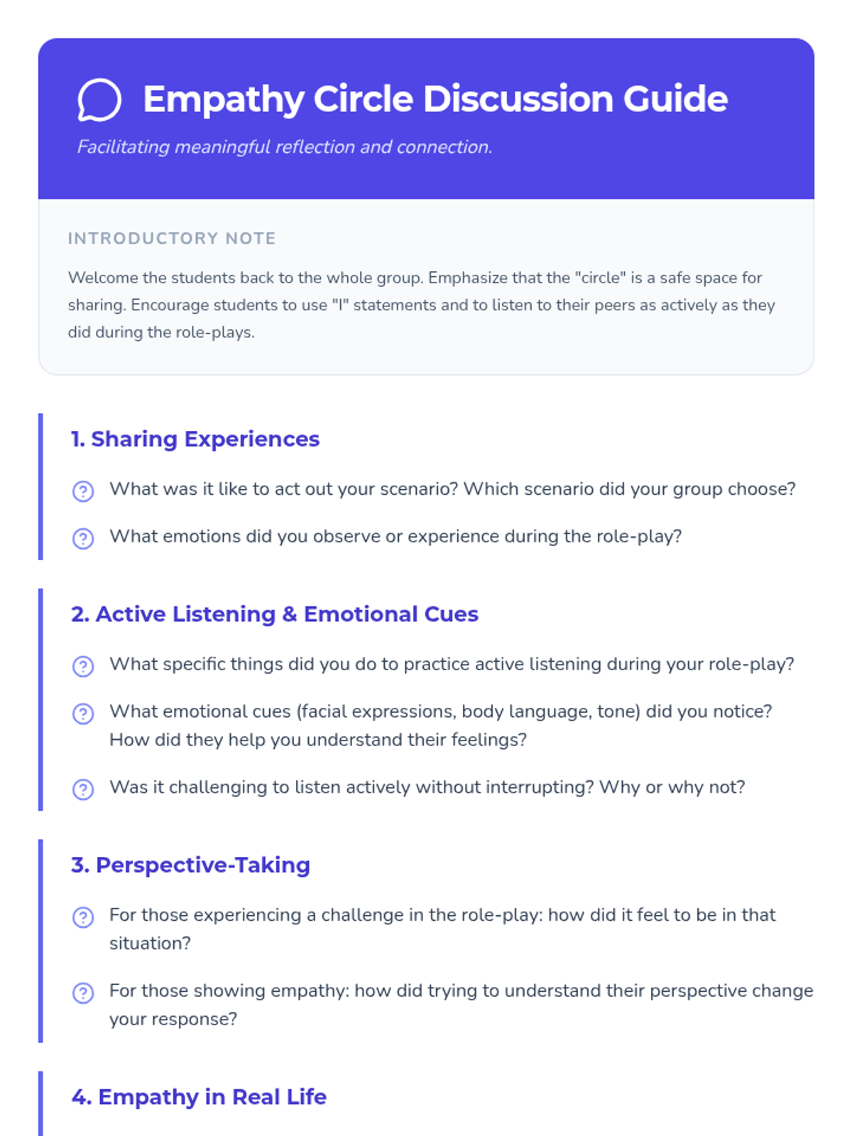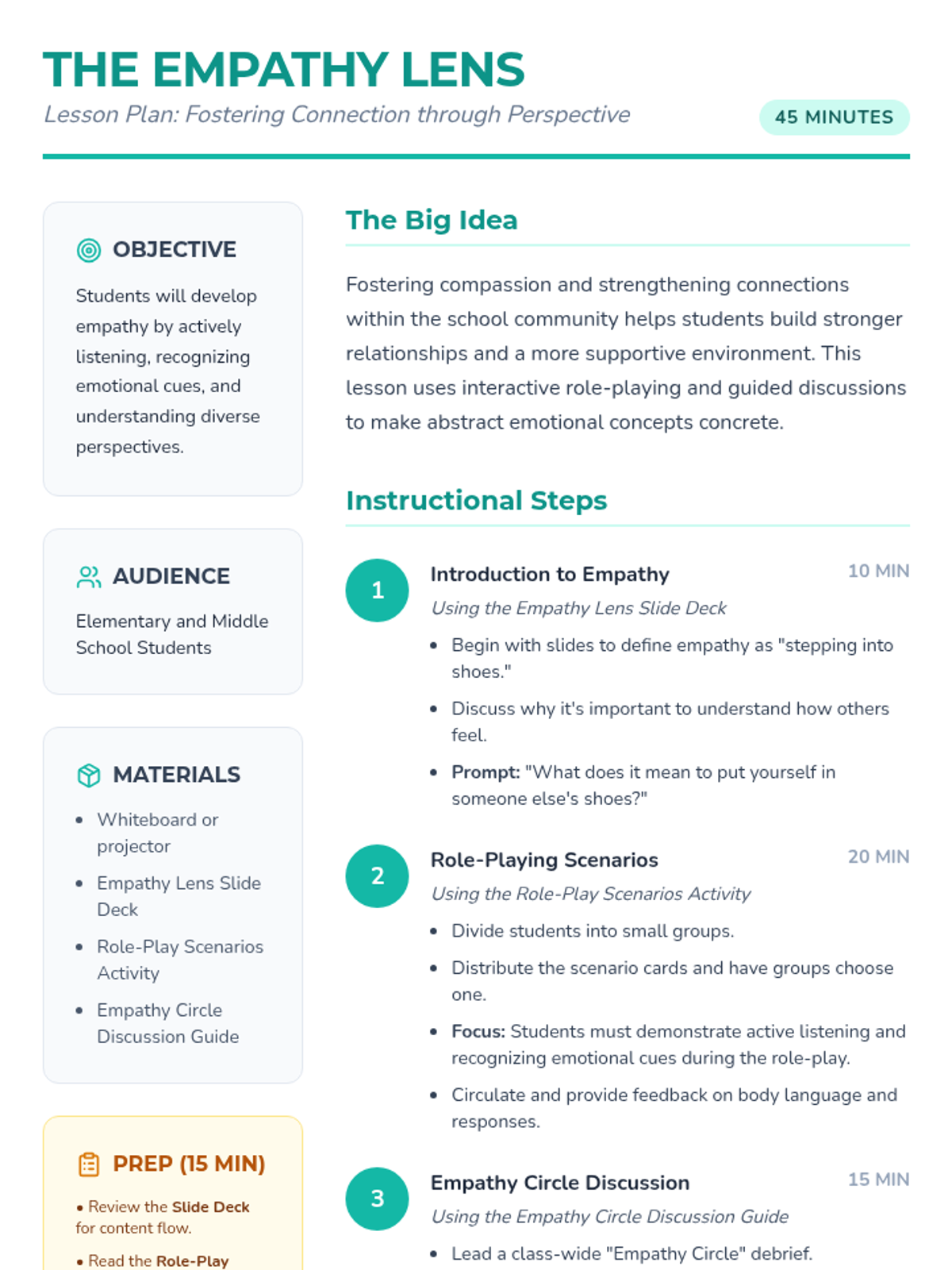 A 45-minute social-emotional learning lesson focused on developing empathy through active listening and role-playing scenarios. Students learn to recognize emotional cues and practice perspective-taking to build a kinder school community.