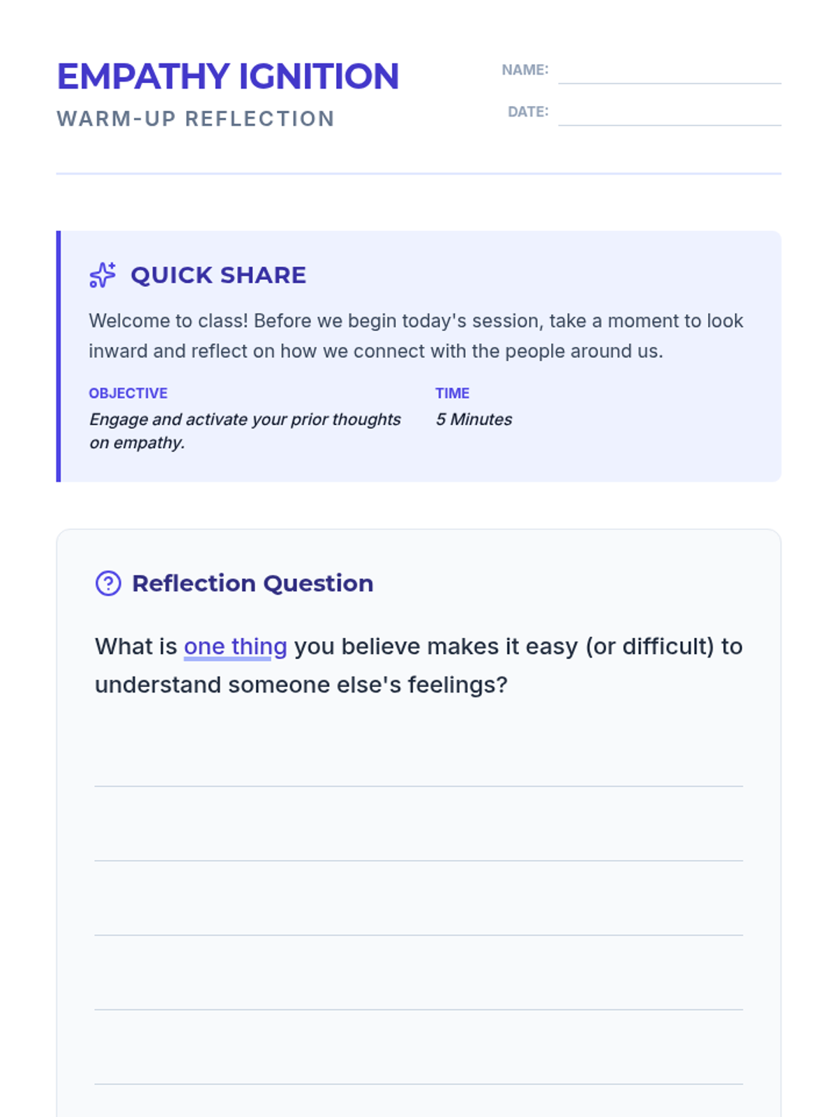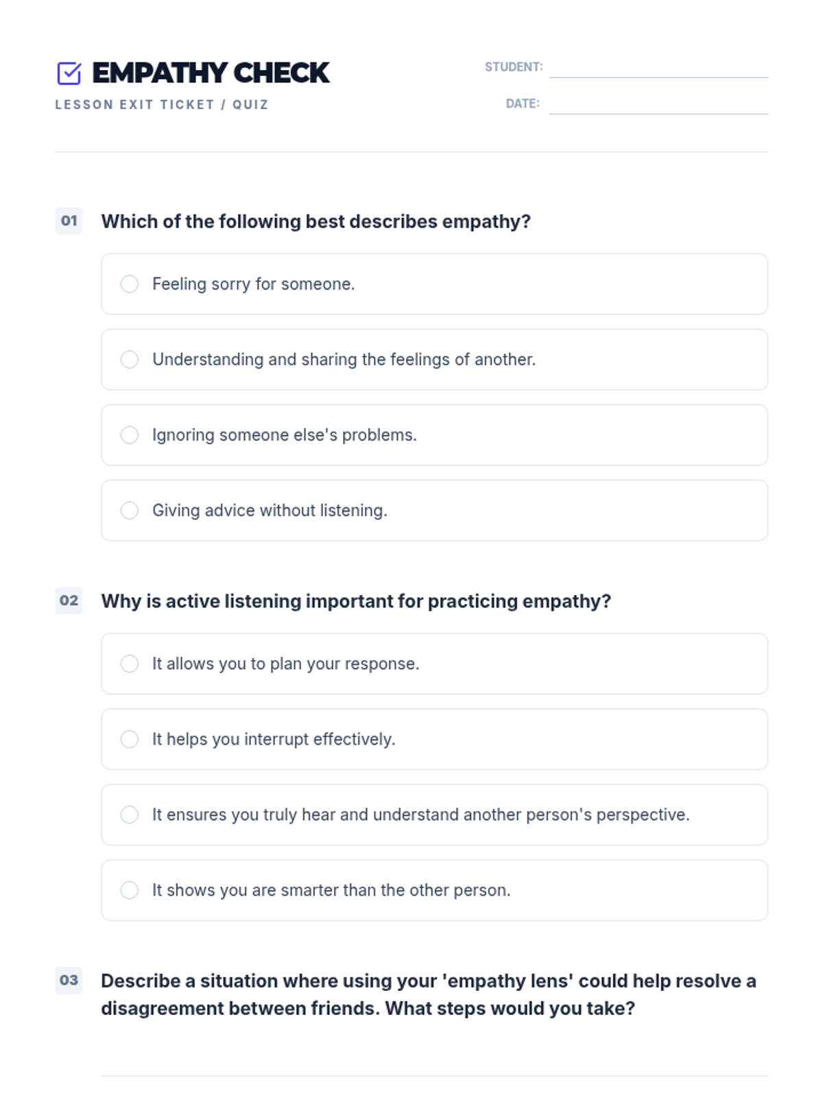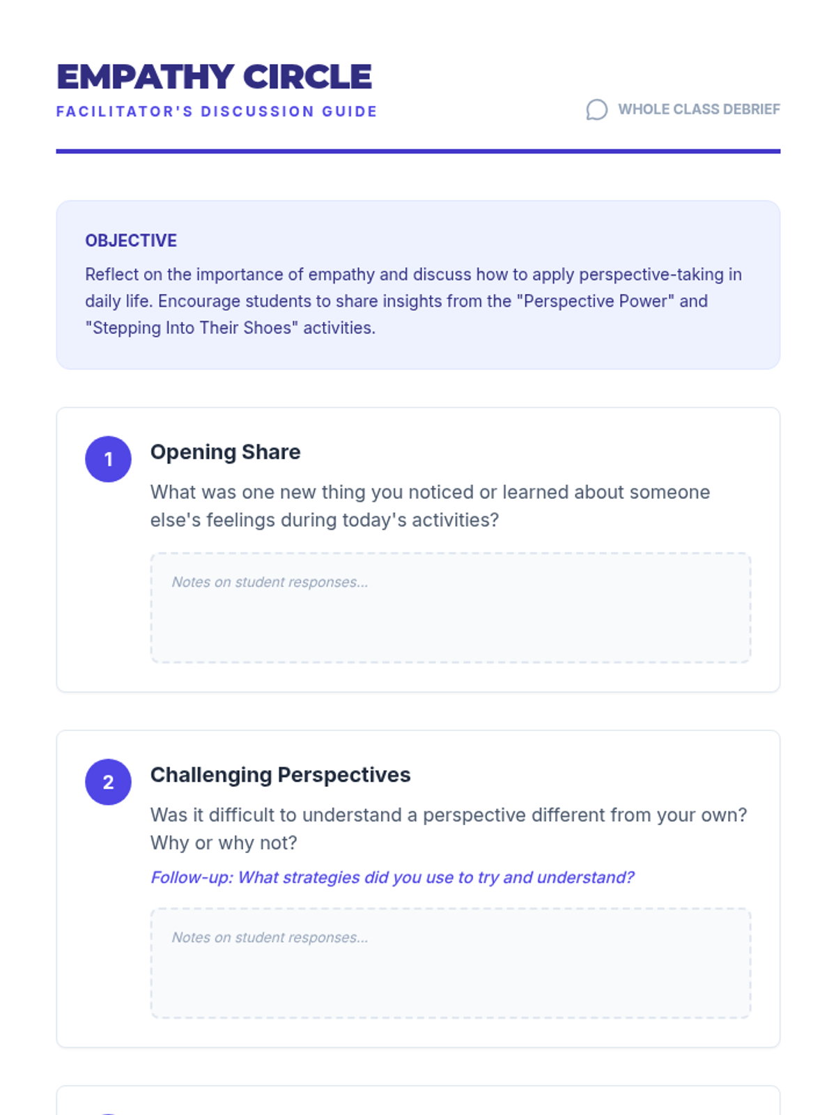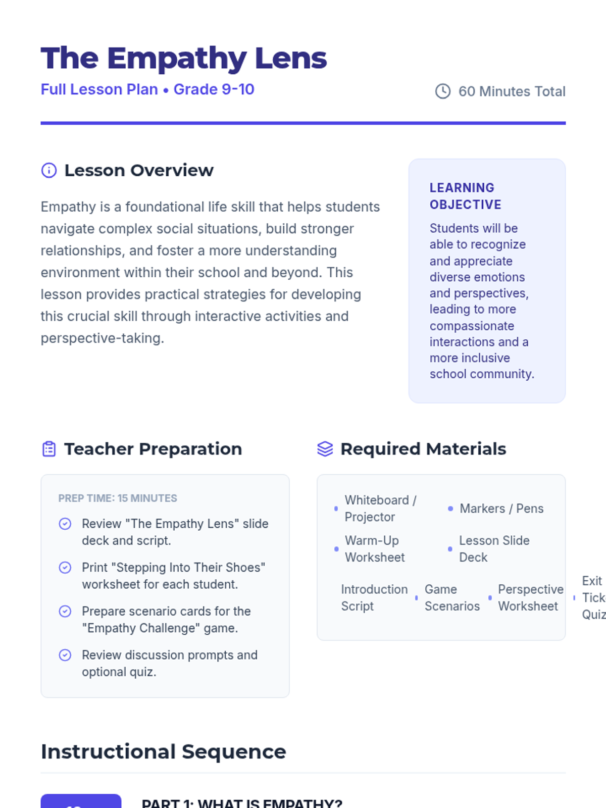 A 60-minute lesson for 9th-10th grade students focused on developing empathy through storytelling, perspective-taking exercises, and collaborative games. Students will learn to recognize emotions in others and practice strategies for building a more inclusive community.