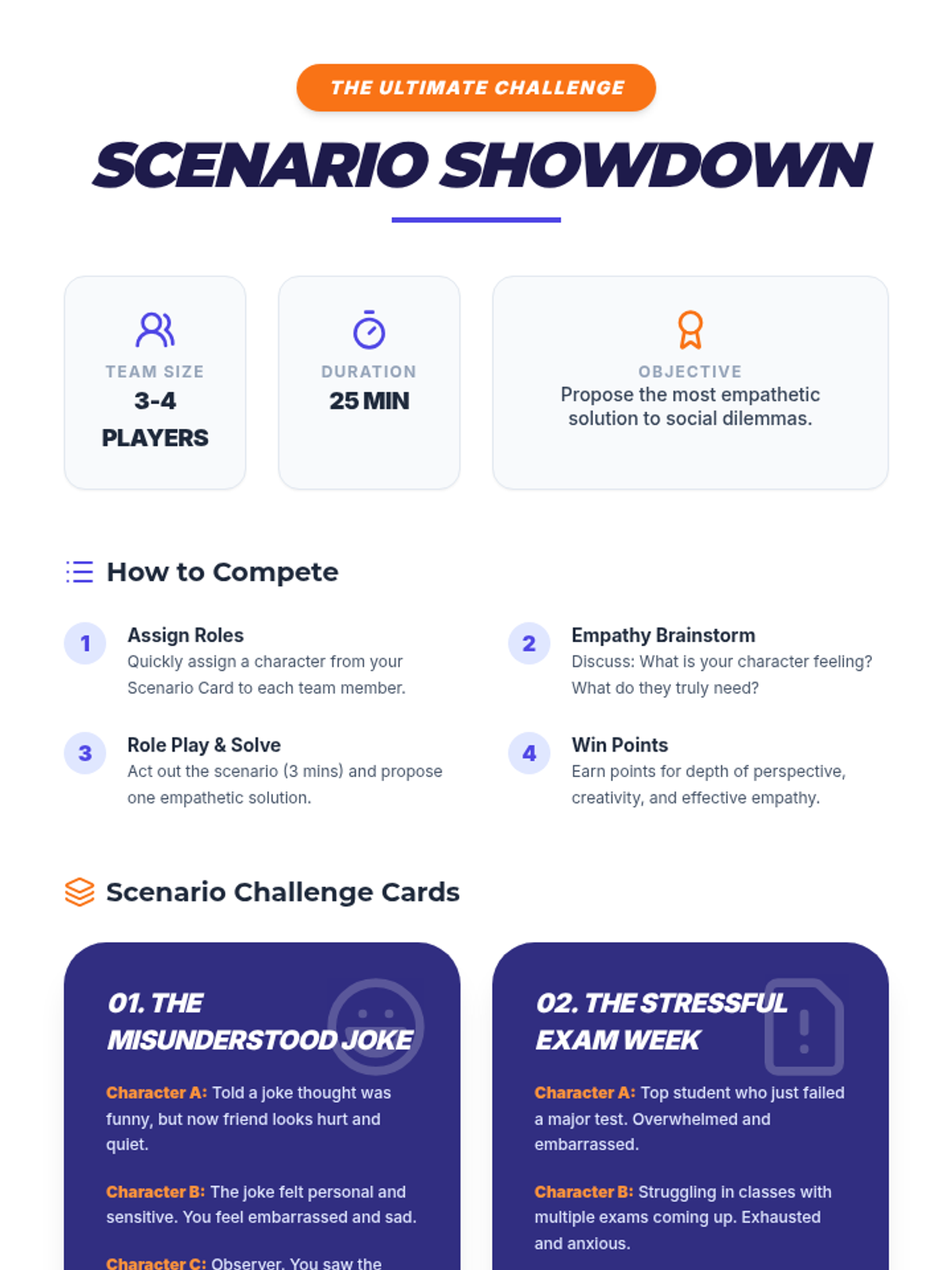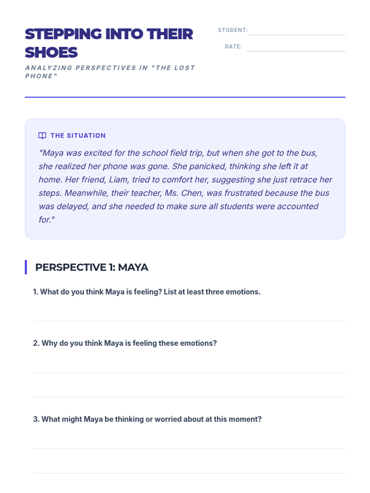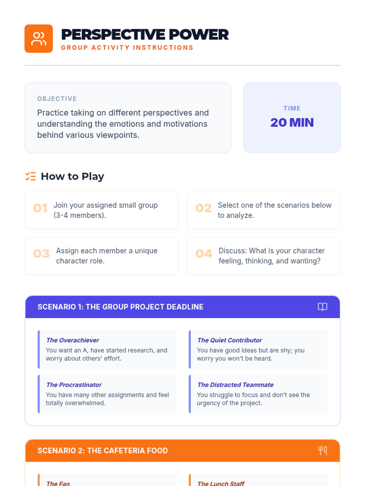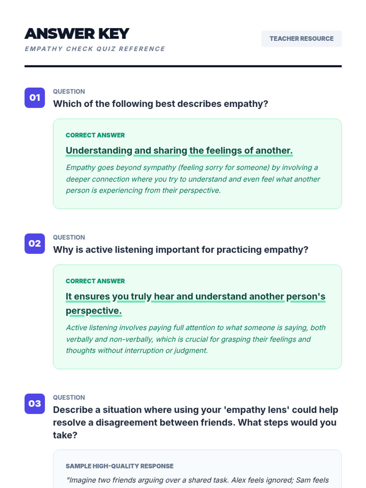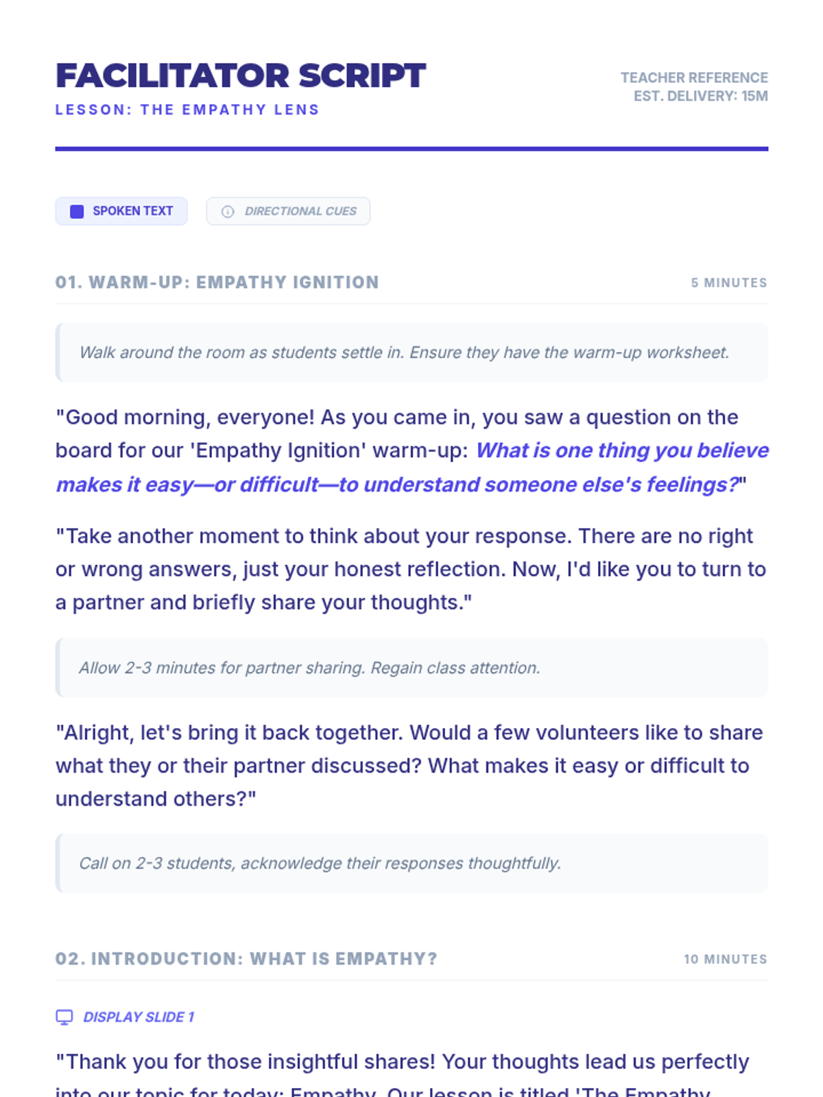 A 60-minute lesson for 9th-10th grade students focused on developing empathy through storytelling, perspective-taking exercises, and collaborative games. Students will learn to recognize emotions in others and practice strategies for building a more inclusive community.