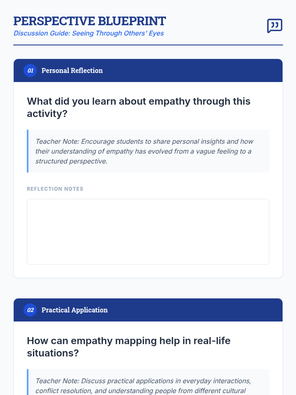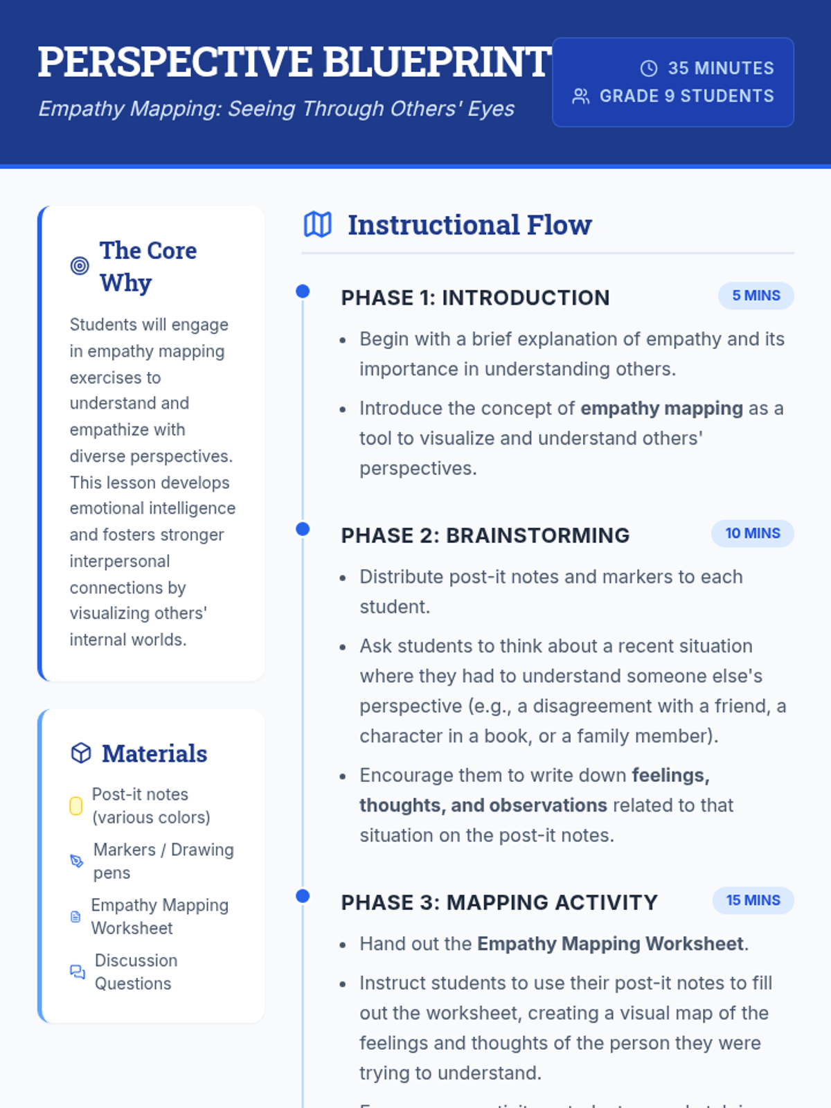 A lesson designed for 9th-grade students to develop emotional intelligence by creating visual maps of others' feelings and perspectives. Through brainstorming and mapping, students learn to navigate complex social situations with empathy.