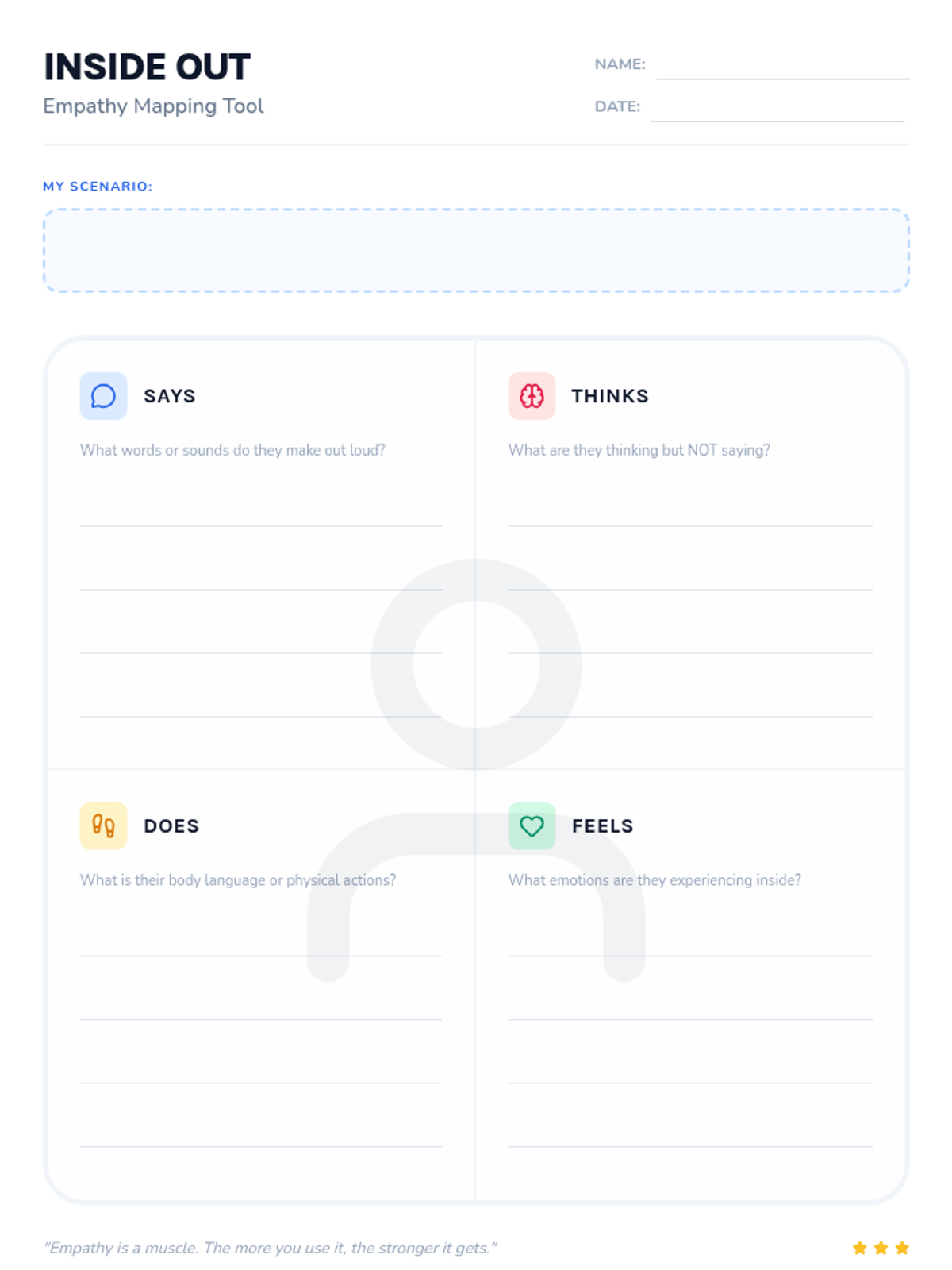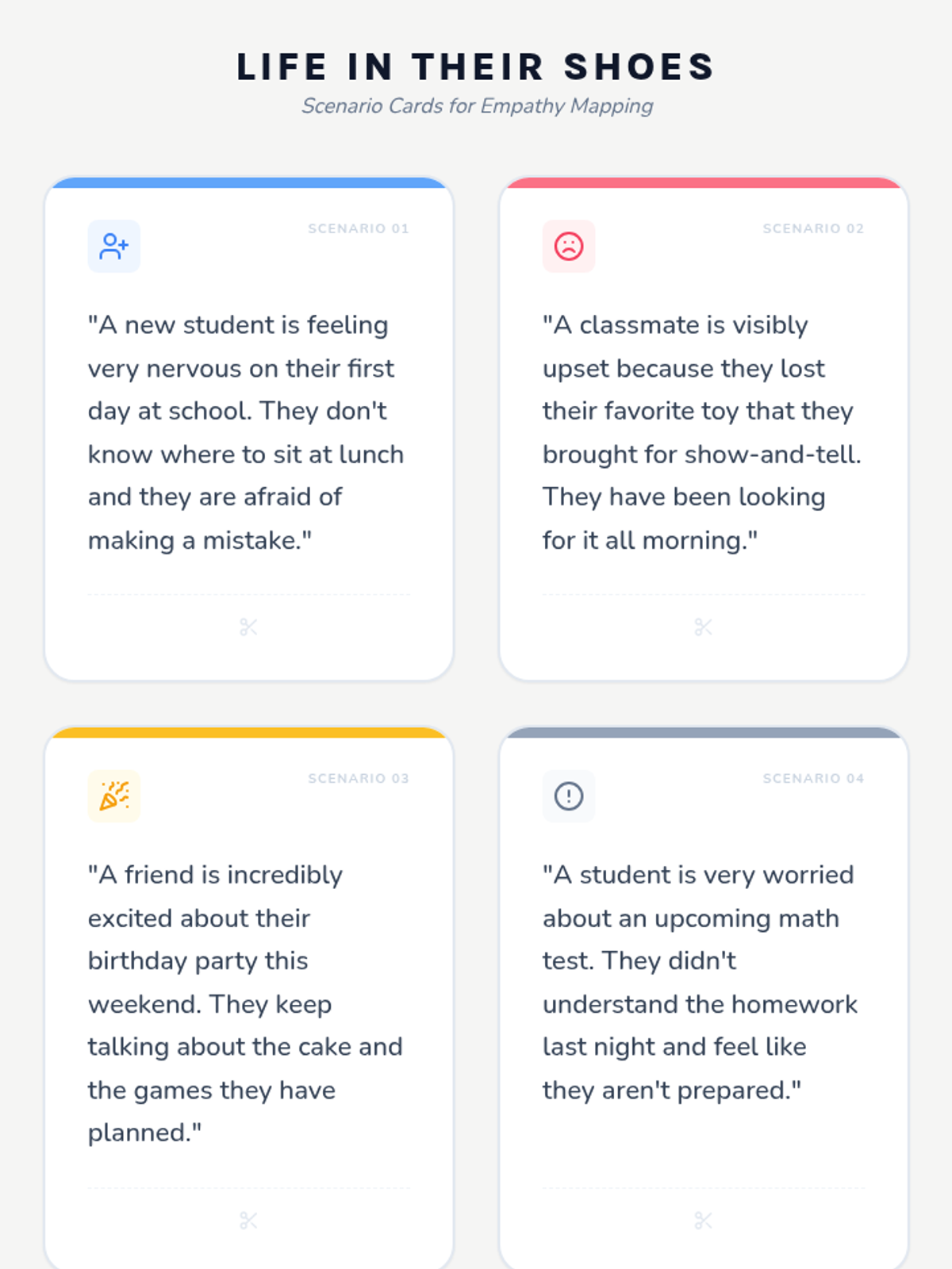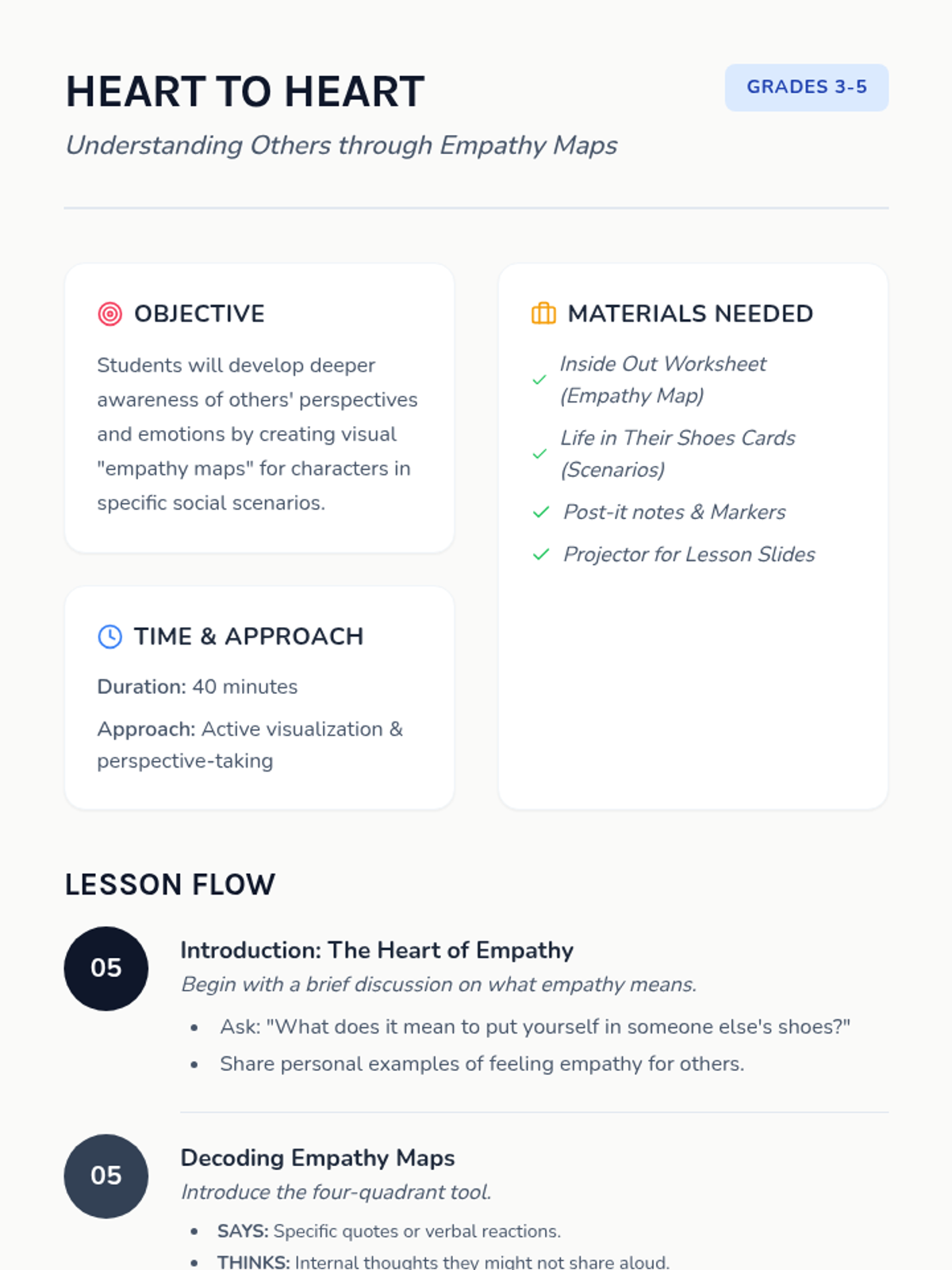 A lesson where students create empathy maps to visualize the thoughts, needs, and feelings of others based on various scenarios.