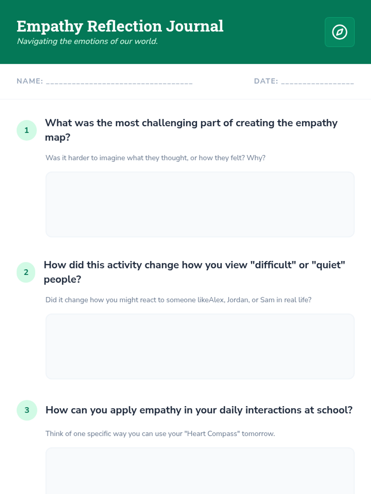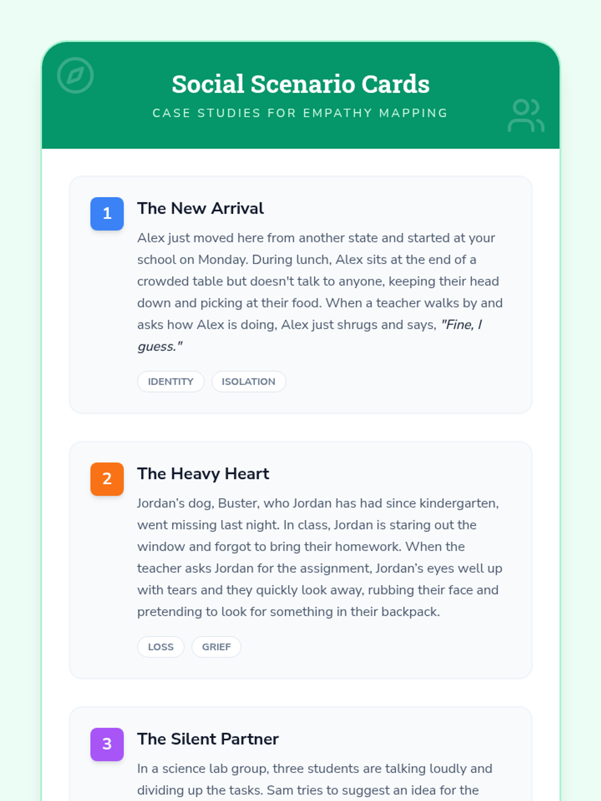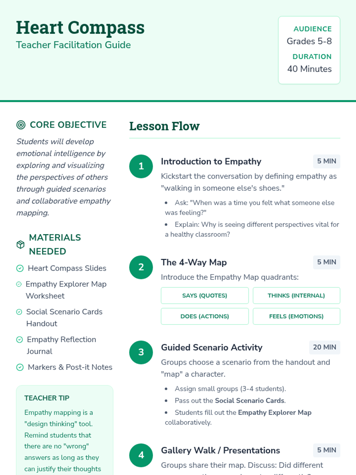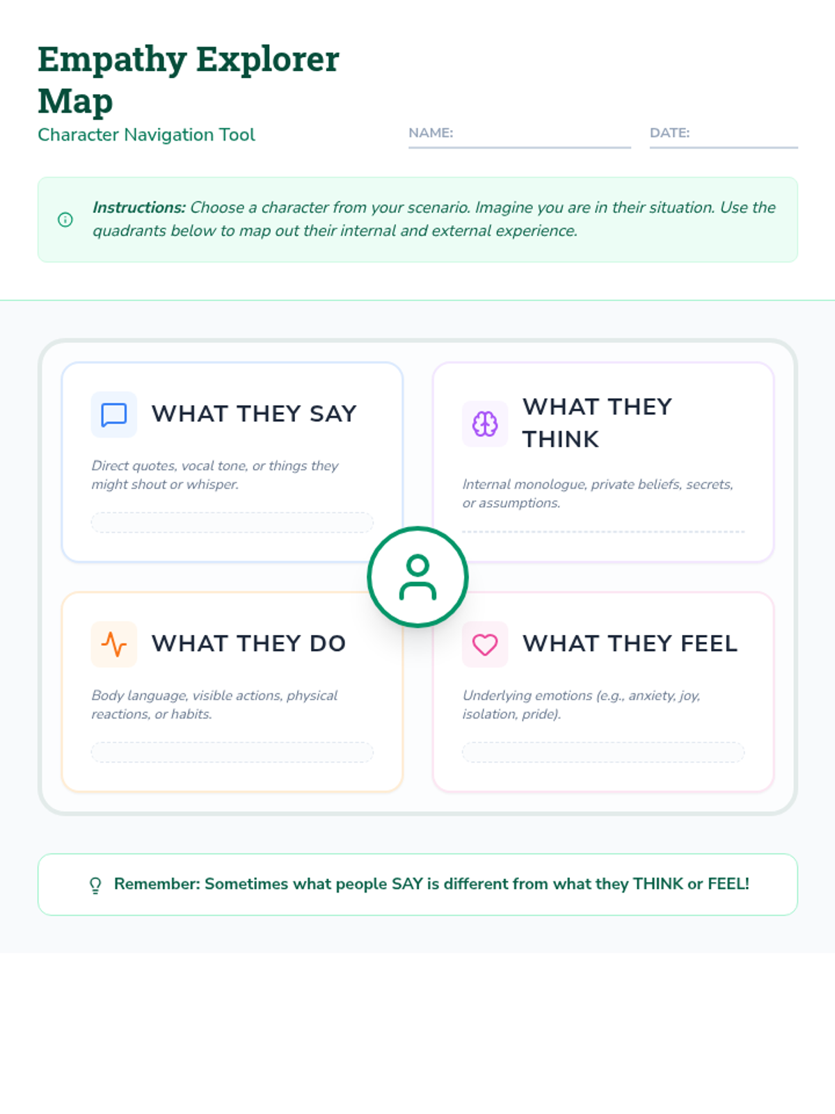 A social-emotional learning lesson where students use empathy mapping to understand and visualize the perspectives, feelings, and actions of others through relatable classroom scenarios.