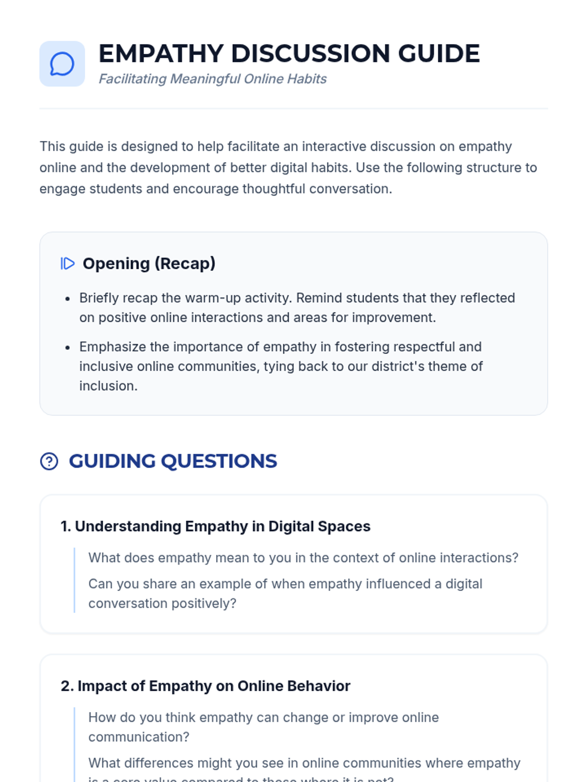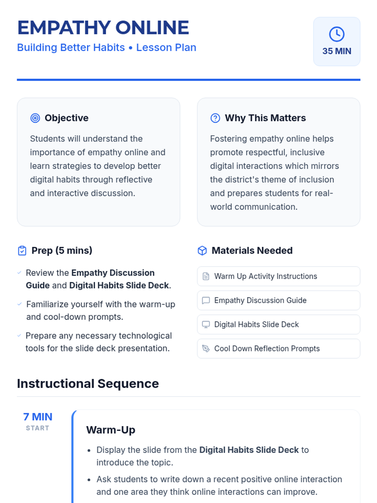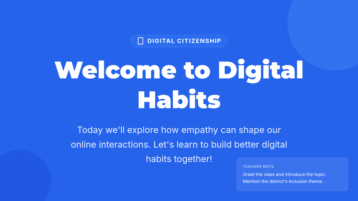 A 35-minute lesson for 10th grade advisory focusing on fostering empathy in online interactions and developing better digital habits to promote inclusion.