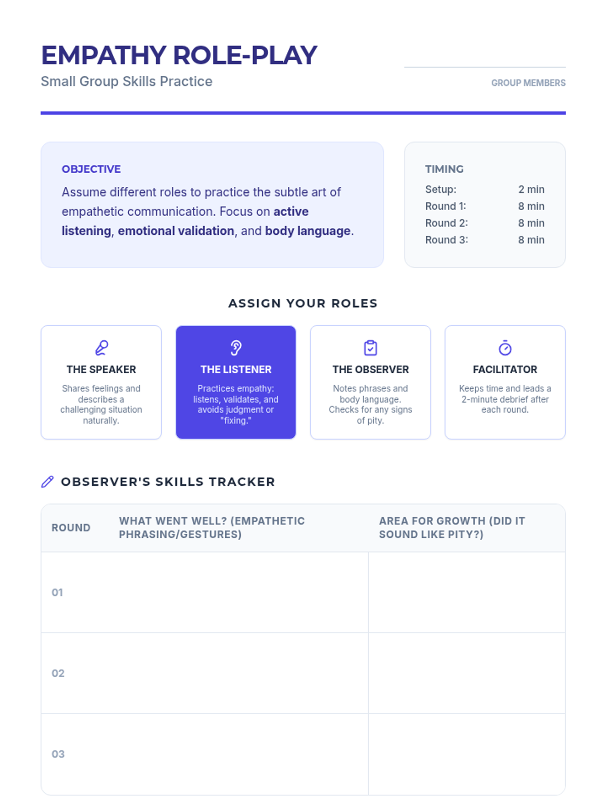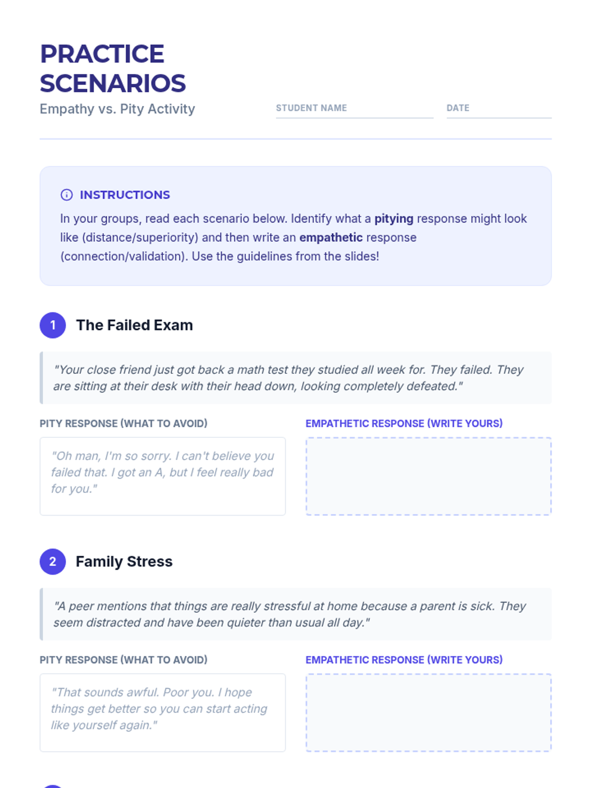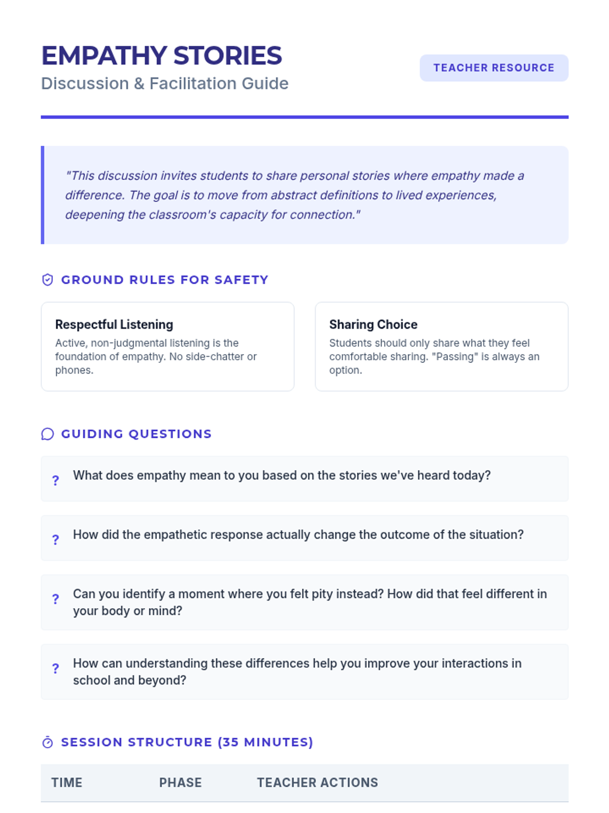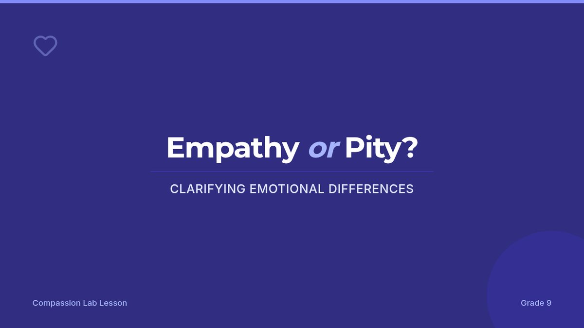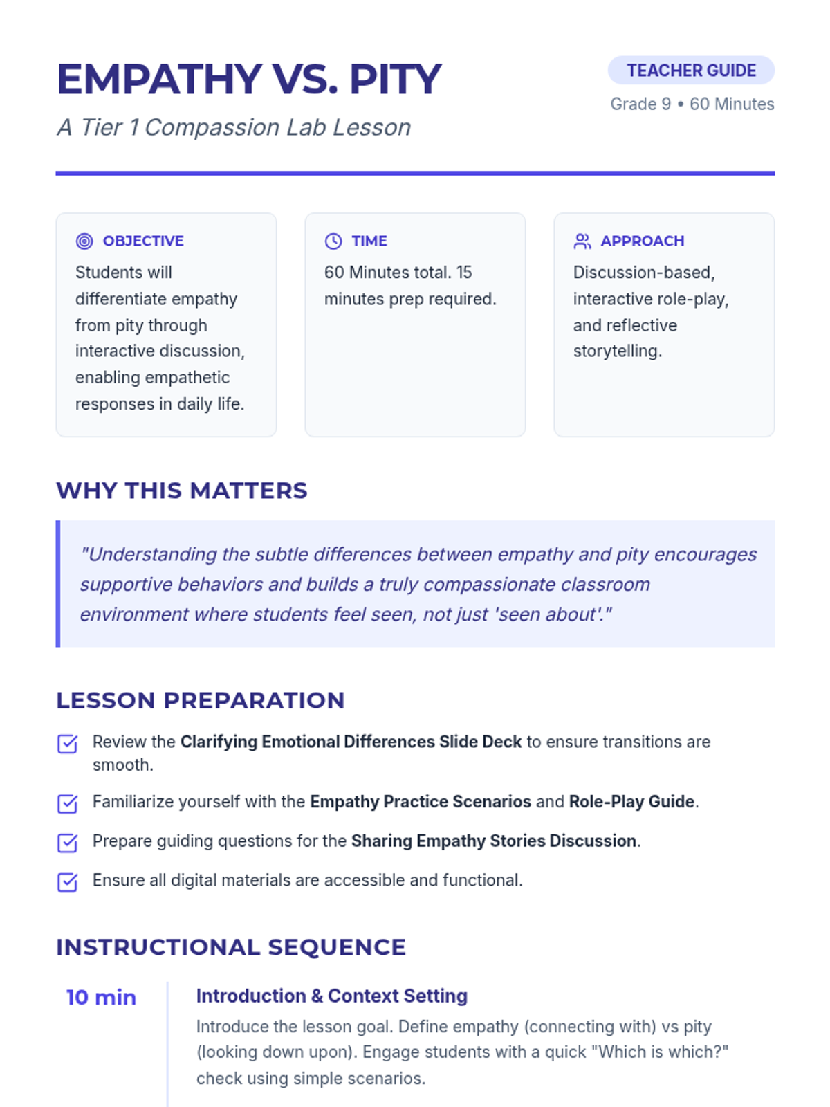A 60-minute interactive lesson for 9th graders designed to distinguish empathy from pity through storytelling, role-play, and reflective discussion. Students will build practical skills for fostering a compassionate classroom community.