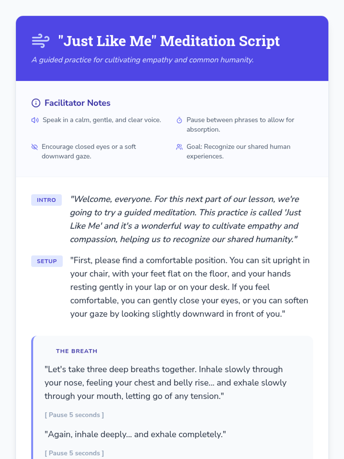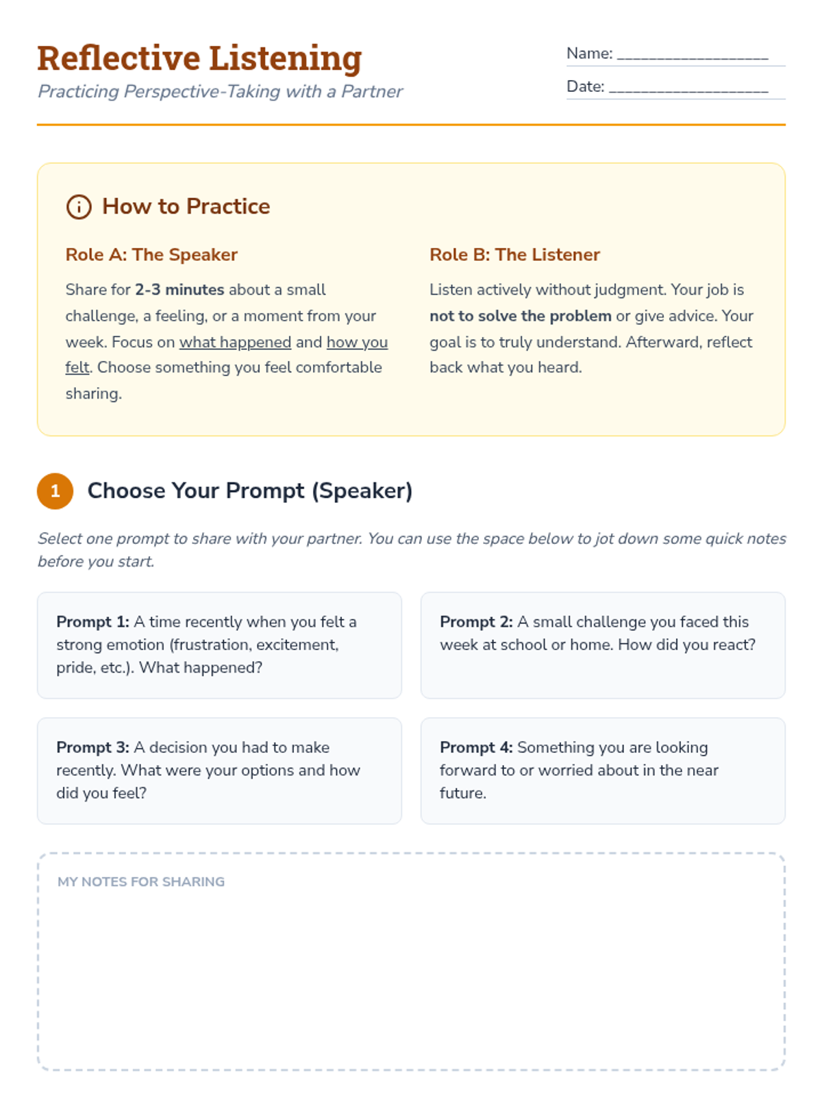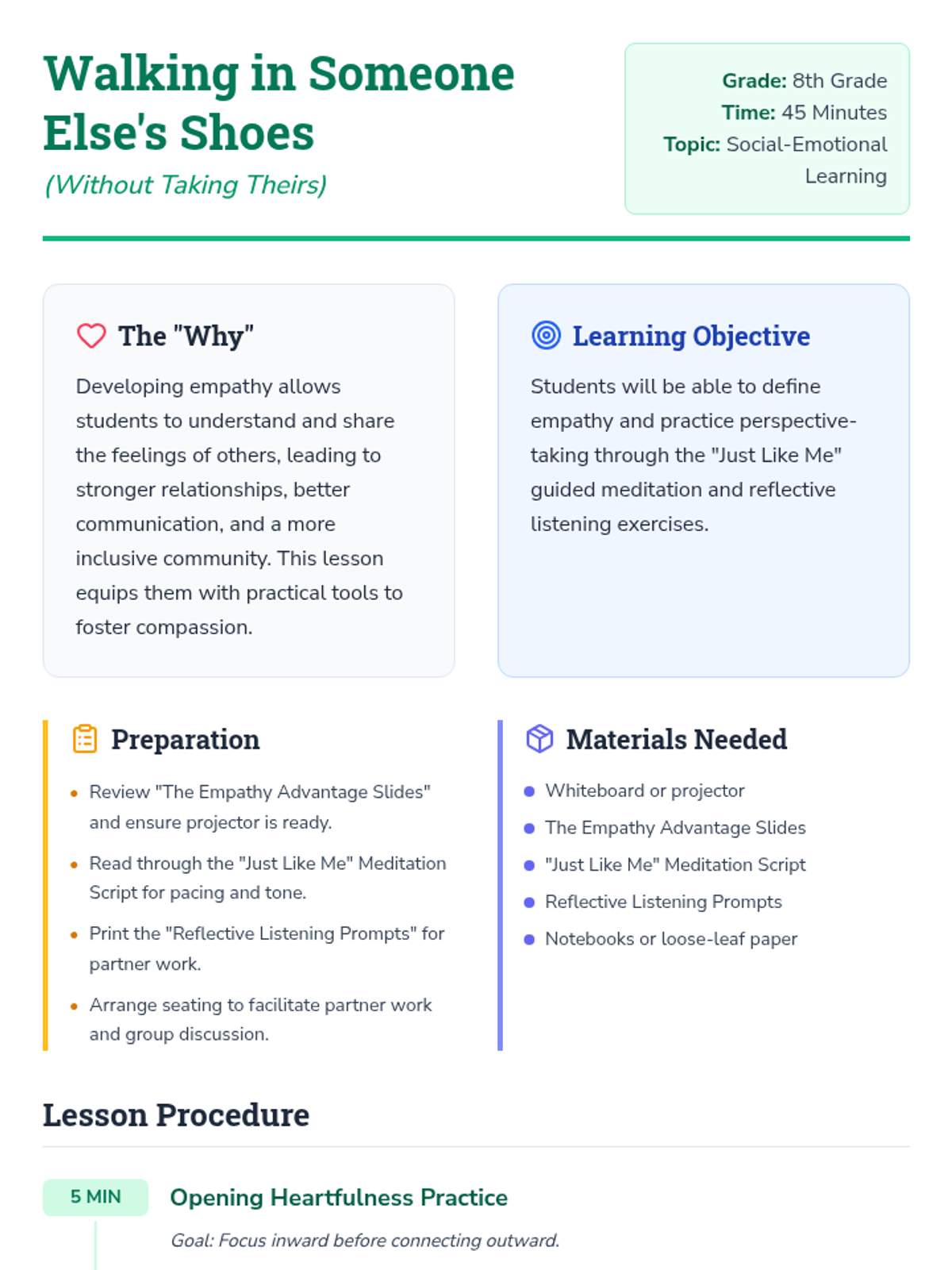 This 8th-grade lesson focuses on defining empathy and practicing perspective-taking through a guided meditation and reflective listening, helping students develop crucial social-emotional skills.