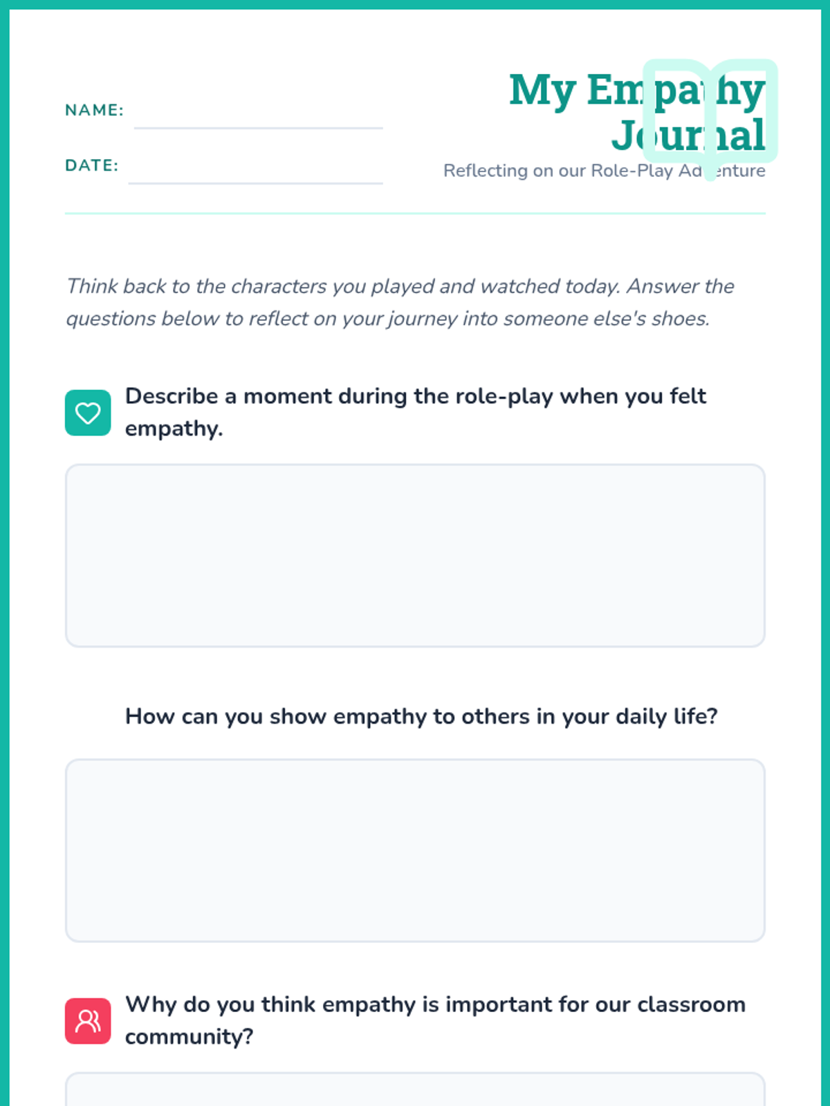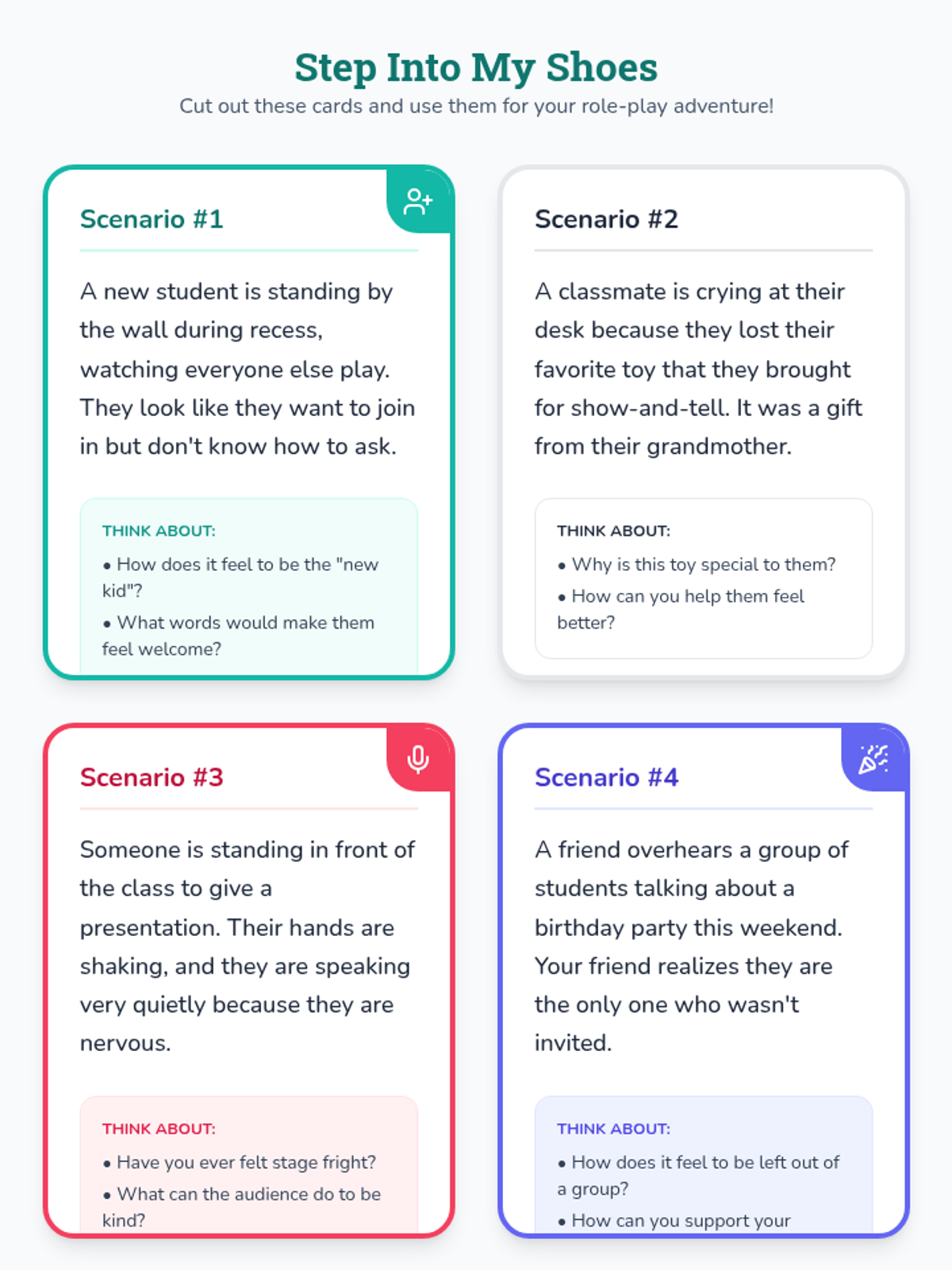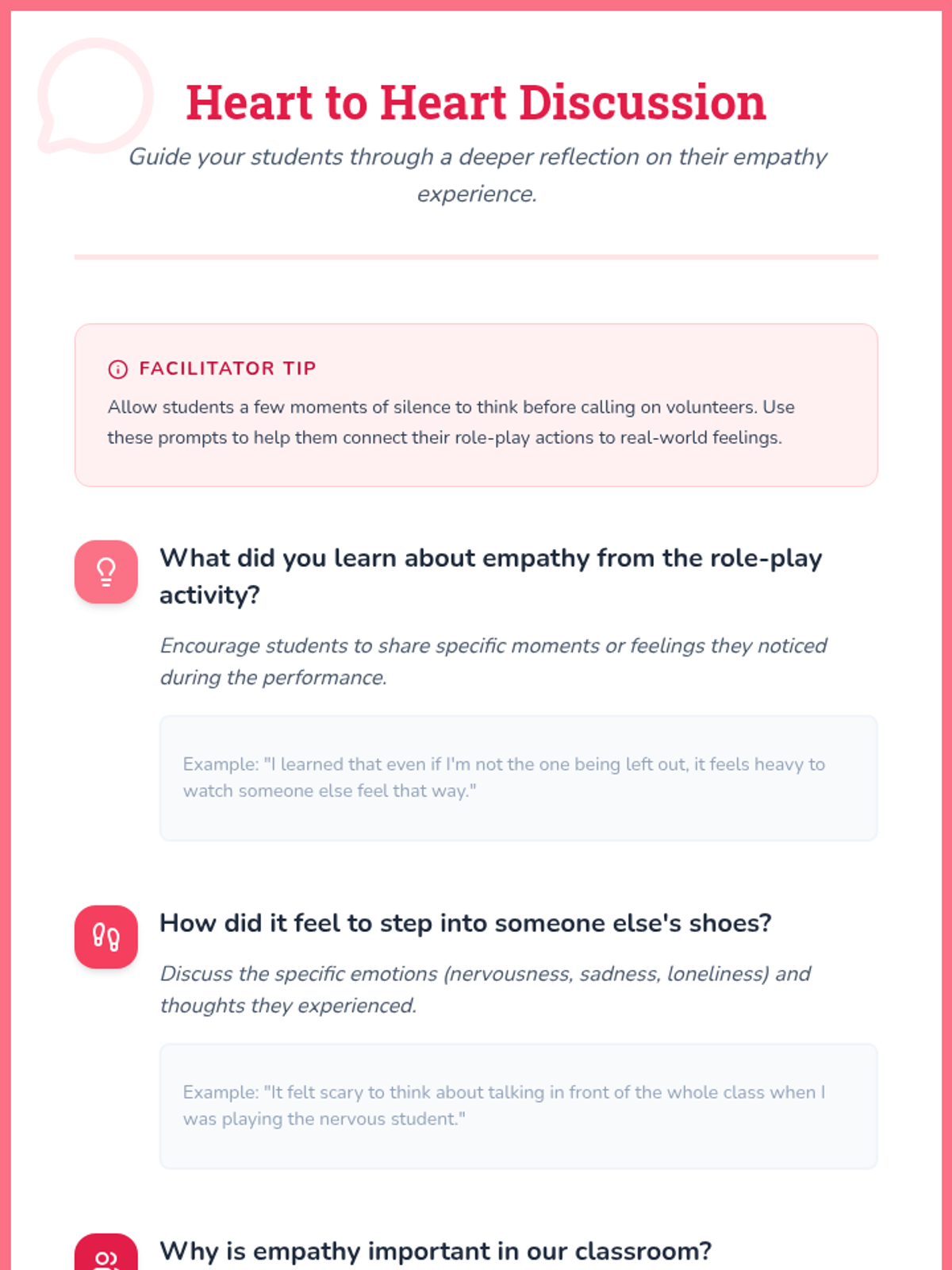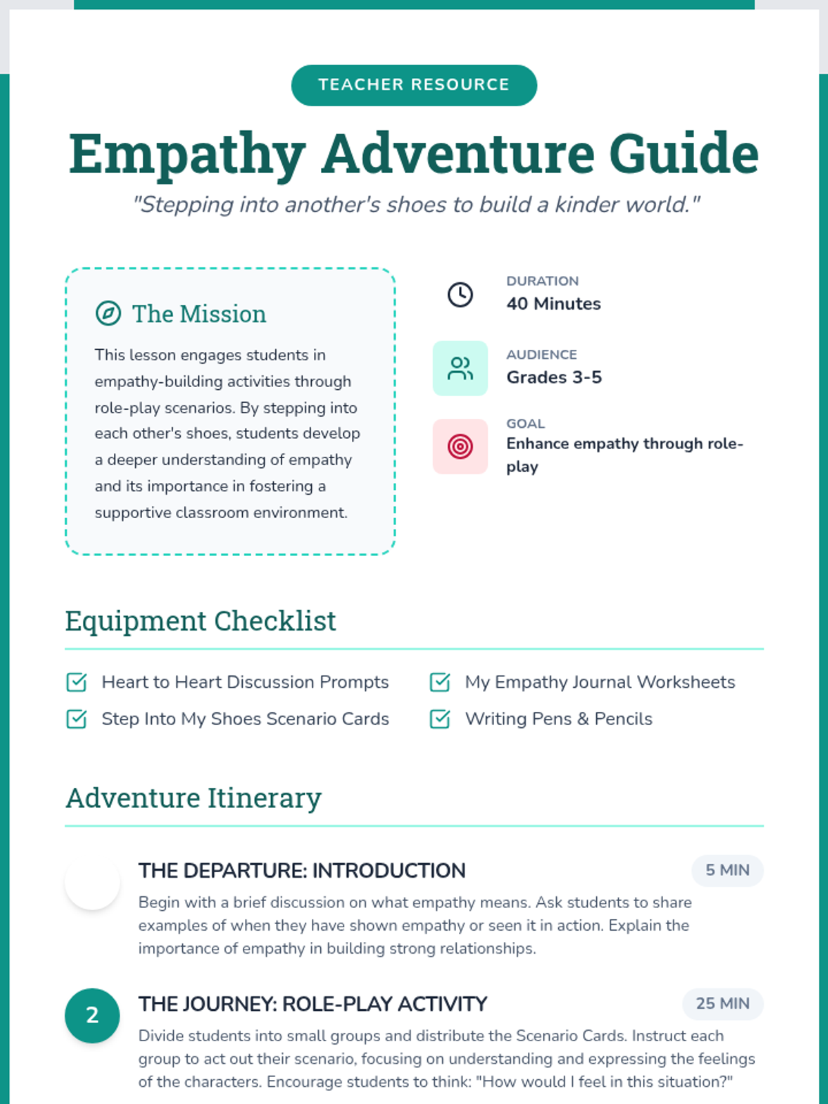 This lesson engaging students in empathy-building activities through role-play scenarios. By stepping into each other's shoes, students will develop a deeper understanding of empathy and its importance in fostering a supportive classroom environment.