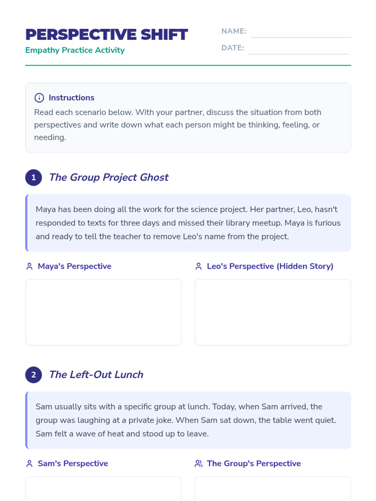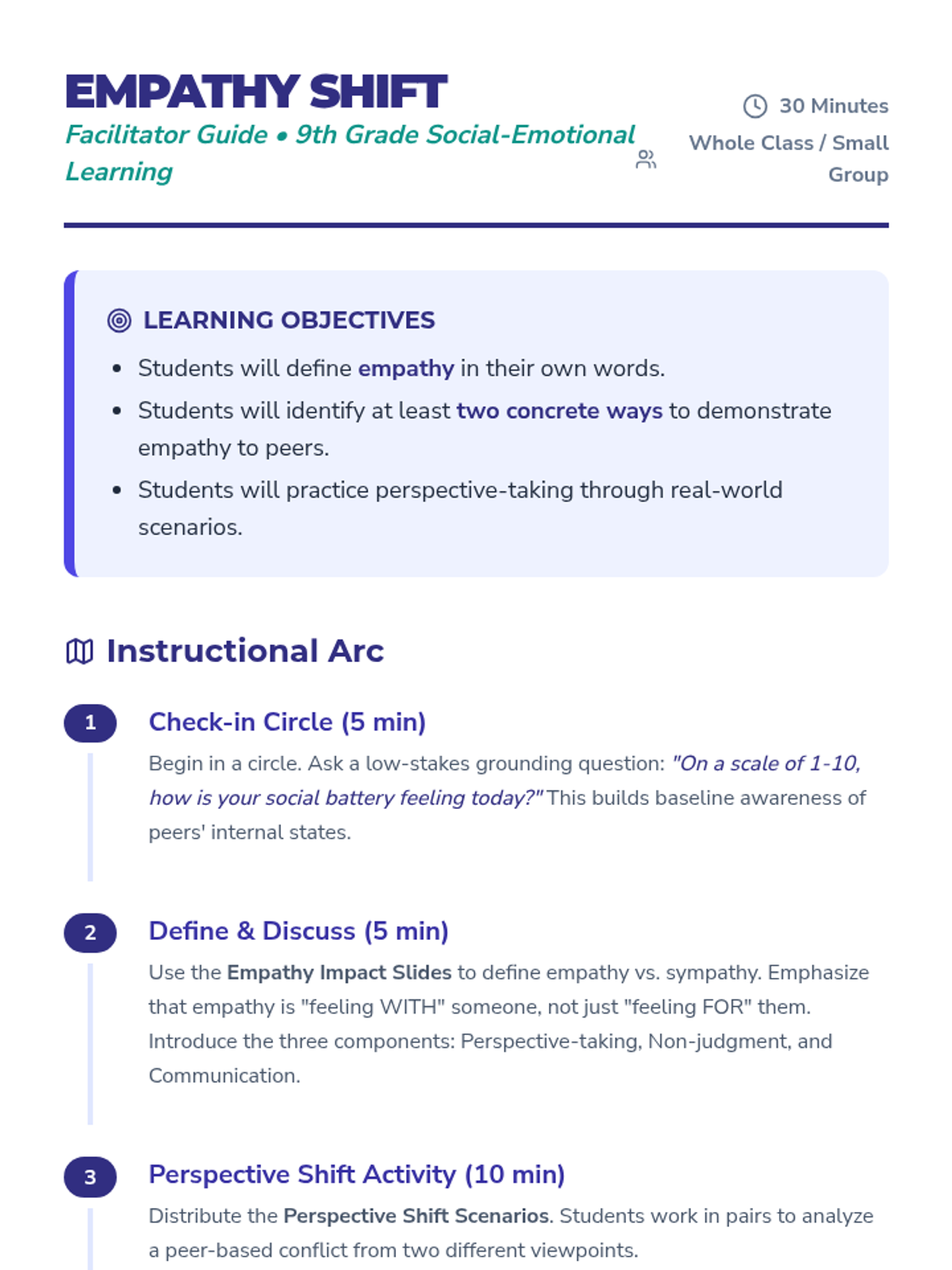 A 30-minute high school lesson focused on developing empathy, perspective-taking skills, and emotional awareness through interactive scenarios and reflection.