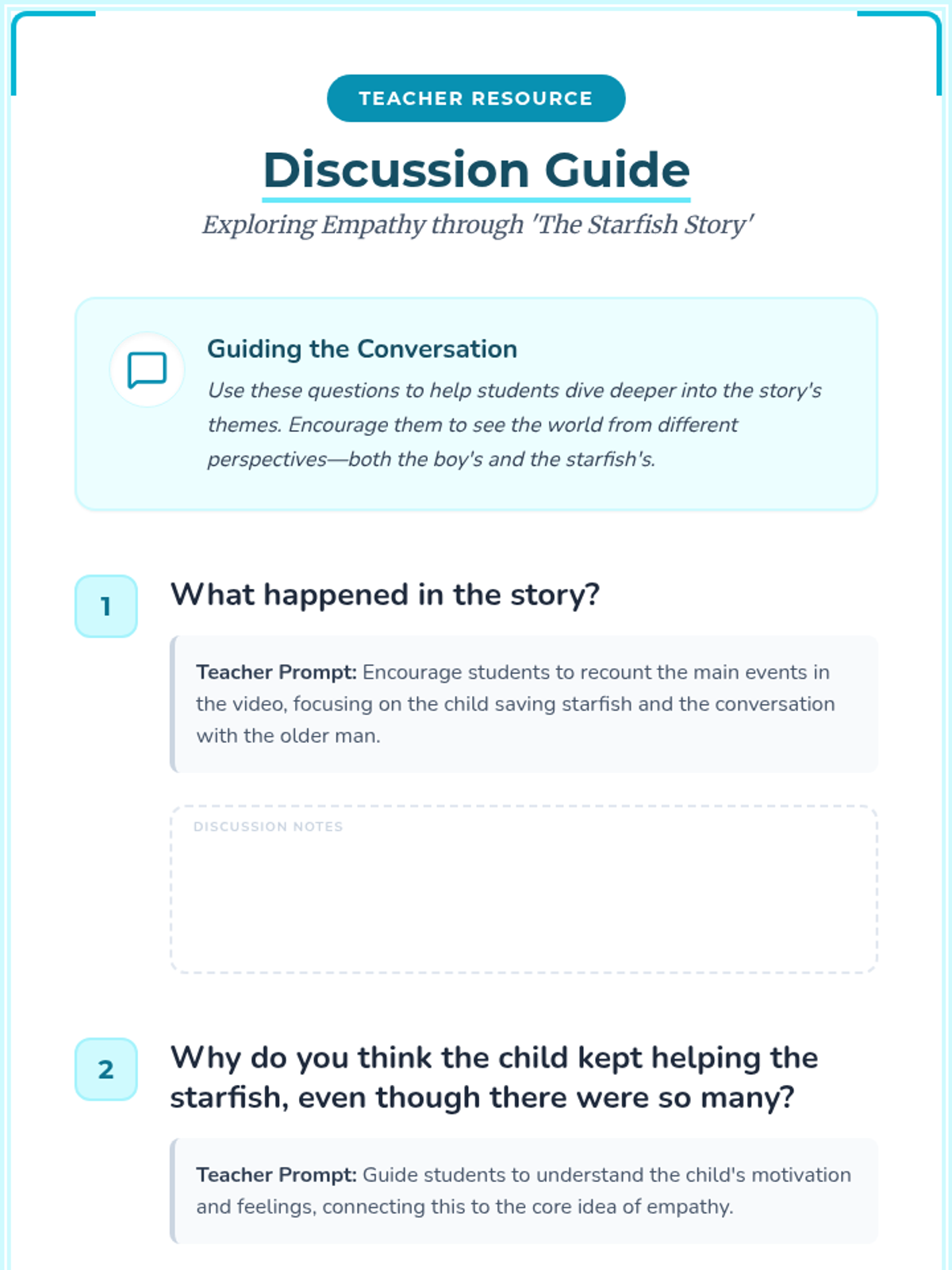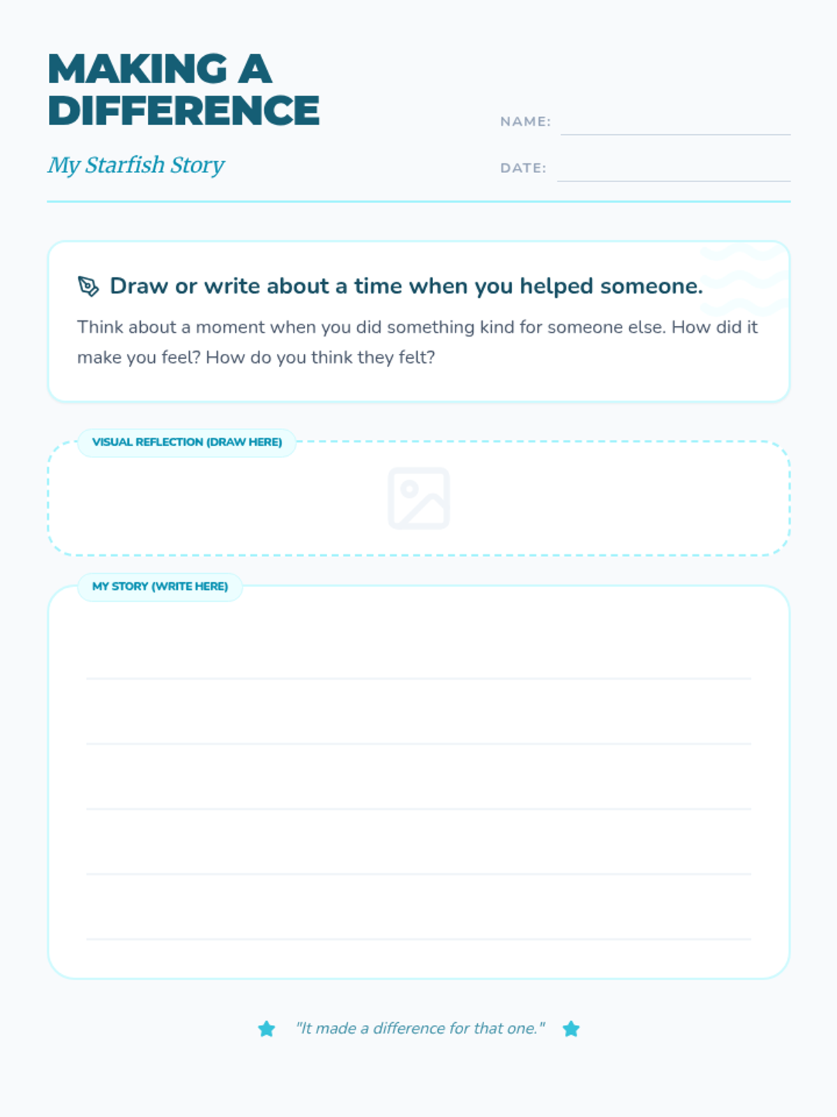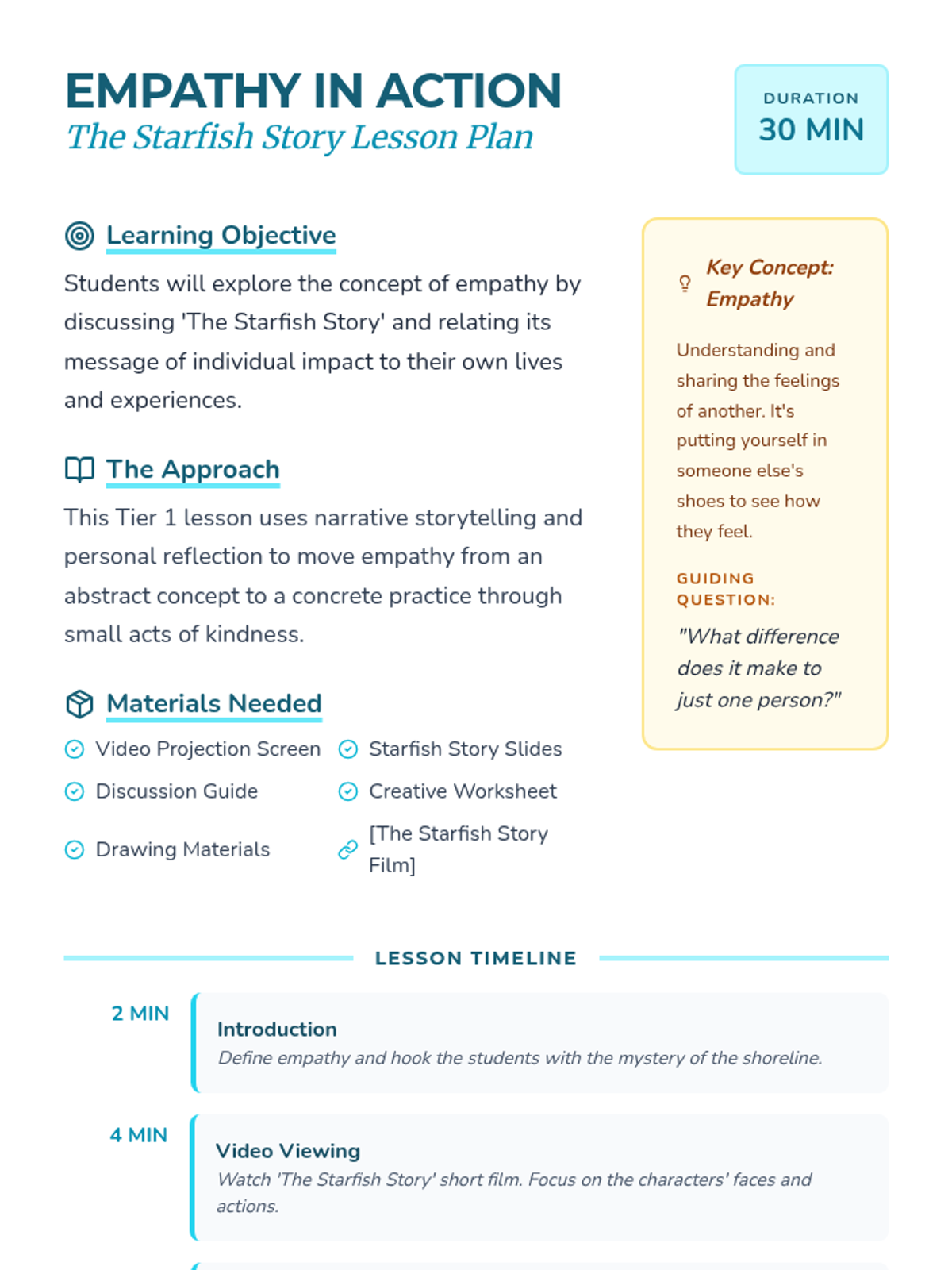 A 30-minute lesson using 'The Starfish Story' to teach Grade 4 students about empathy and the power of small acts of kindness.