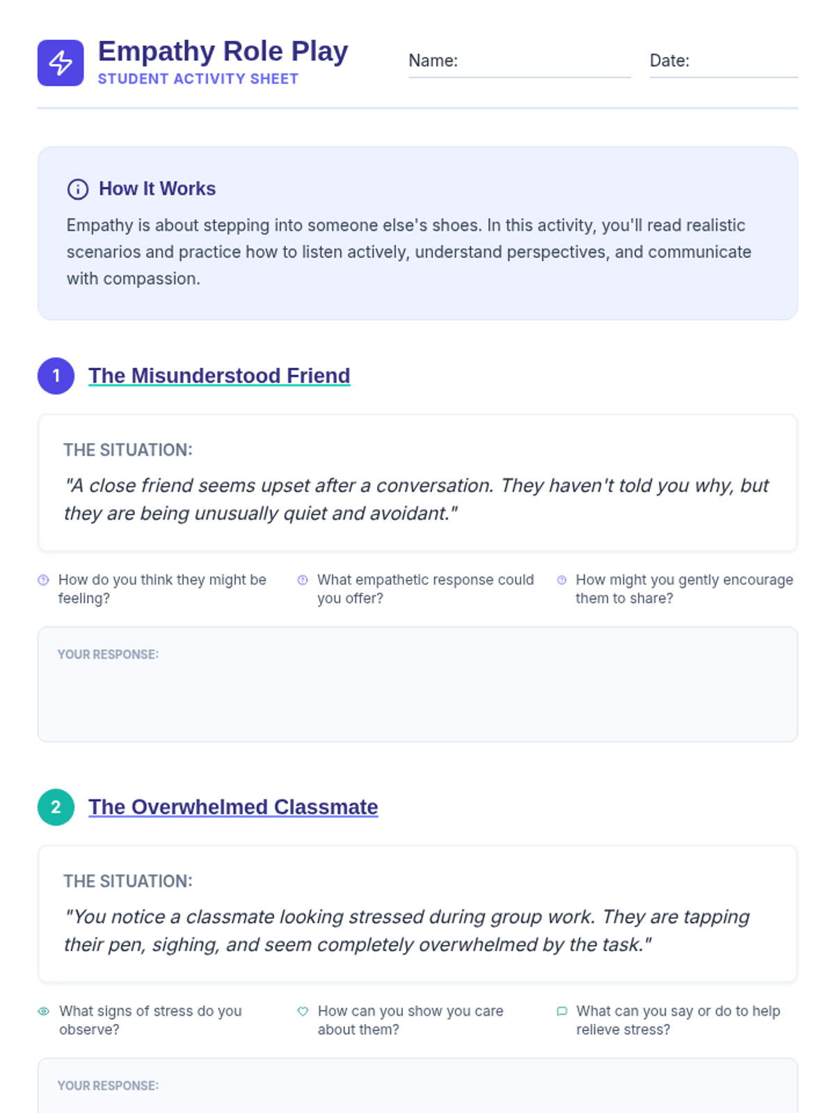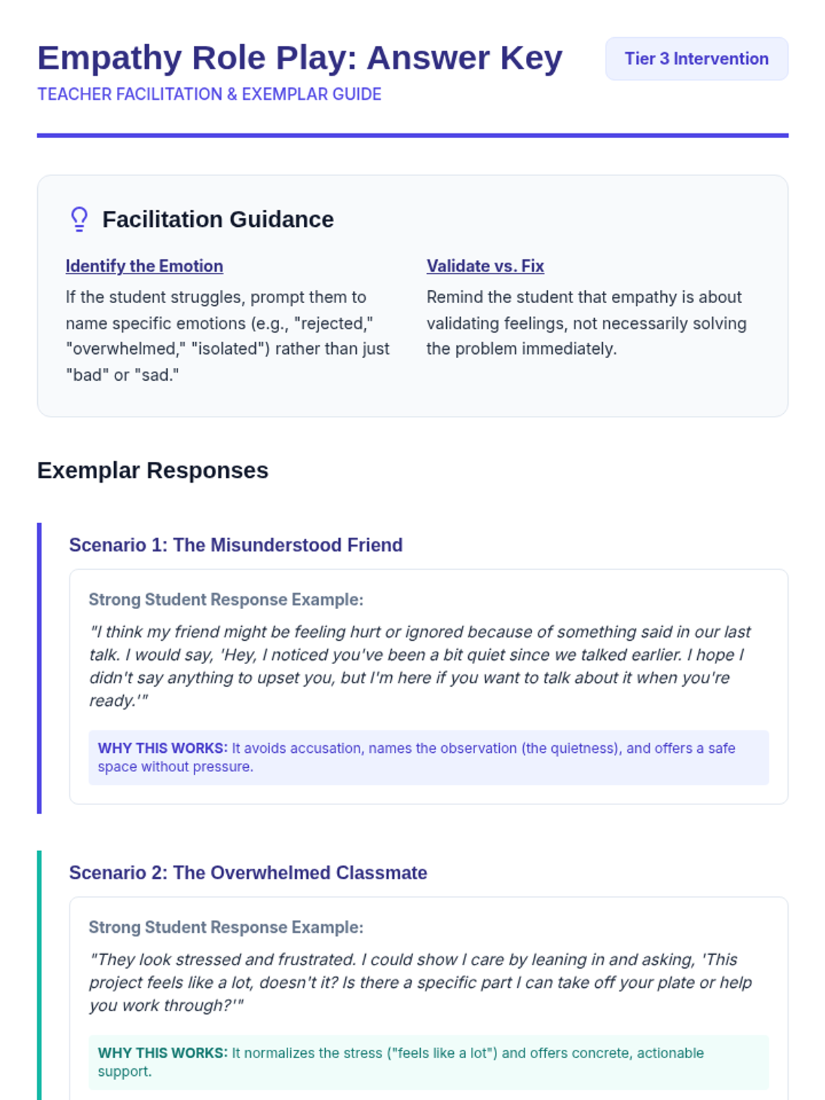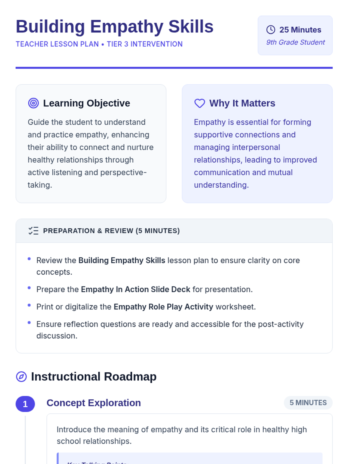 This Tier 3 intervention lesson helps individual students develop empathy as a foundational skill for healthy relationships. Students will explore the concept of empathy, practice perspective-taking through role-play, and reflect on how to apply these skills in their daily lives.