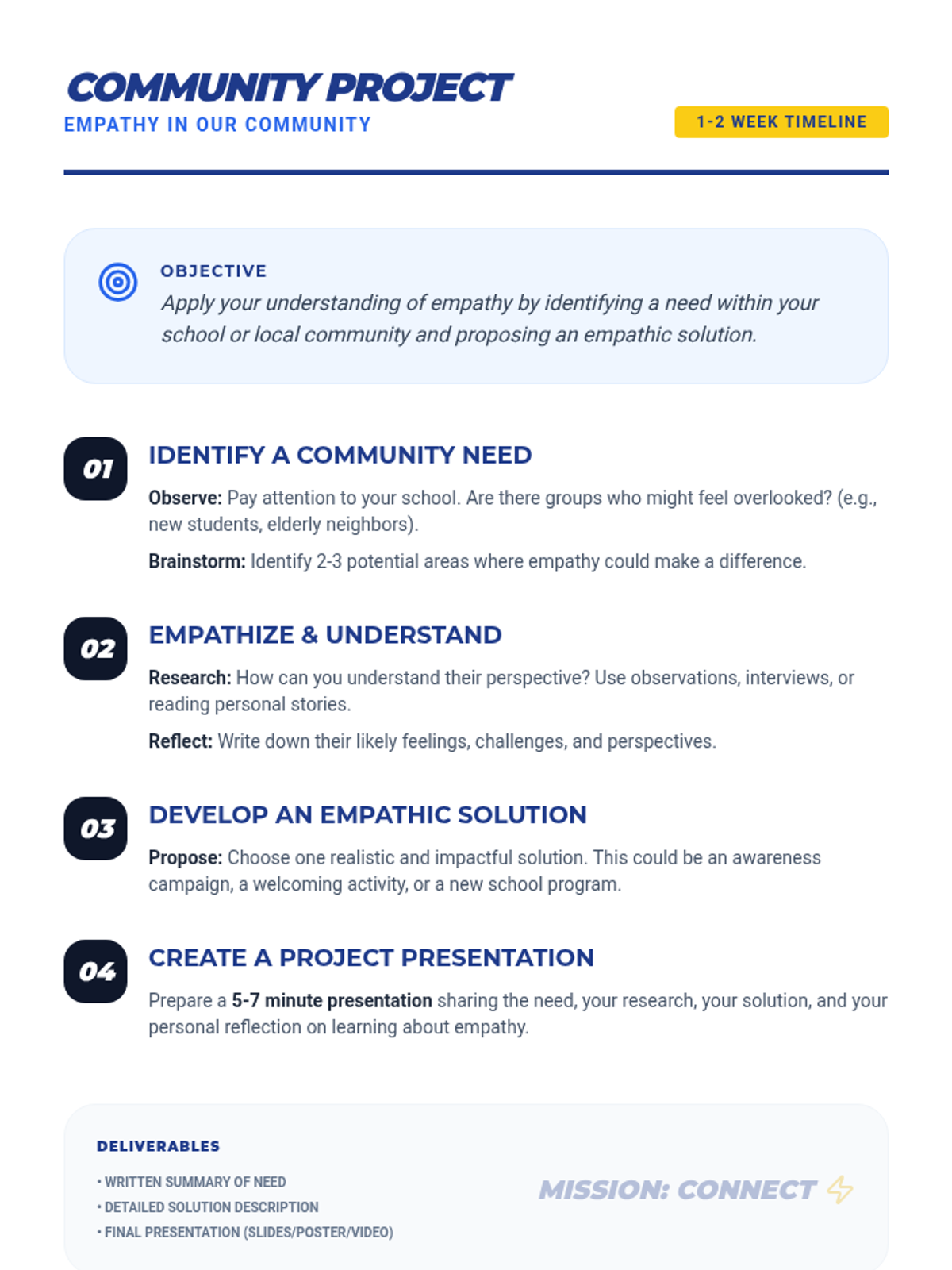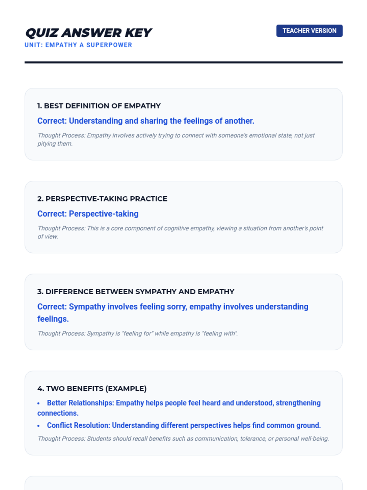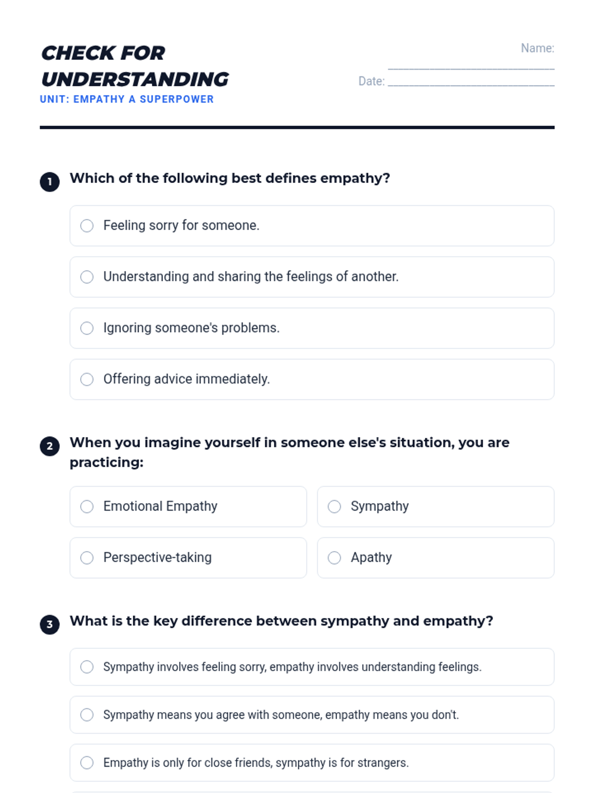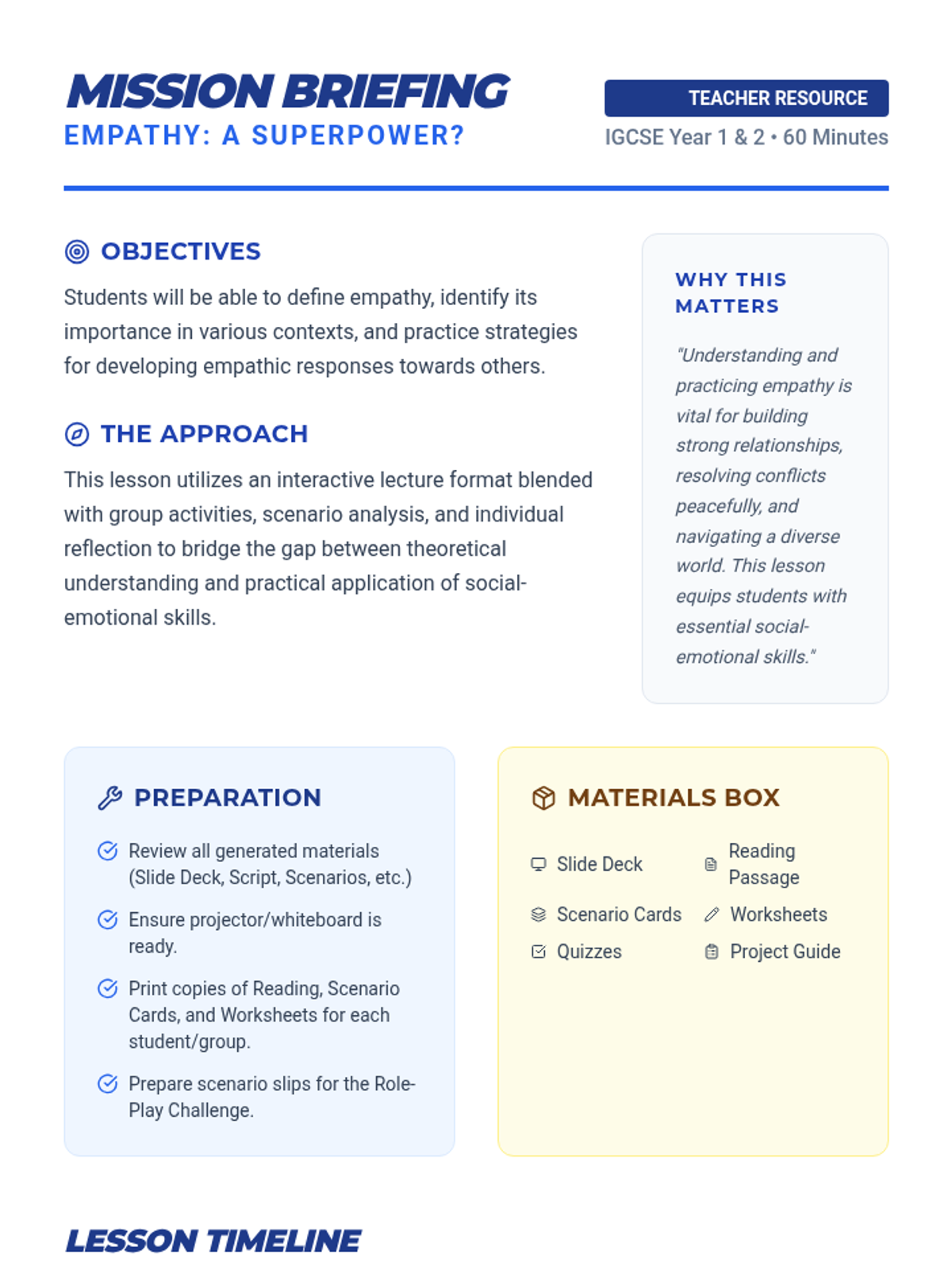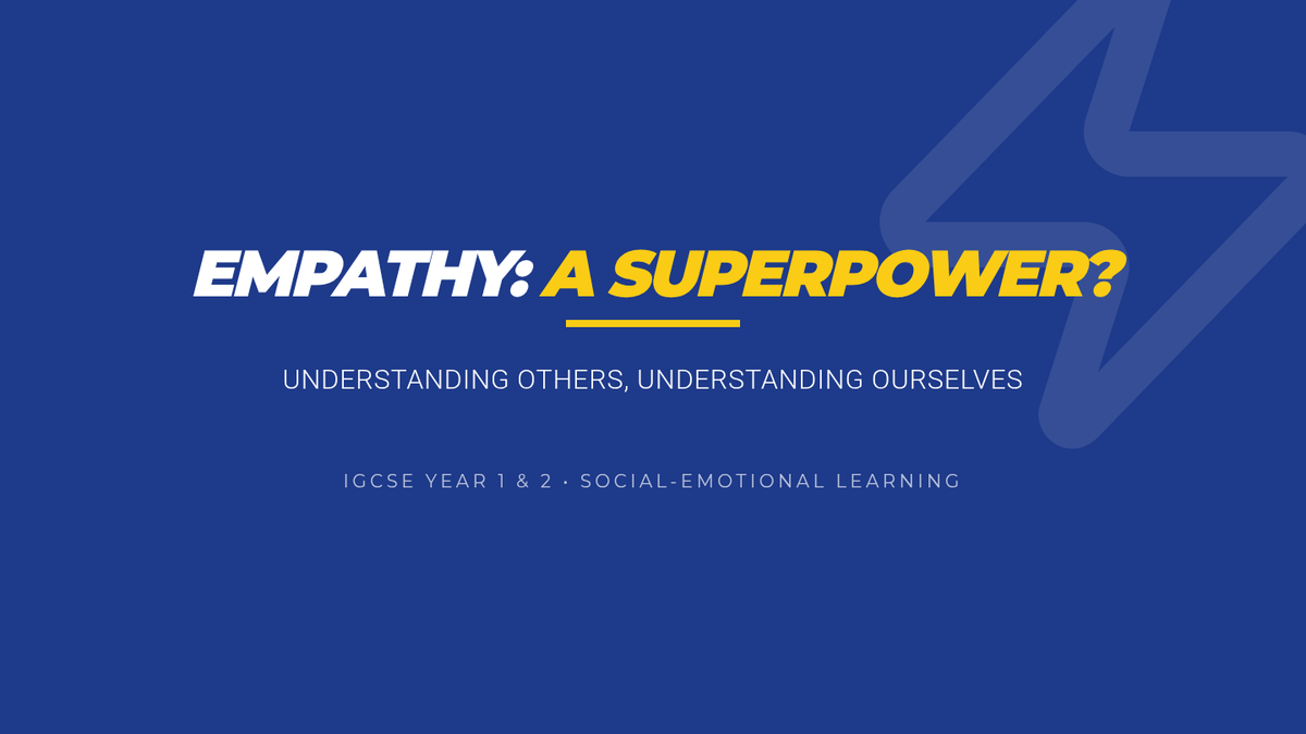 A comprehensive 60-minute lesson for IGCSE students exploring the 'superpower' of empathy, covering its definition, types, importance, and practical application through scenarios and role-play.