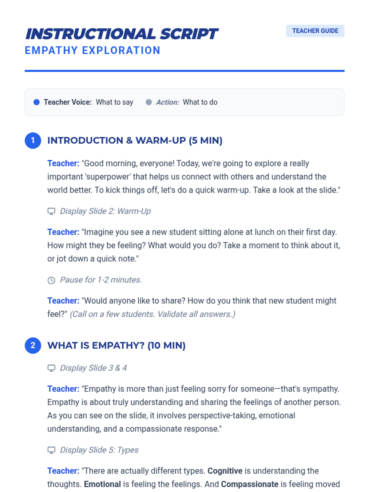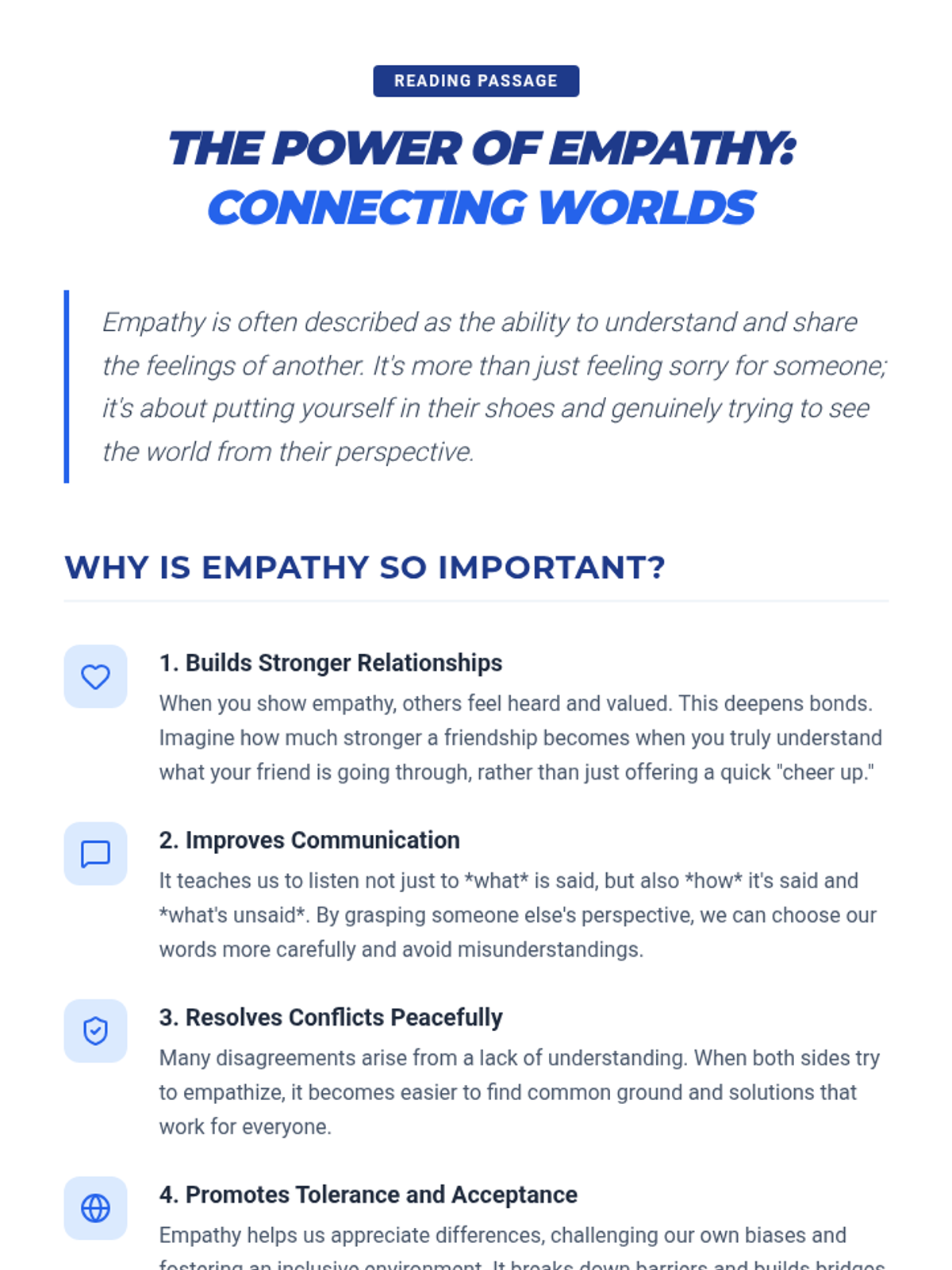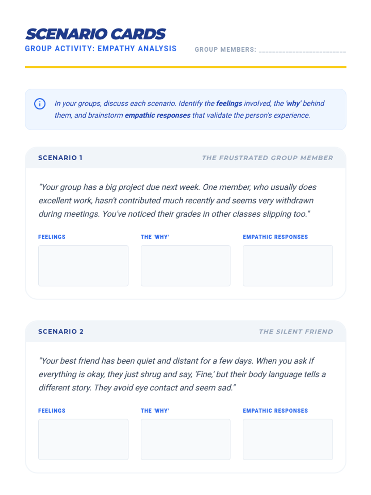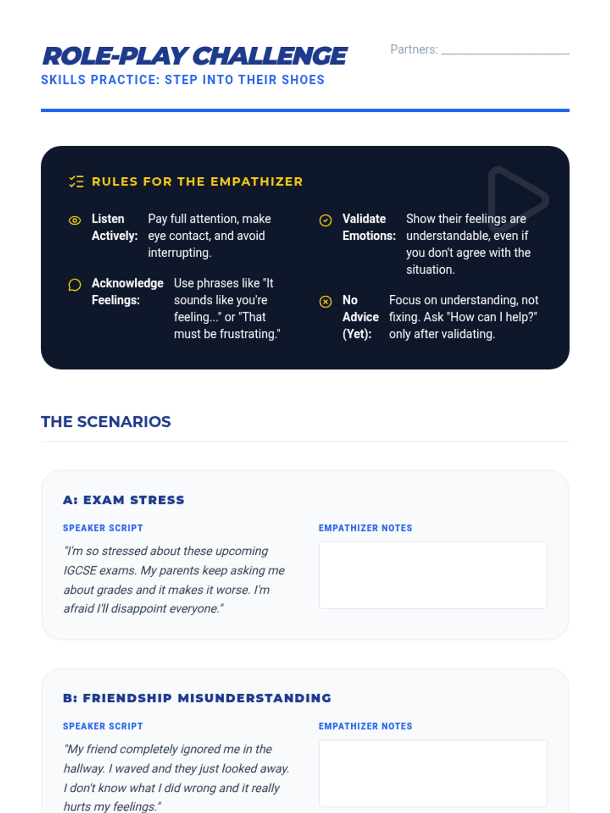 A comprehensive 60-minute lesson for IGCSE students exploring the 'superpower' of empathy, covering its definition, types, importance, and practical application through scenarios and role-play.