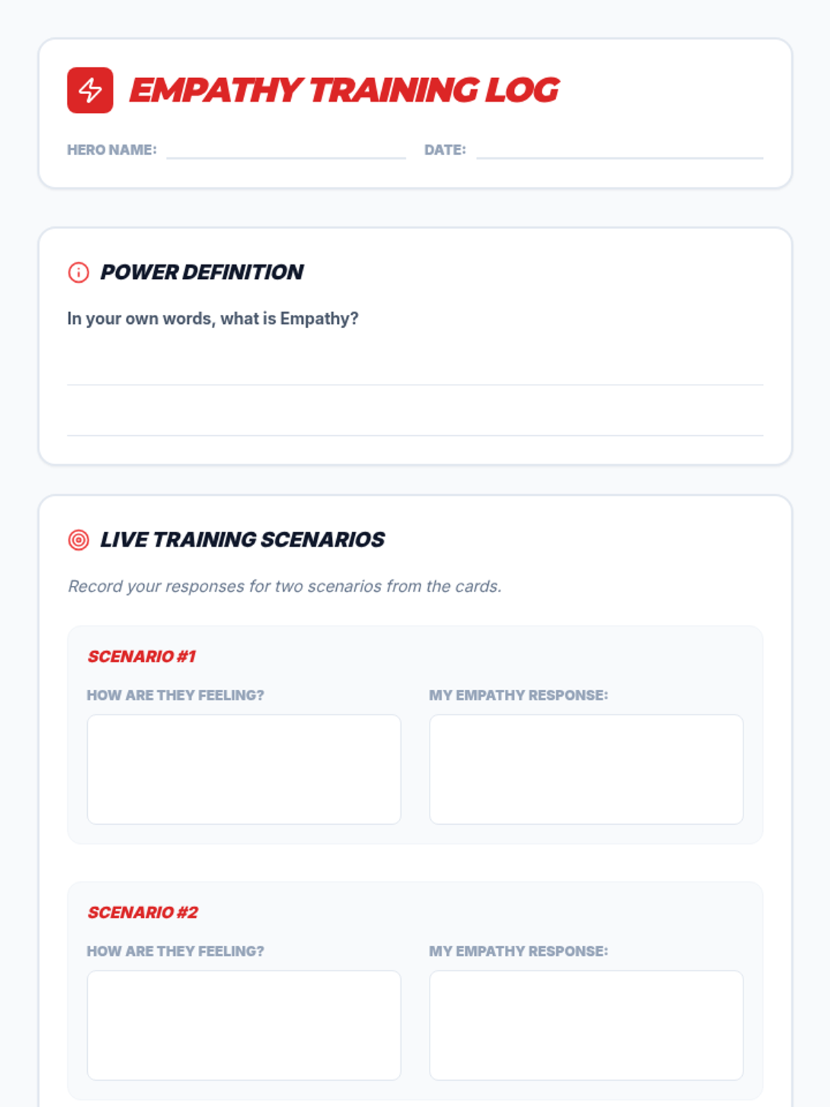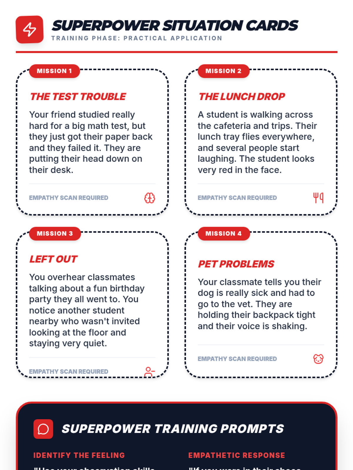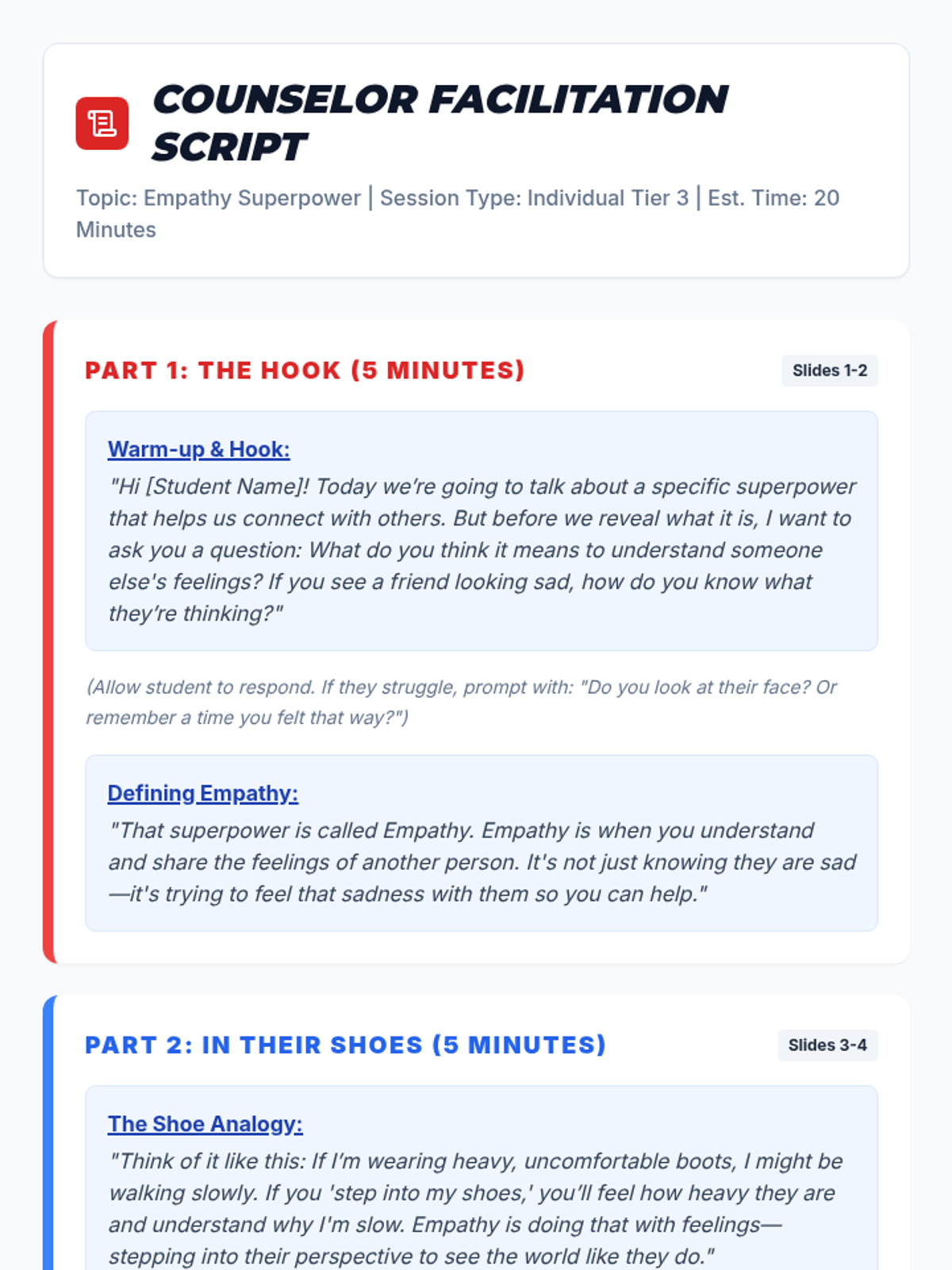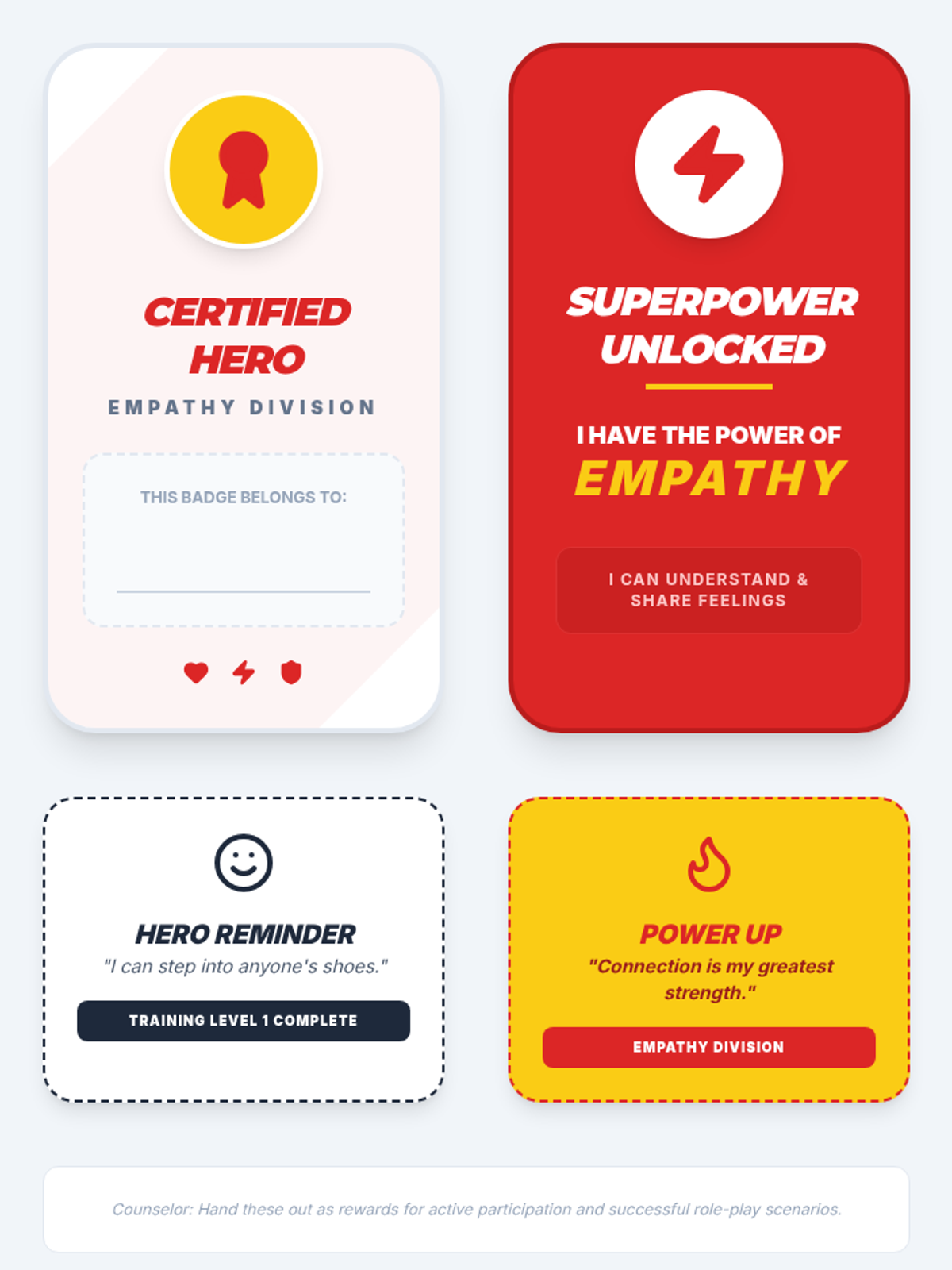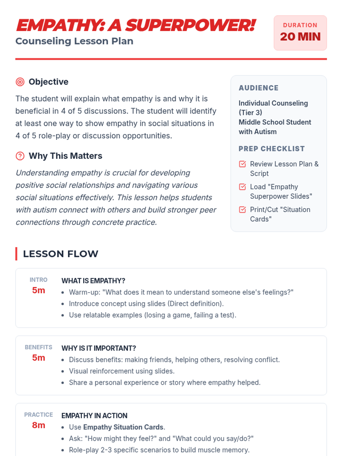 An individual Tier 3 counseling session designed for middle school students with autism to understand, identify, and practice empathy using a superpower-themed approach.