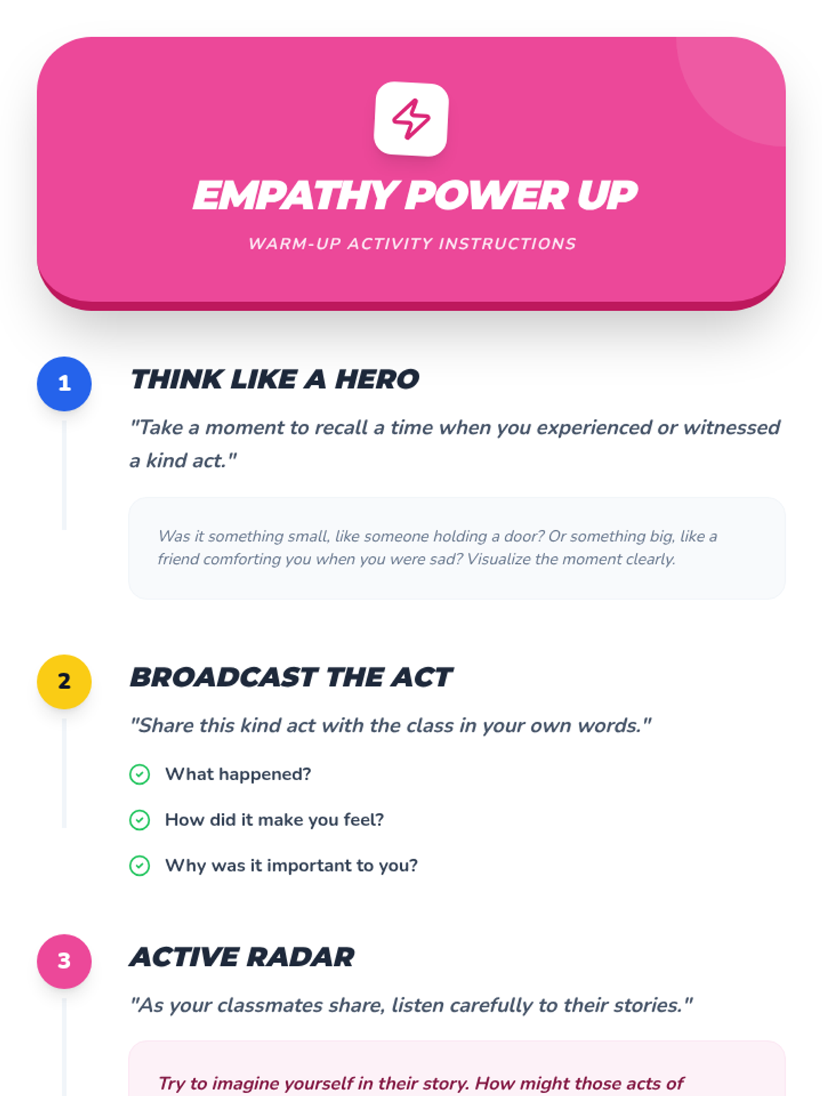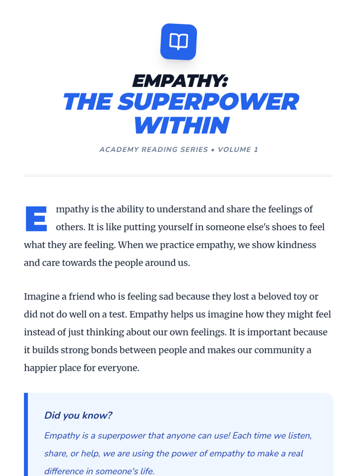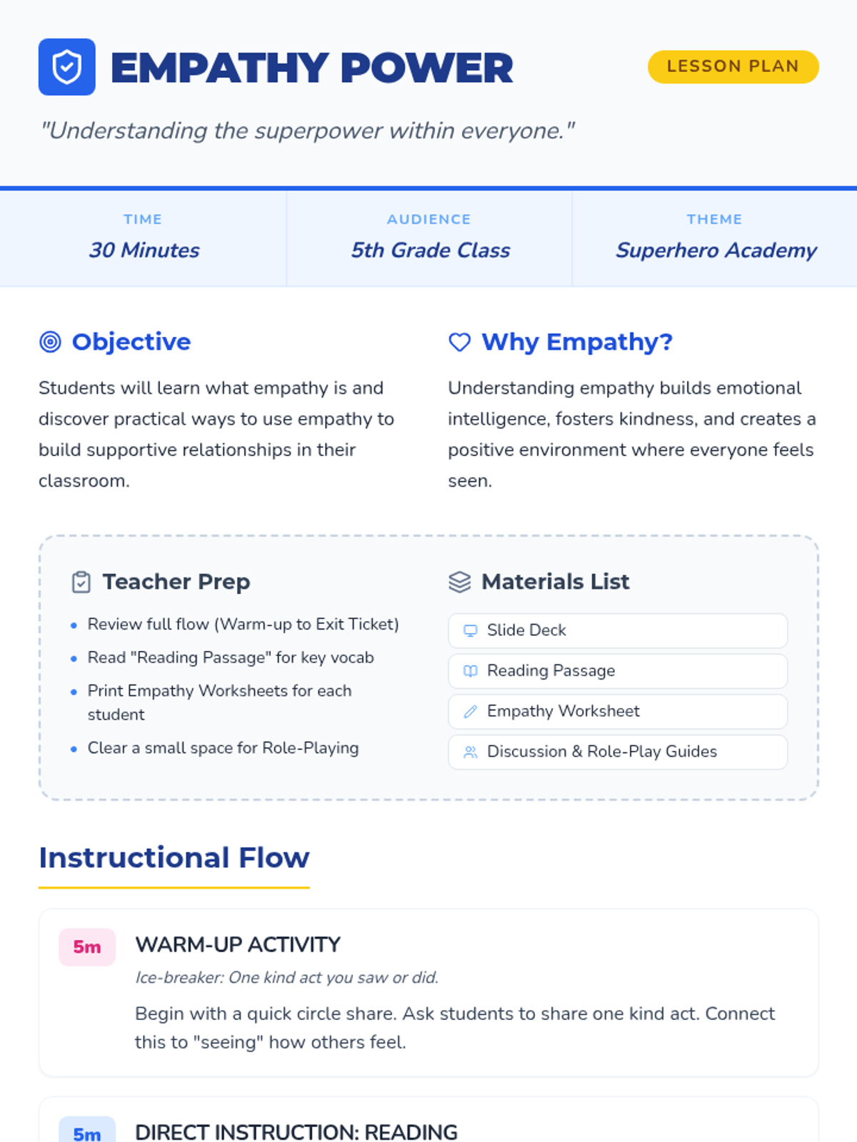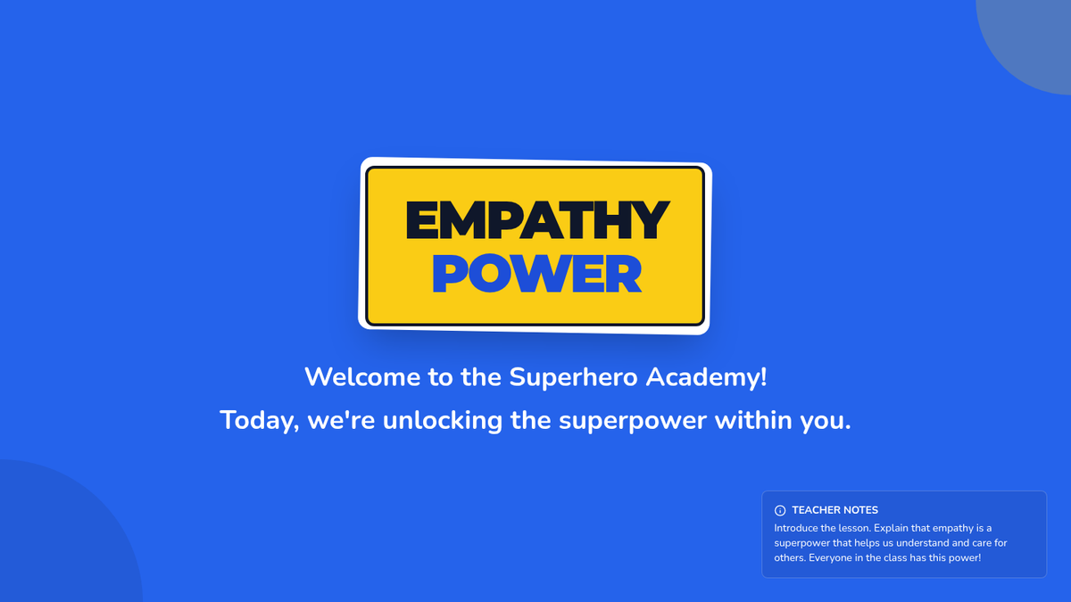In this engaging 30-minute lesson for a fifth-grade class, students will explore the concept of empathy, understanding what it is and how it can be a powerful tool in their everyday lives. This lesson is designed to foster emotional intelligence and social skills, helping students to connect with others and build a supportive classroom environment.