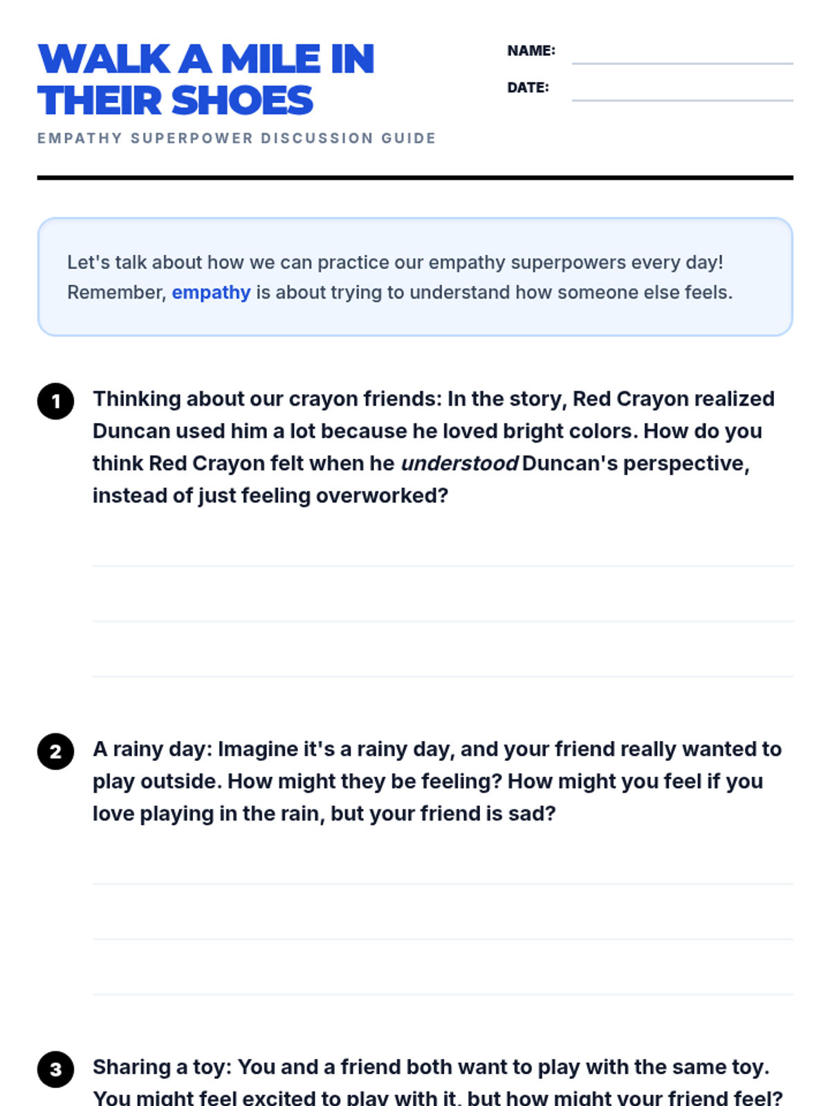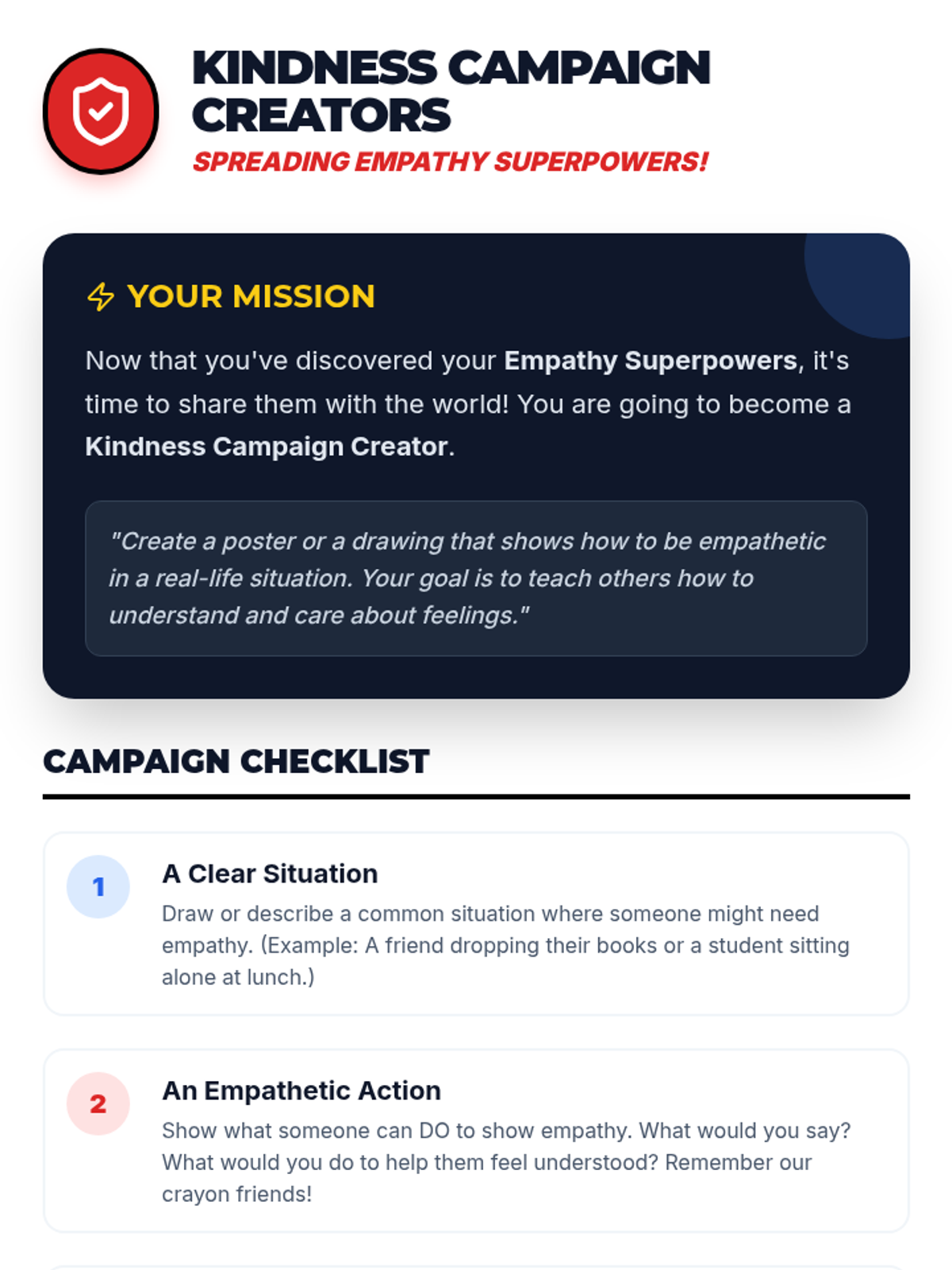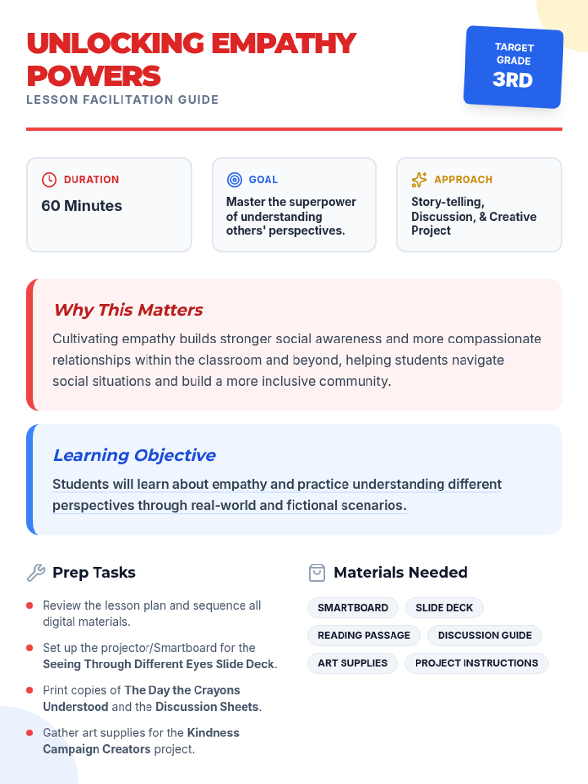 This lesson introduces 3rd graders to empathy through interactive slides, a creative story about crayons, and a hands-on project to design kindness posters. Students will learn to see through different eyes and practice understanding the feelings of others to build a more compassionate classroom.