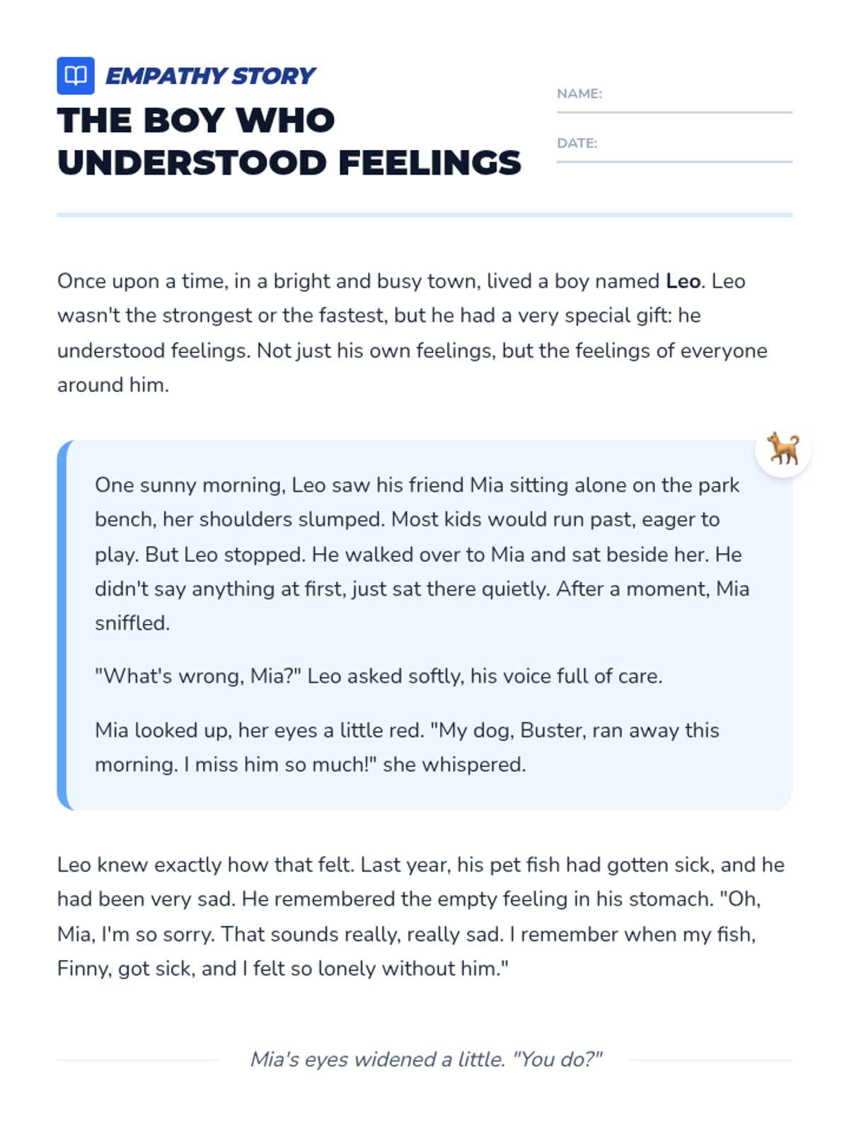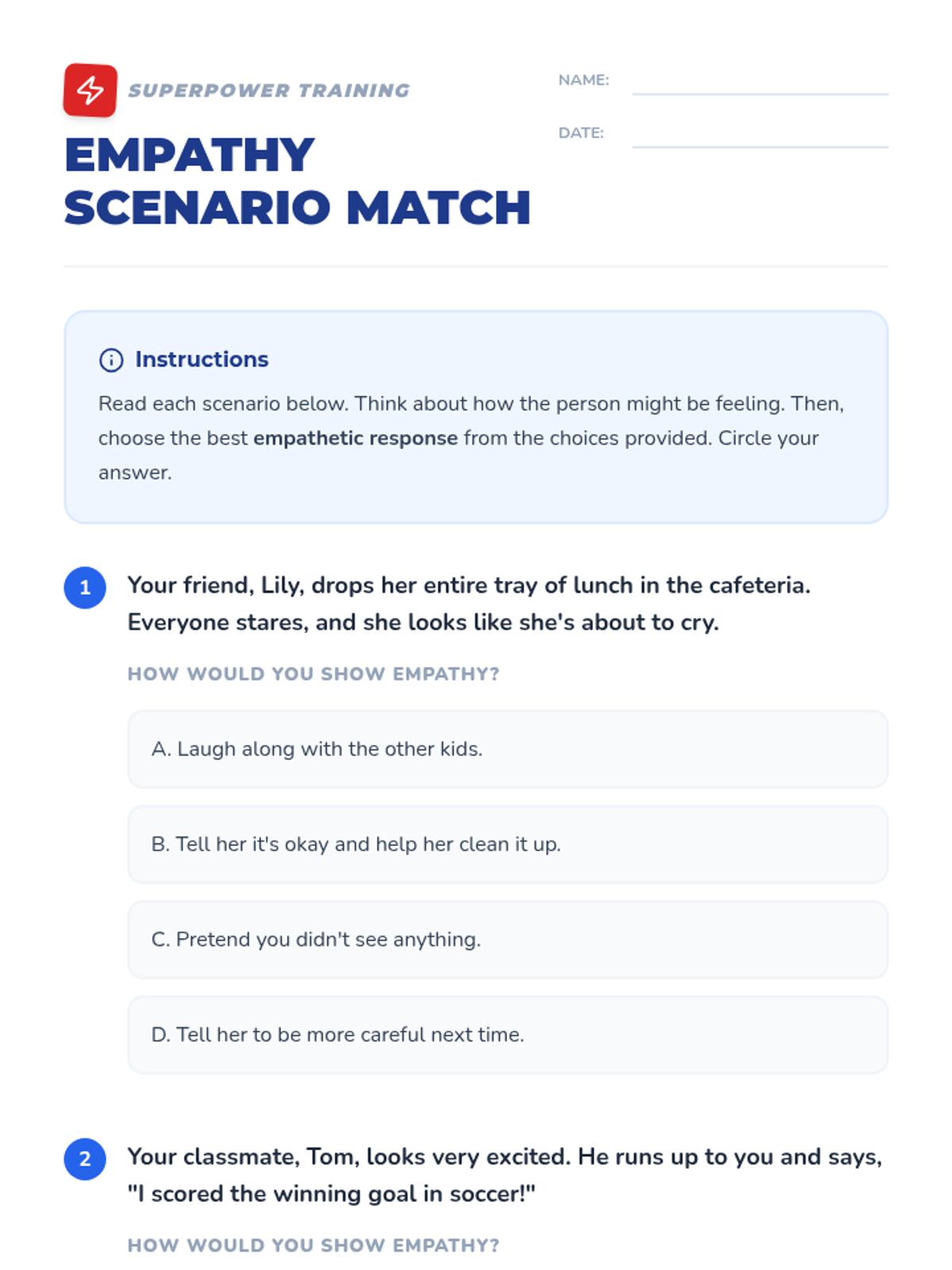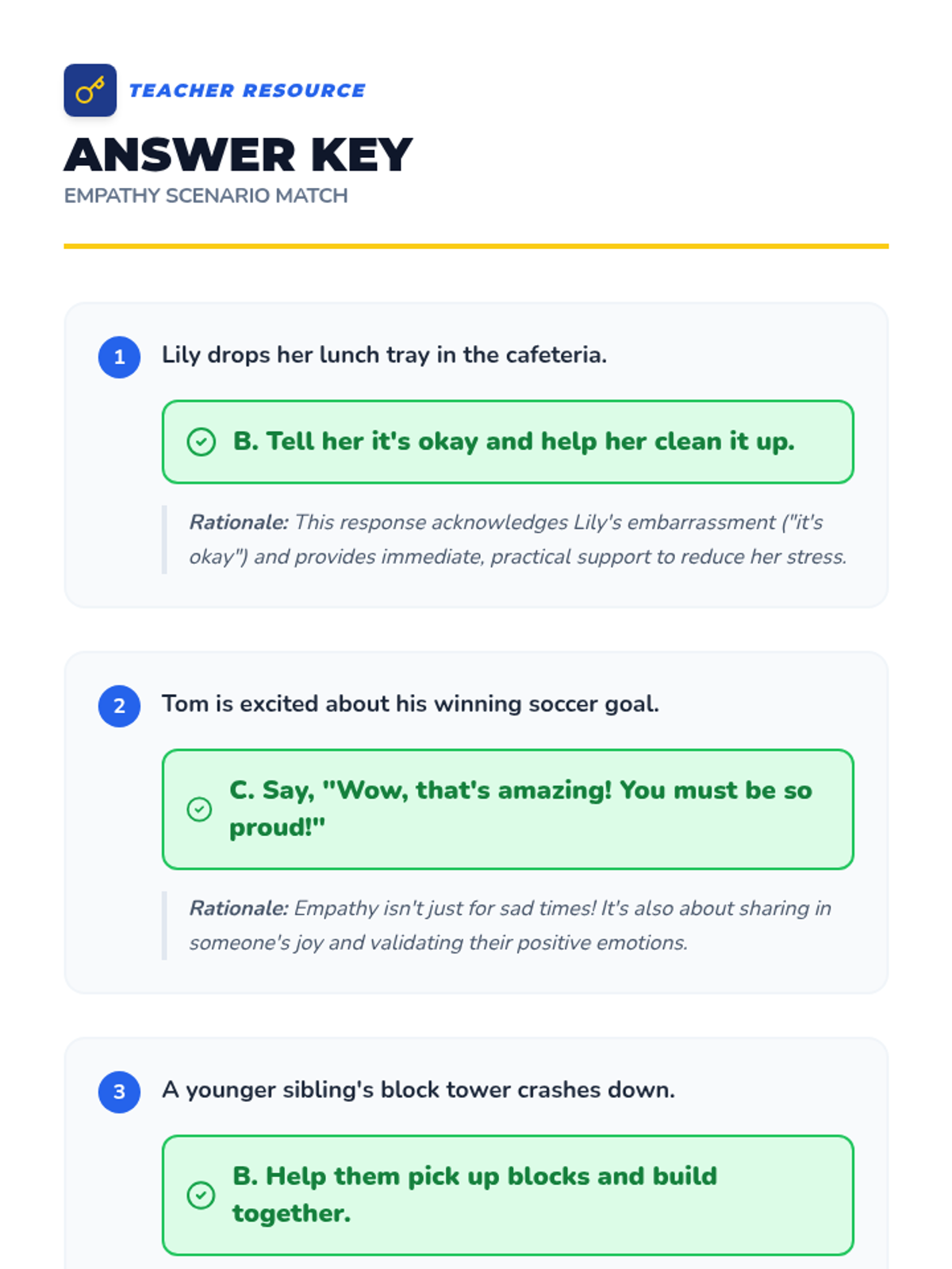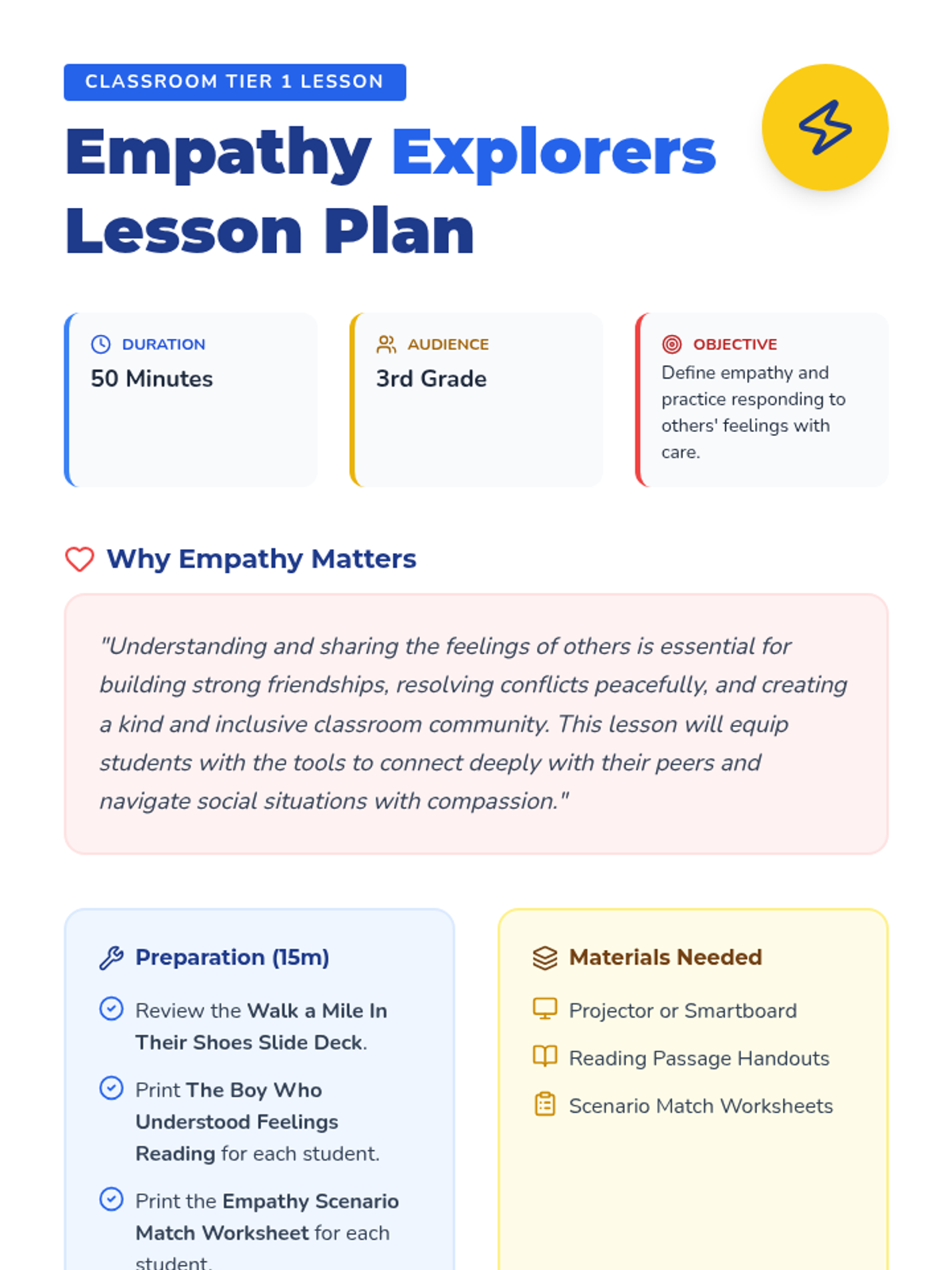 A comprehensive lesson for 3rd graders to develop empathy, featuring a story, slide presentation, and interactive scenario matching to build emotional intelligence.