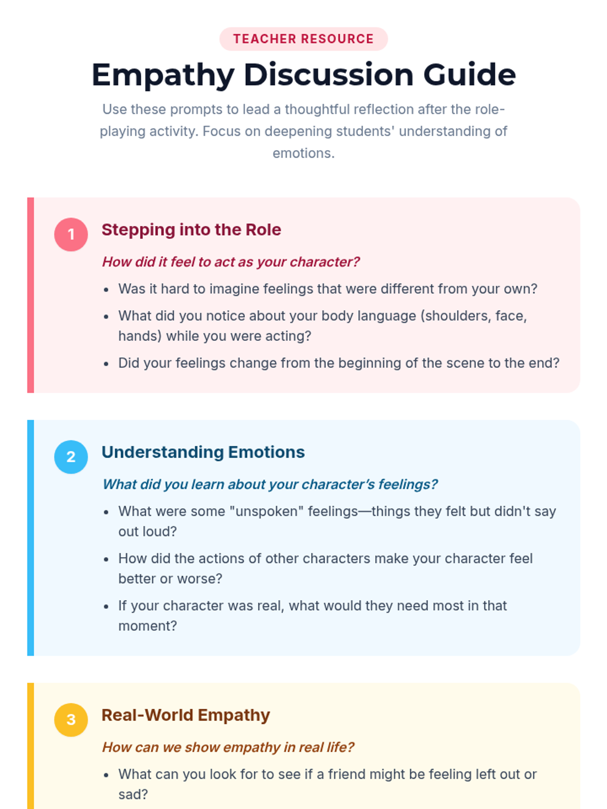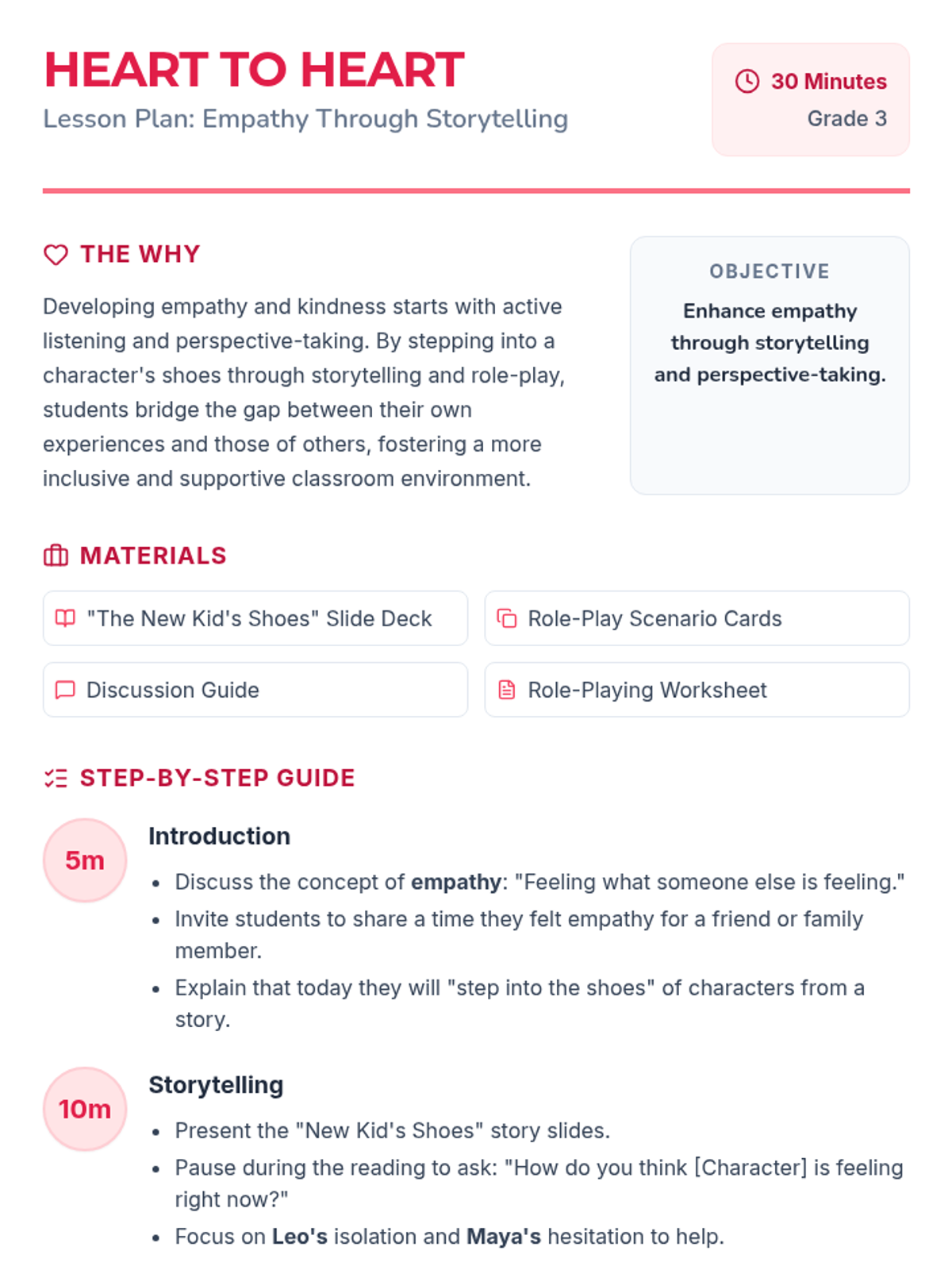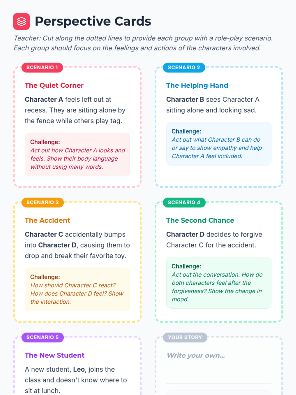 Students listen to a story about empathy and engage in role-playing to explore character perspectives and develop active listening skills.