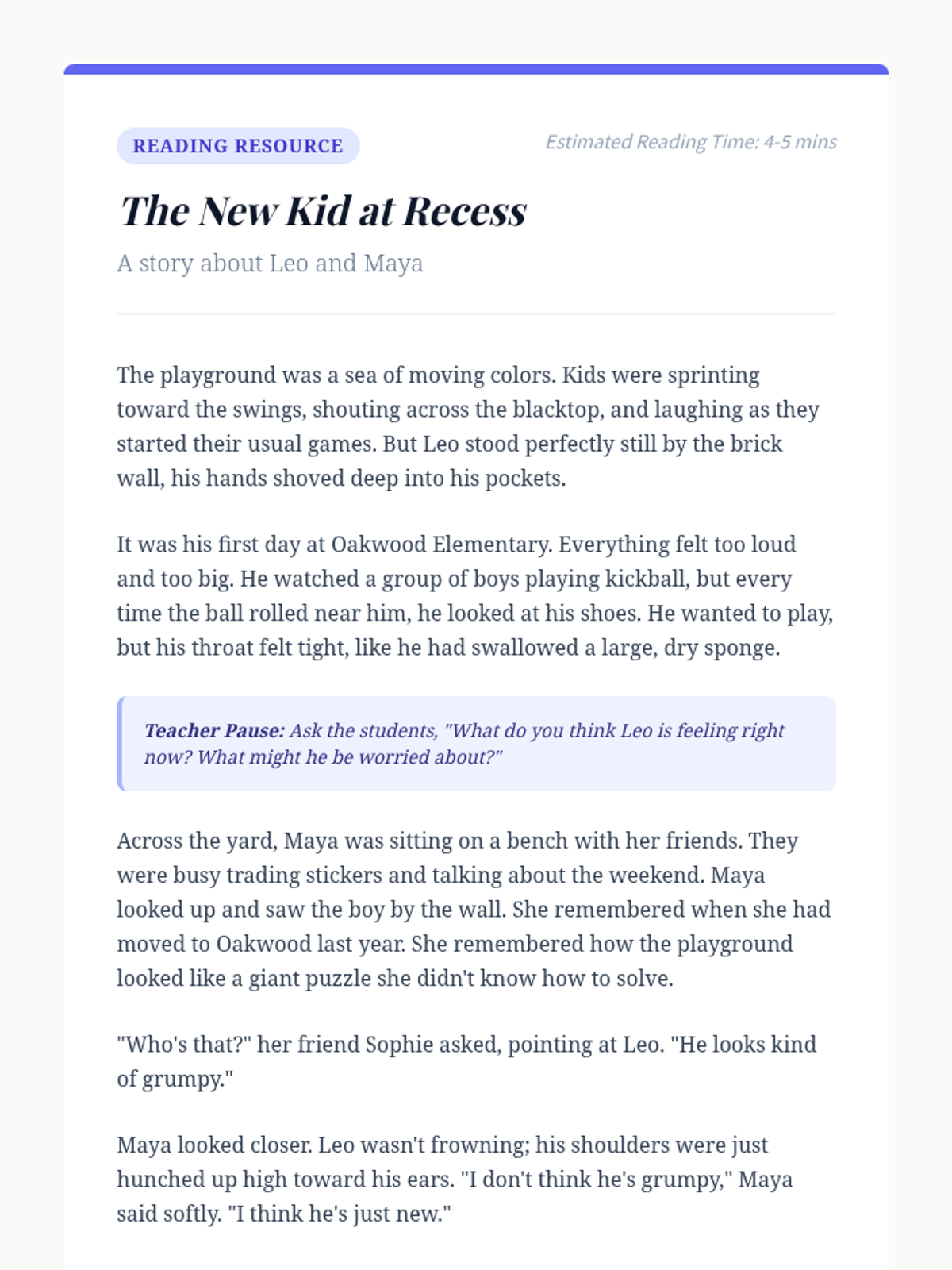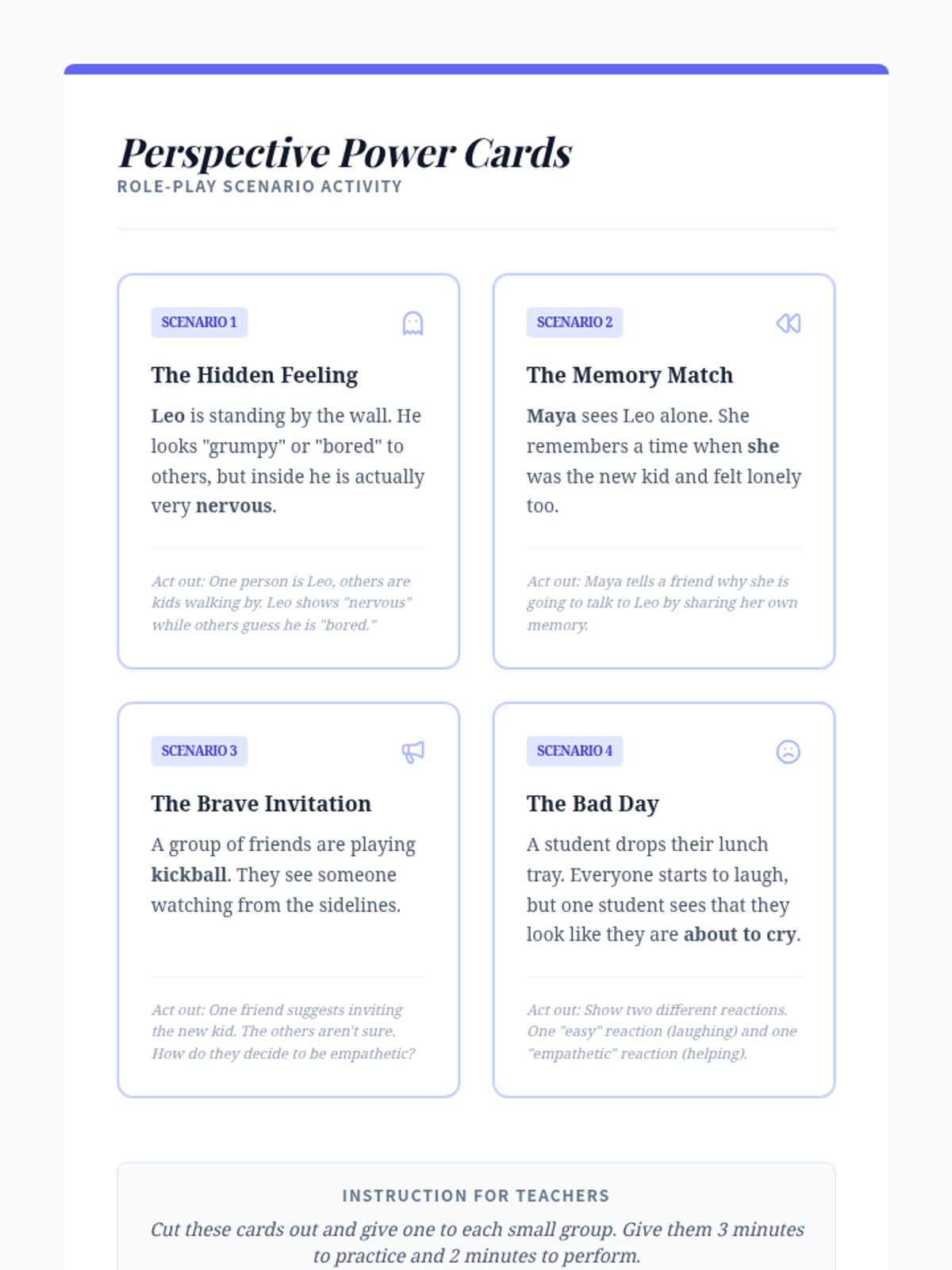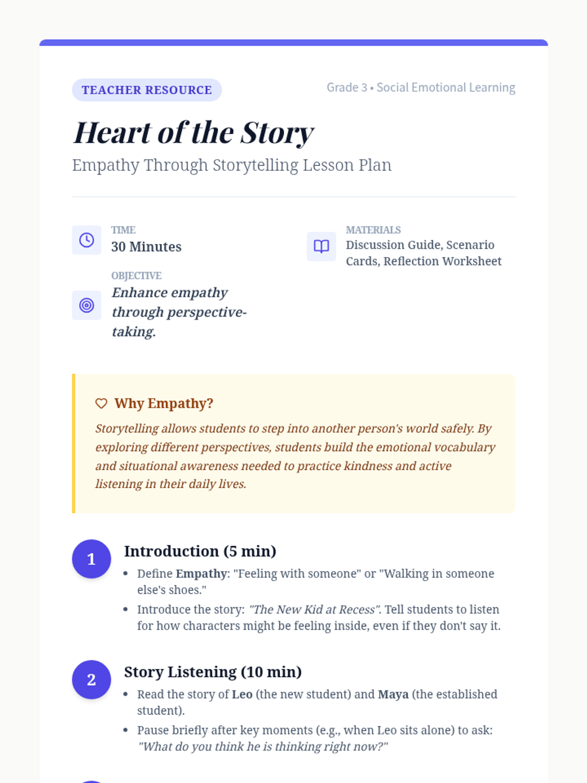 Students will listen to a story about a new student, Leo, and engage in role-playing activities to practice perspective-taking and empathy. This lesson helps Grade 3 students develop active listening and social-emotional skills.