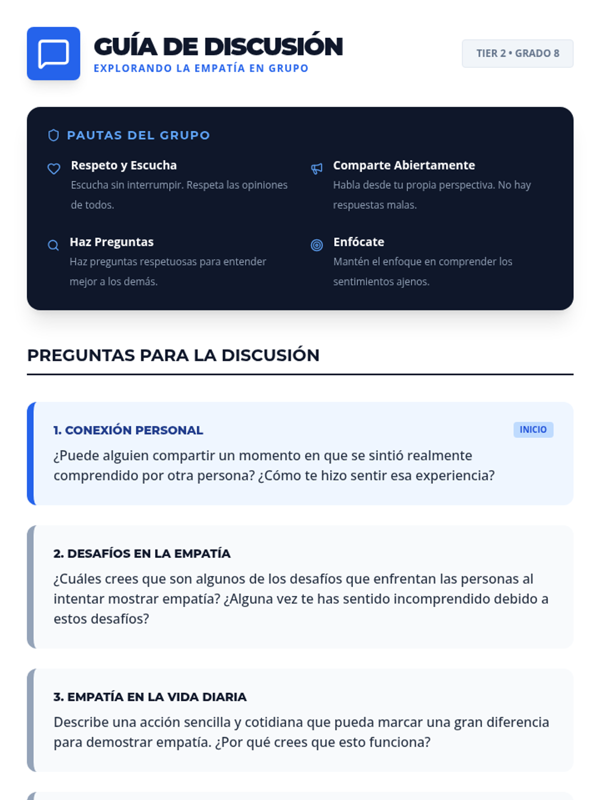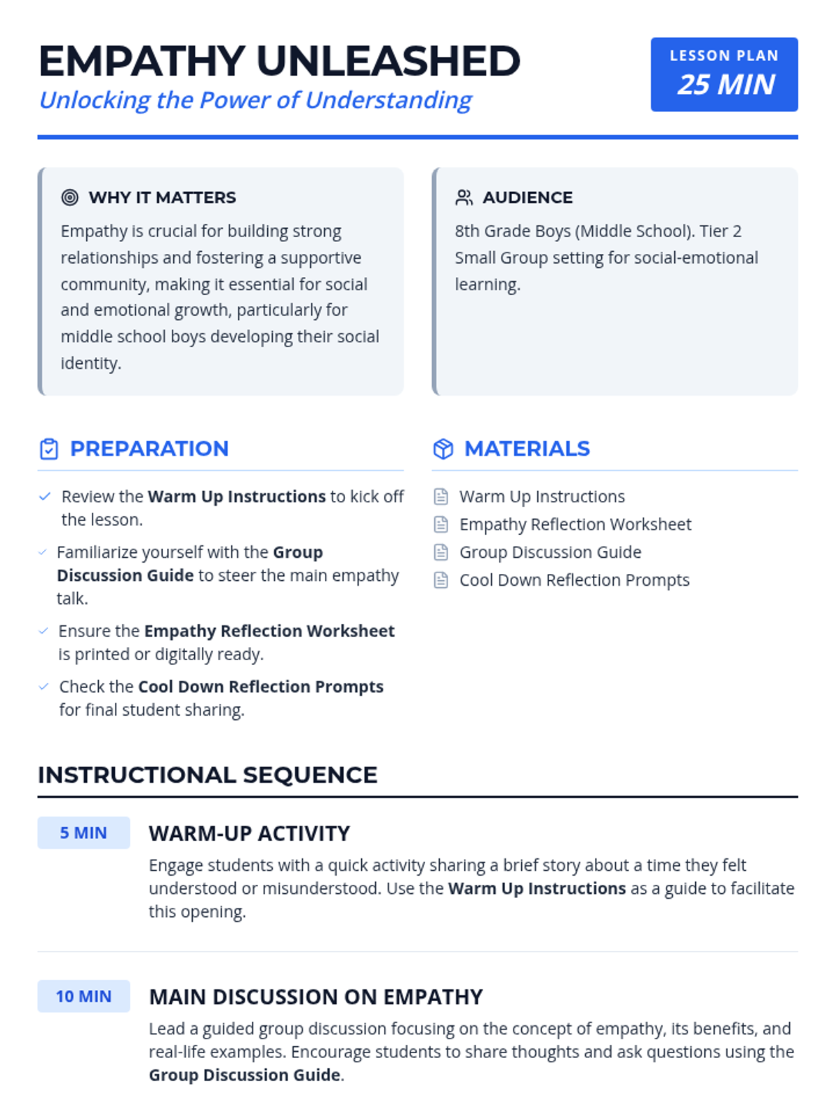 A Tier 2 group lesson for 8th-grade boys to explore and practice empathy through interactive stories, discussions, and personal reflection. Designed for a 25-minute session to build stronger social connections and community.