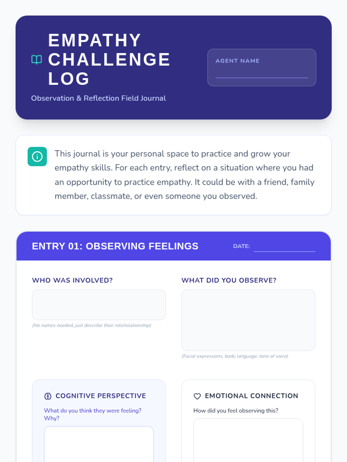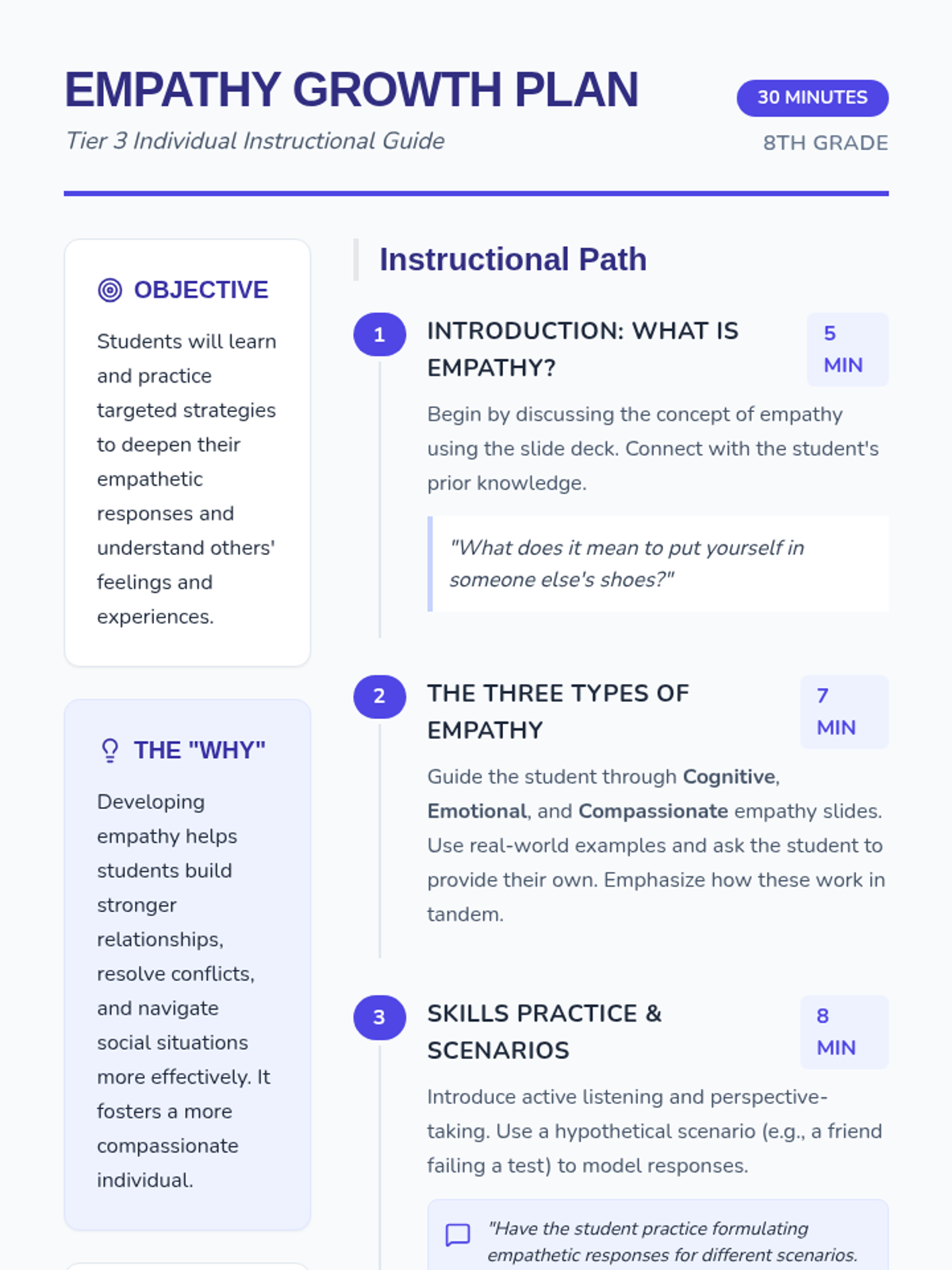 A targeted 30-minute individual session for 8th-grade students to develop cognitive, emotional, and compassionate empathy through guided practice and reflection.