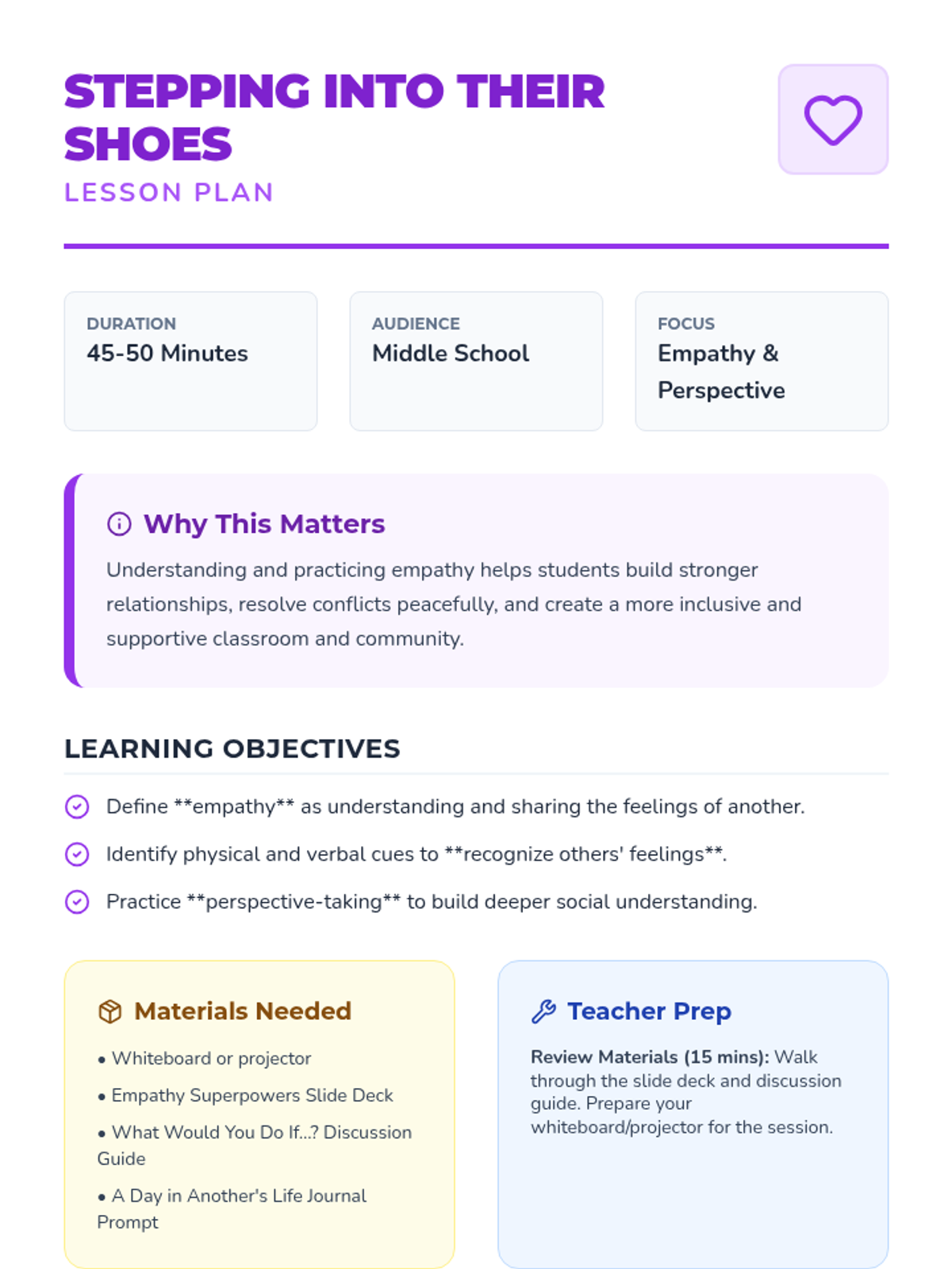 This lesson guides middle school students through the concept of empathy, using the metaphor of 'superpowers' to help them recognize emotions and practice perspective-taking for a more inclusive classroom.