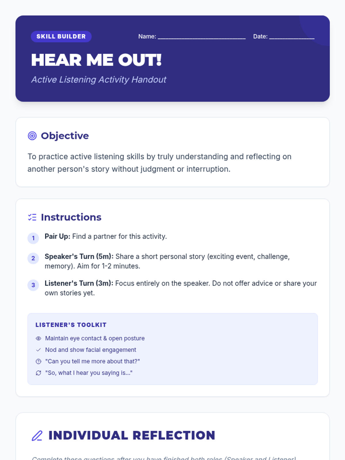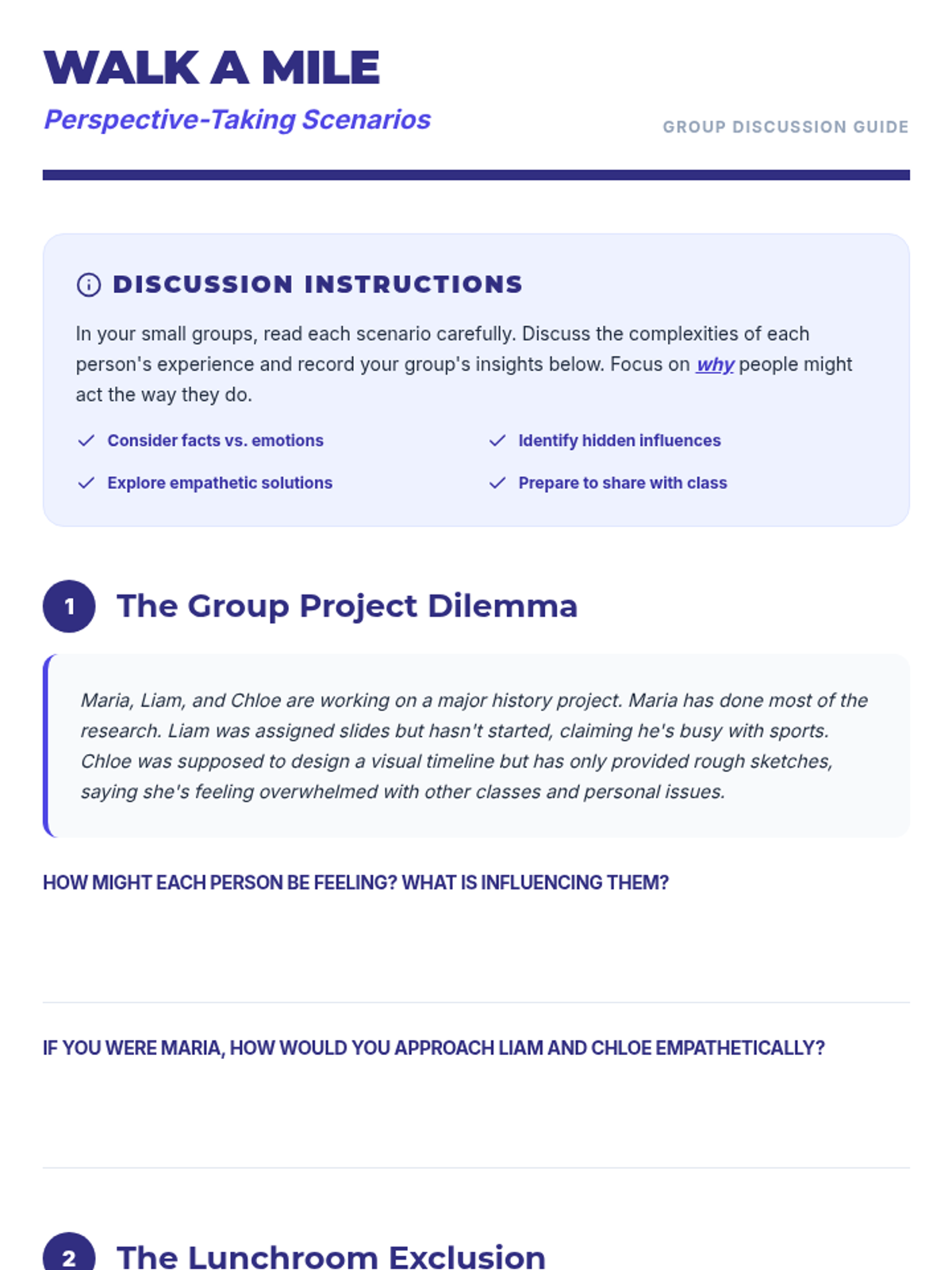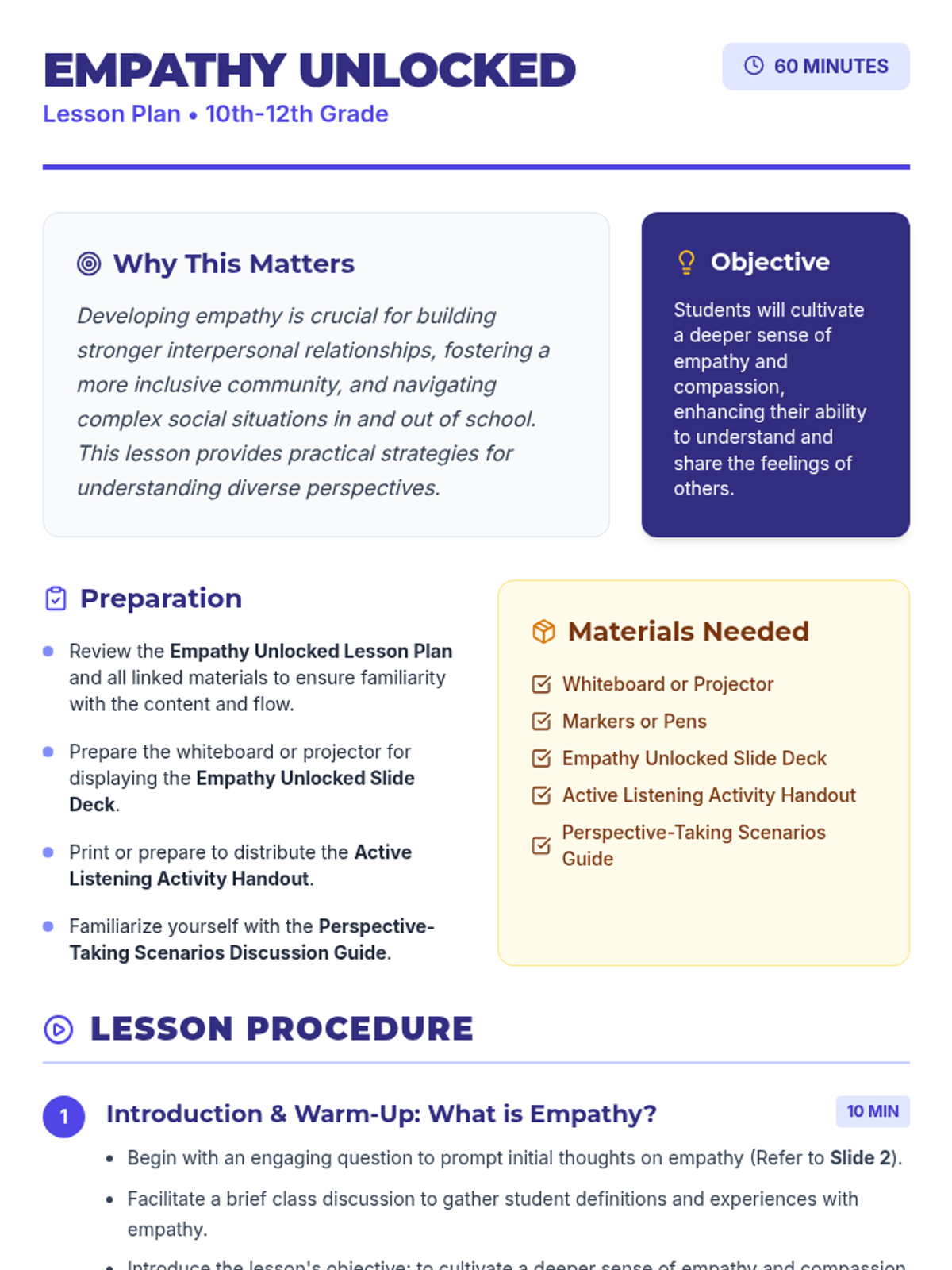 A 60-minute session for high schoolers focused on developing empathy through active listening and perspective-taking exercises. Students will learn to recognize diverse viewpoints and practice skills that foster a more inclusive community.