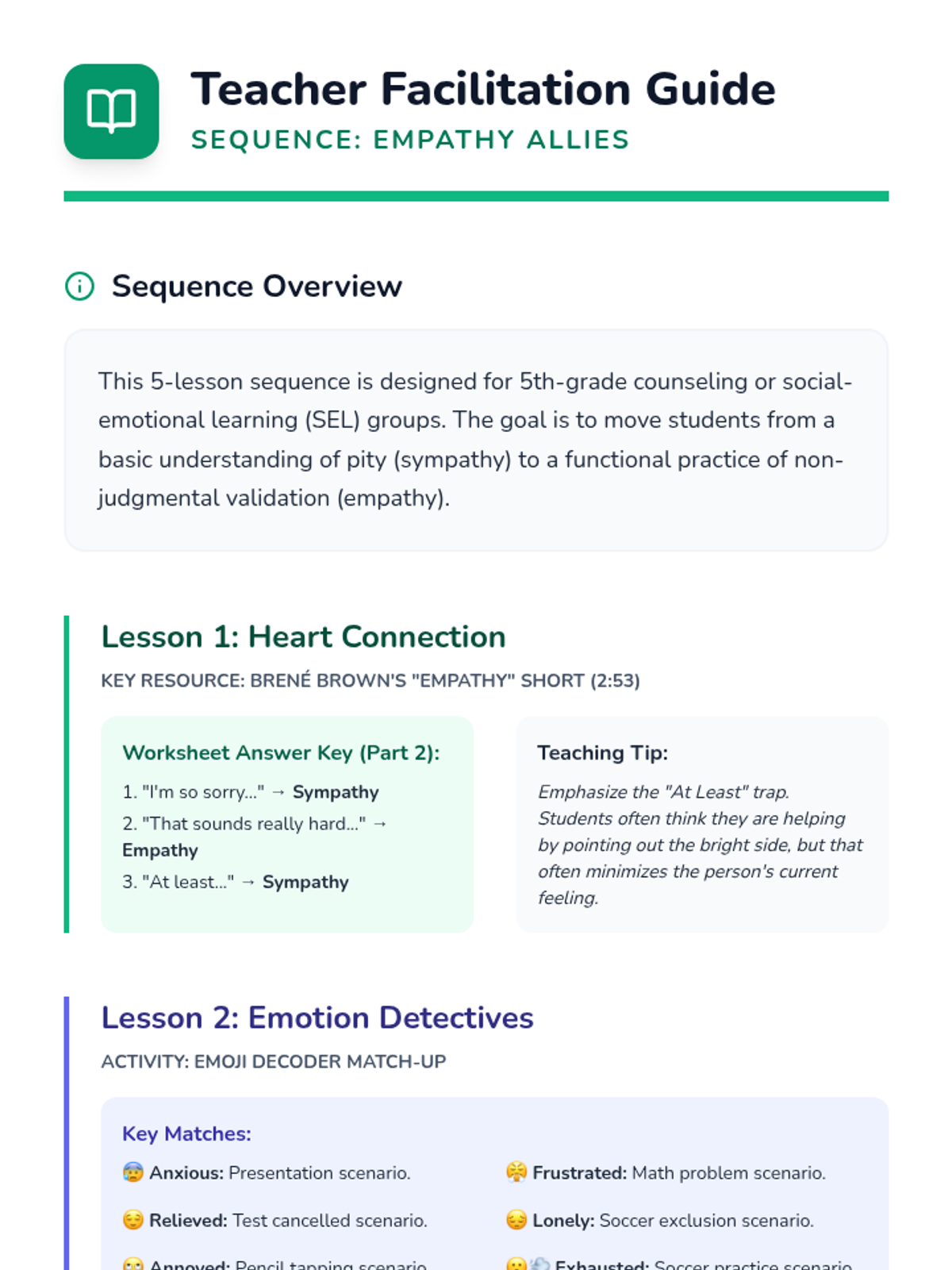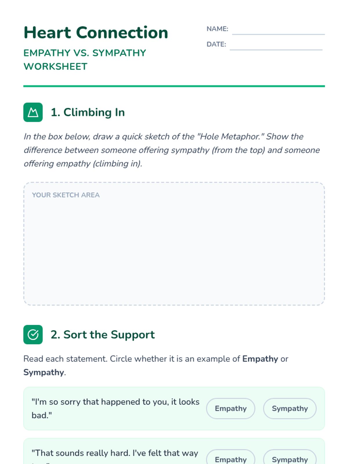 Students explore the fundamental difference between empathy and sympathy. They learn that empathy is about connecting with others' feelings by 'climbing into the hole' with them, rather than looking down with pity.