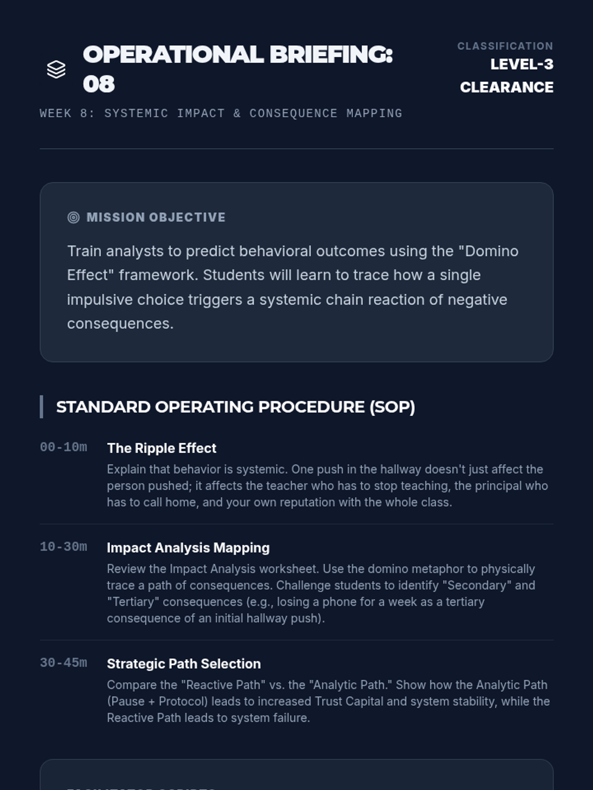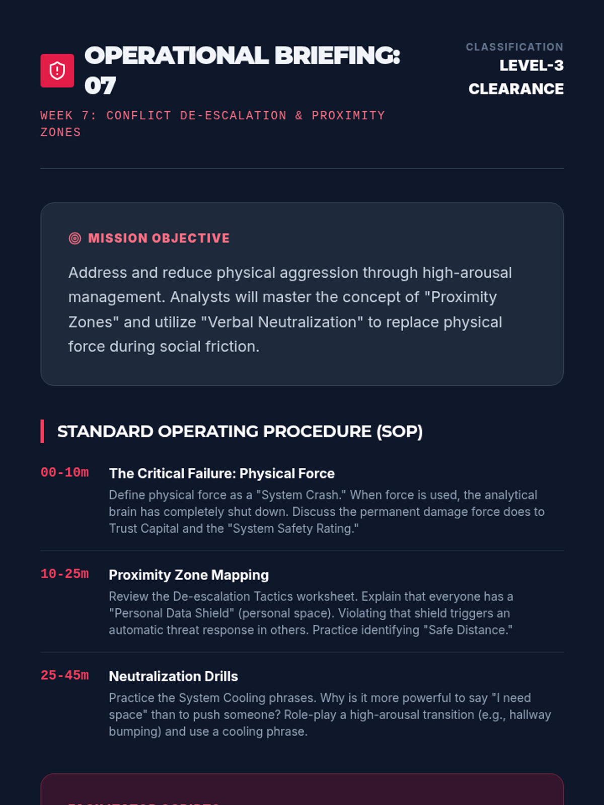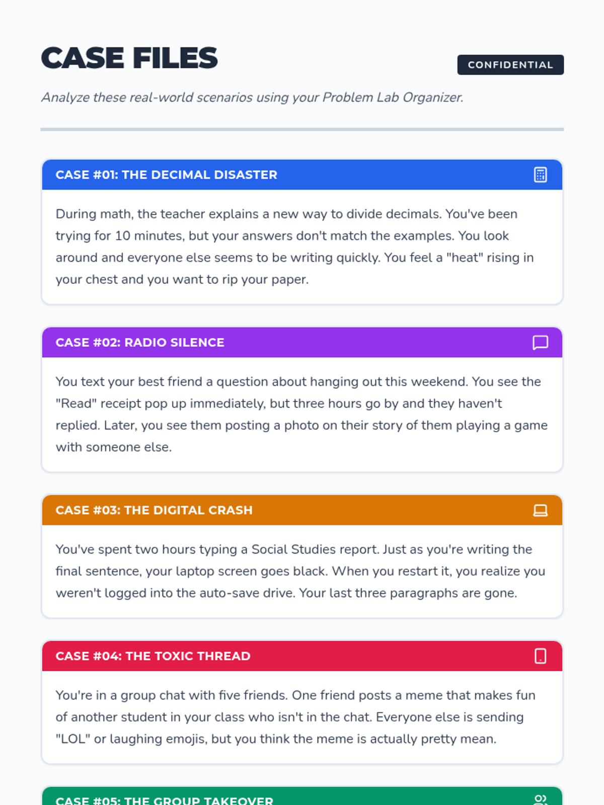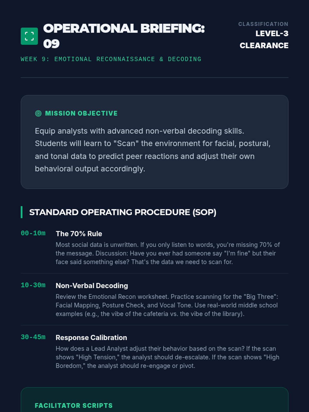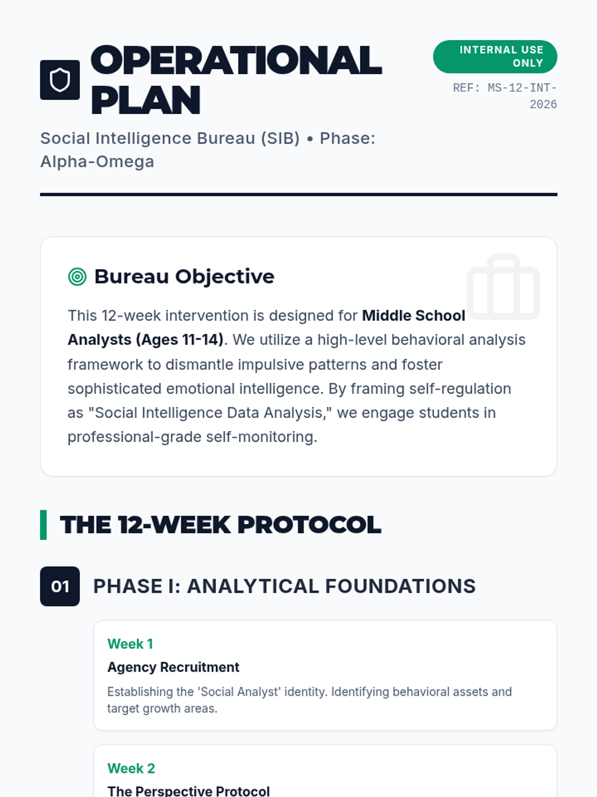 A social-emotional learning lesson designed for students with trauma backgrounds and impulse control challenges. It focuses on 'Scene Scanning'—assuming positive intent and dissecting social interactions through a detective-style lens to improve perspective-taking and reduce reactivity.